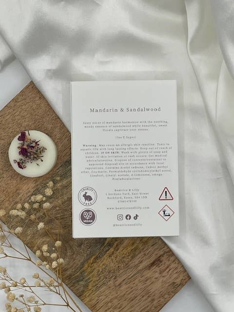 Escape to the spa and find your inner peace with the our calming Mandarin & Sandalwood botanical wax melts. Zesty notes of mandarin harmonise with the soothing, woody essence of sandalwood while beautiful, sweet florals captivate your senses. Each wax melt is delicately decorated with dried botanicals.