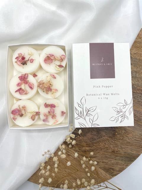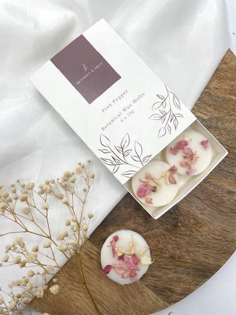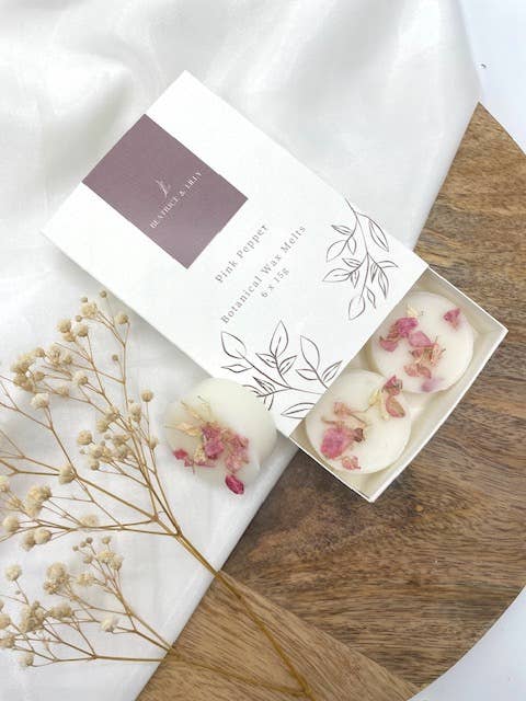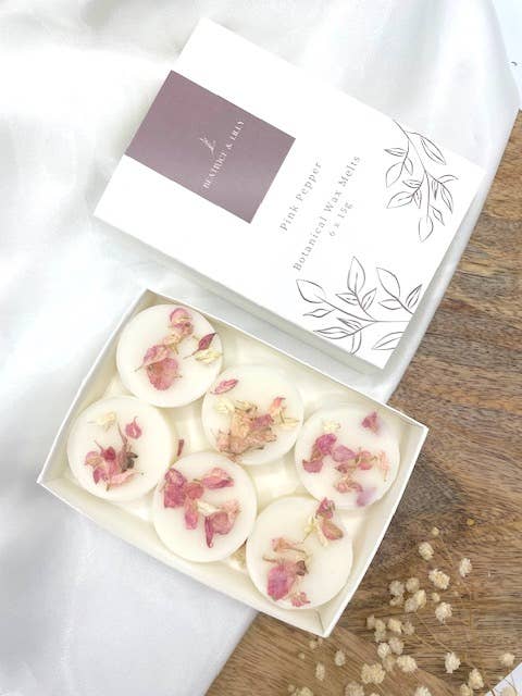 A luxury gift box comes nestled with 6 beautifully scented botanical wax melts in the scent Pink Pepper. All of our wax melts are handmade in small batches.