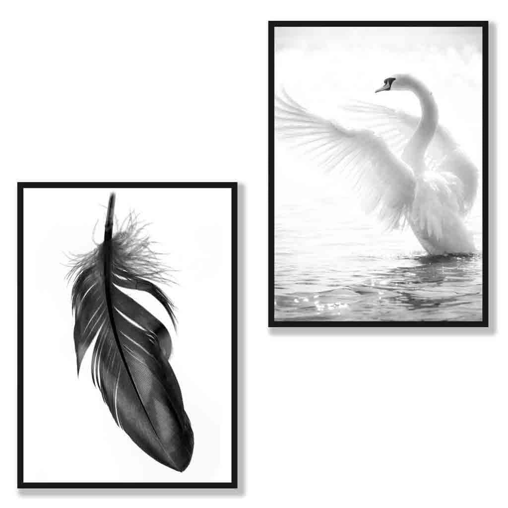 A Set of 2 Black and White Photographs of Black Feather and Swan Wall Art Prints
