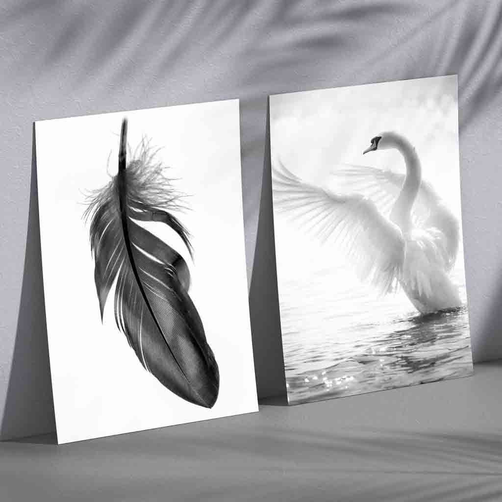 Set of 2 Black and White Feather and Swan Wall Art Prints