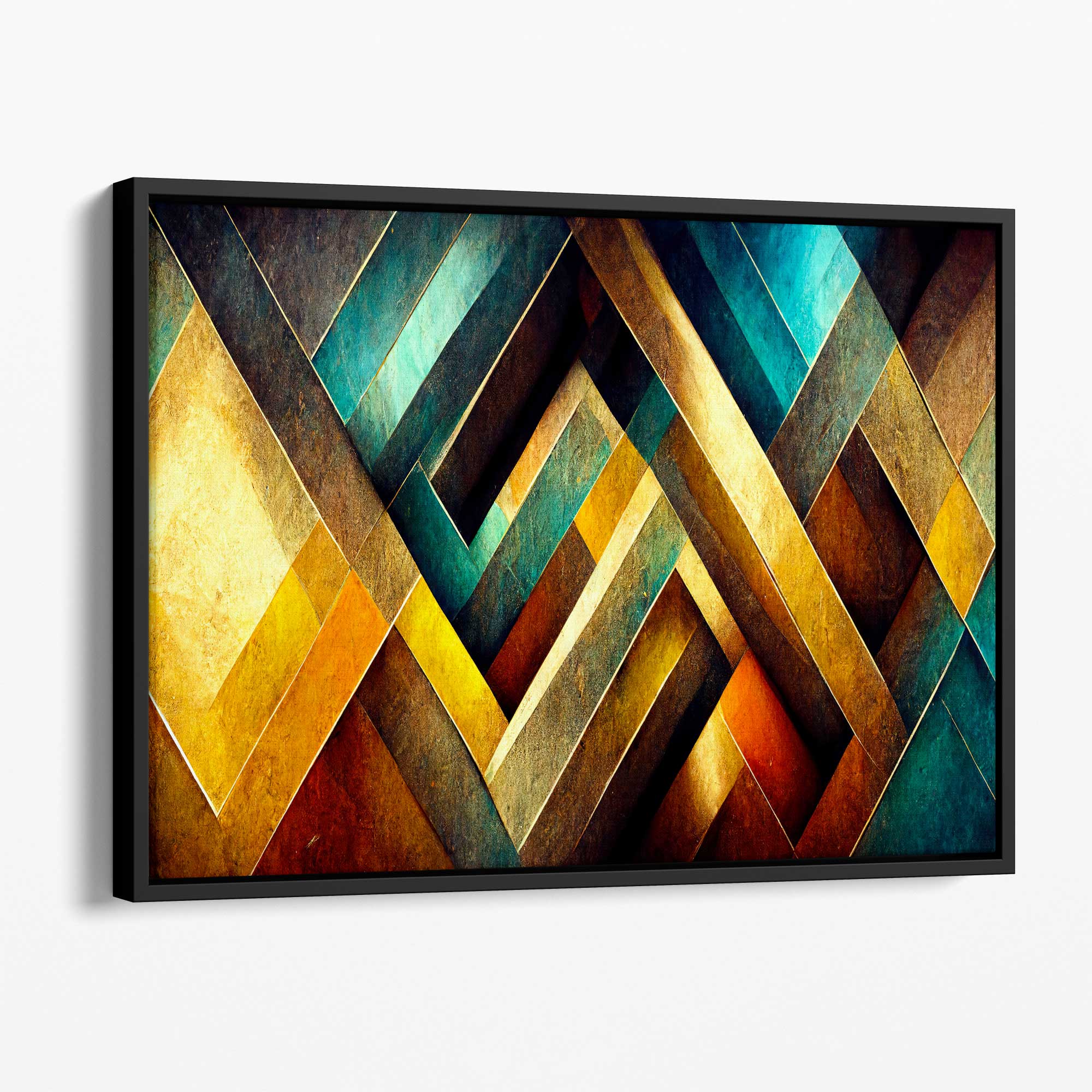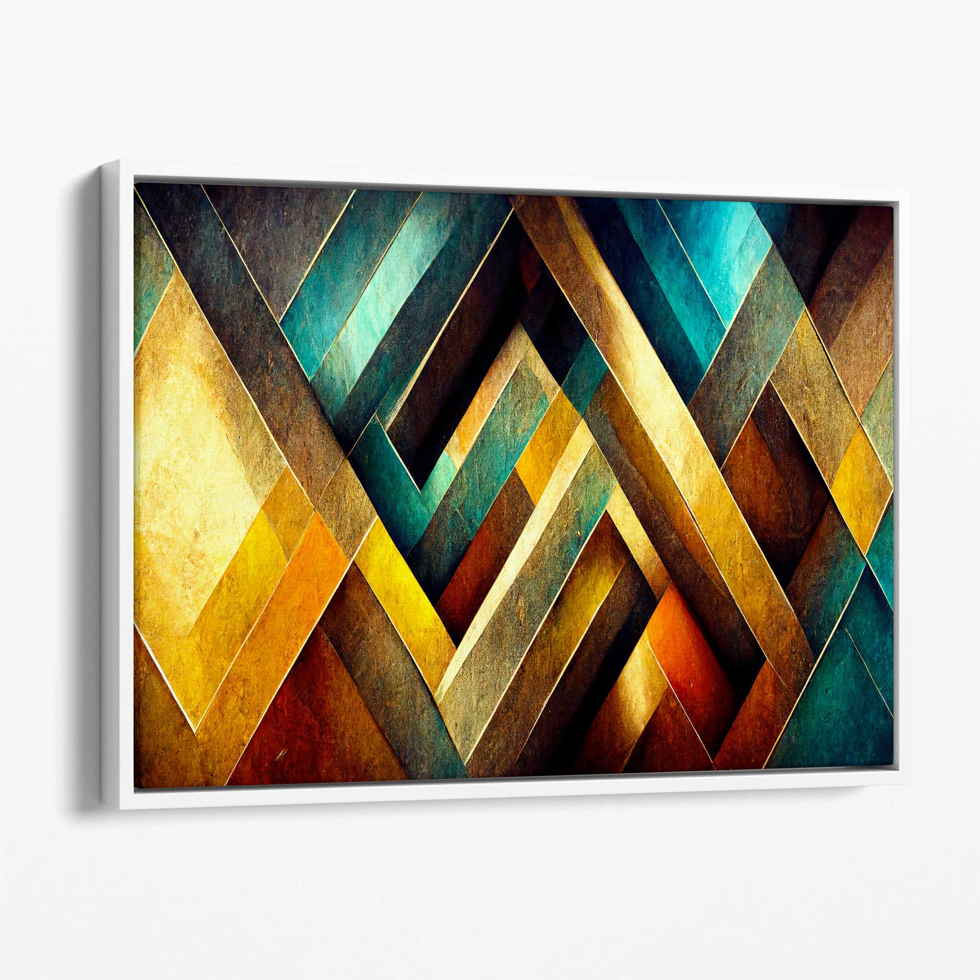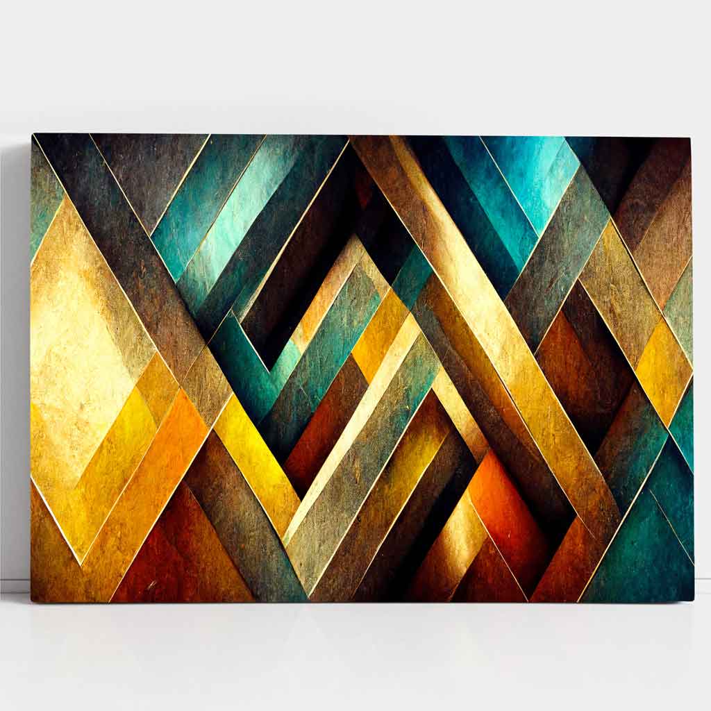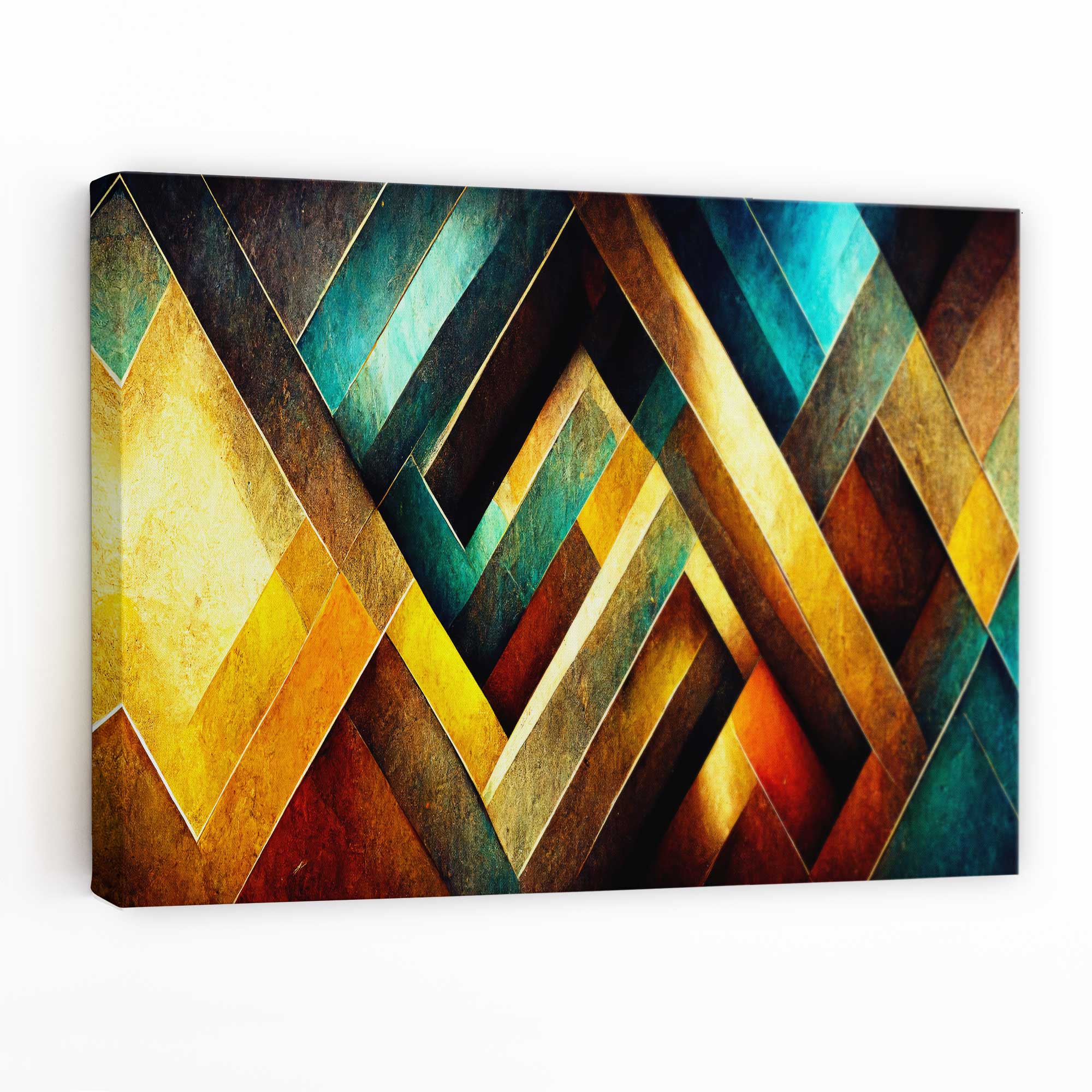 Part of our Abstract Collection, this Canvas Wall Art print features an original mixed media work featuring distressed herringbone tiles in shades of Aqua Blue, Yellow Orange and Red.