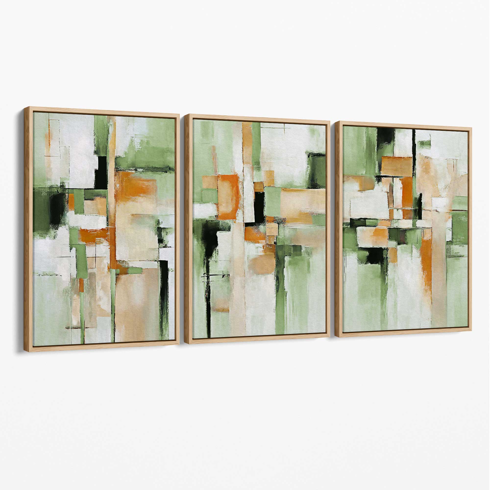 Abstract Sage Green and Orange Set of 3 Canvas Wall Art