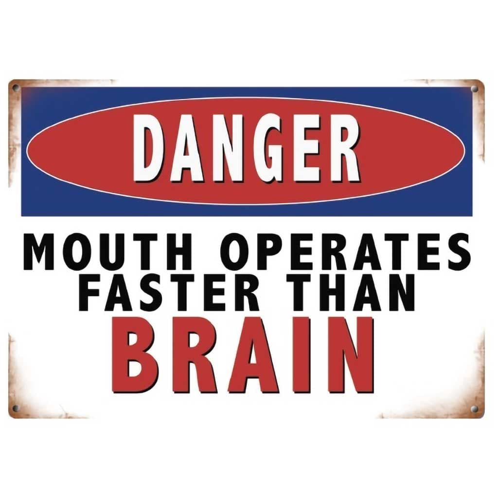 A vintage and distressed metal sign with a comical 'DANGER!' quote