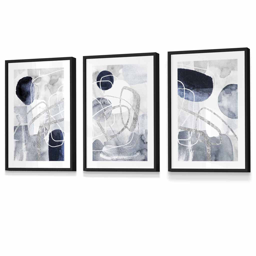 Bring a modern touch to your home with our Abstract Blue and Silver ( Not Foil) Shapes Set of 3 Framed Art Prints. The fluid lines add depth and sophistication to any room. Elevate your space with these eye-catching prints that will surely inspire creativity and style.