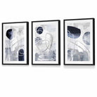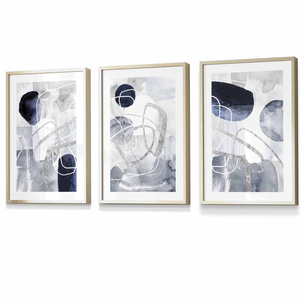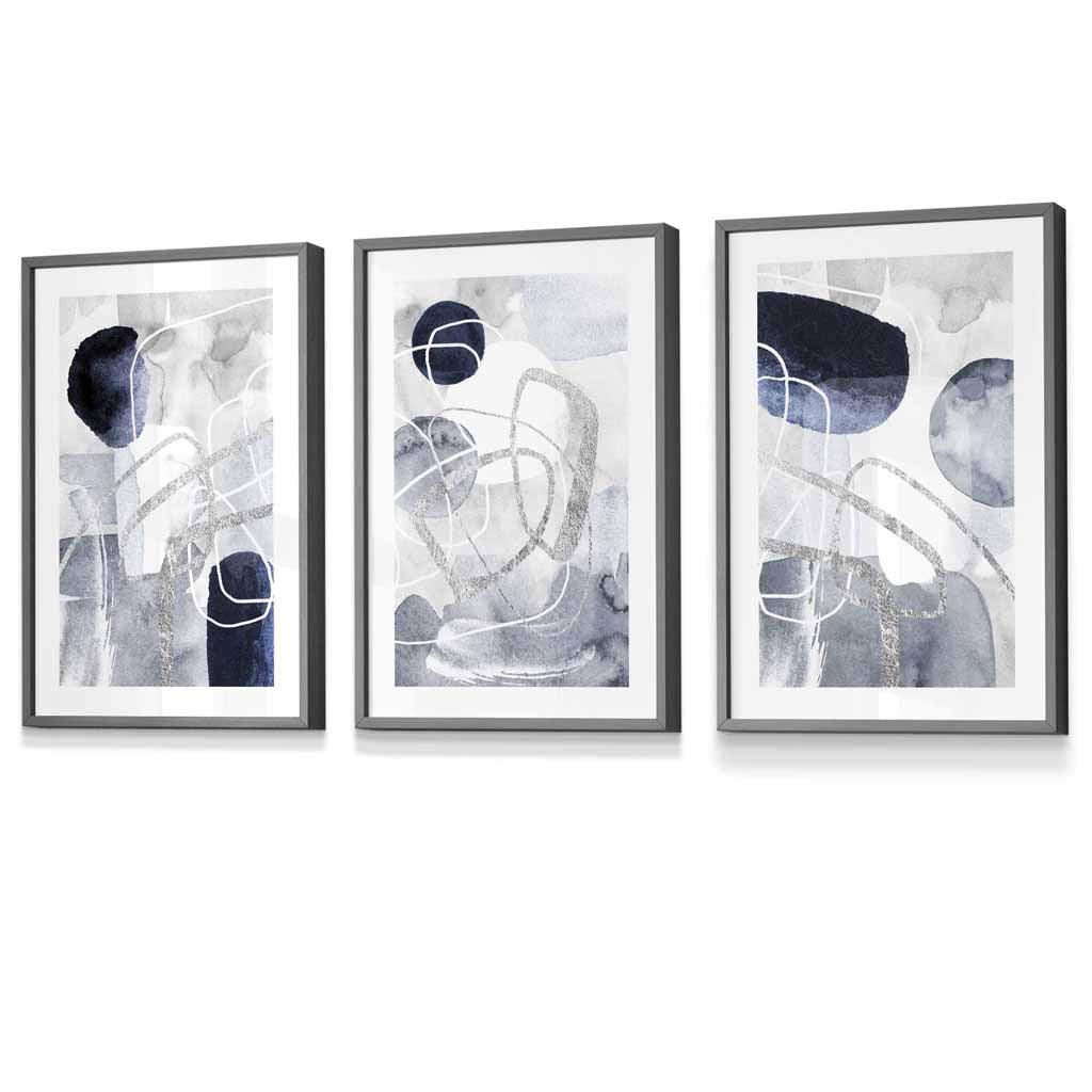Abstract Blue and Silver Shapes Set of 3 Framed Art Prints