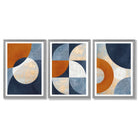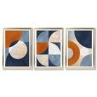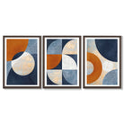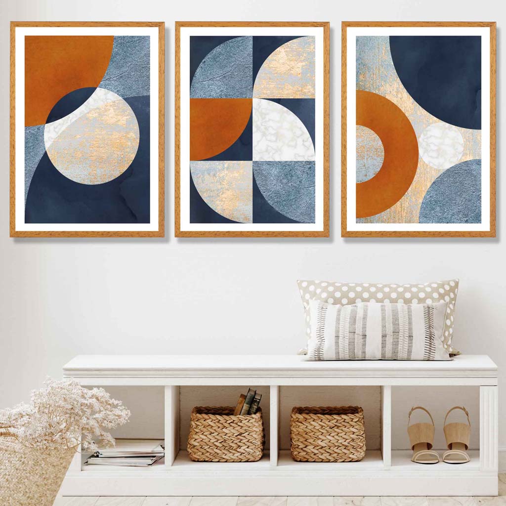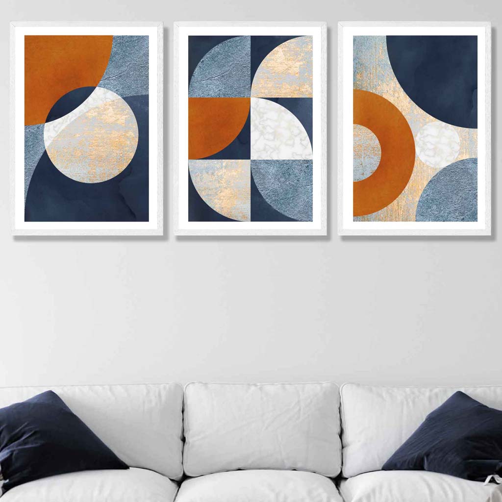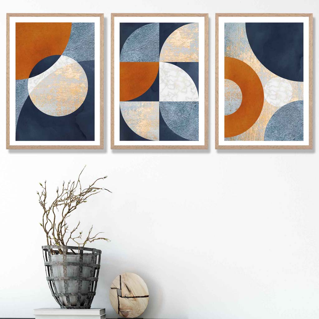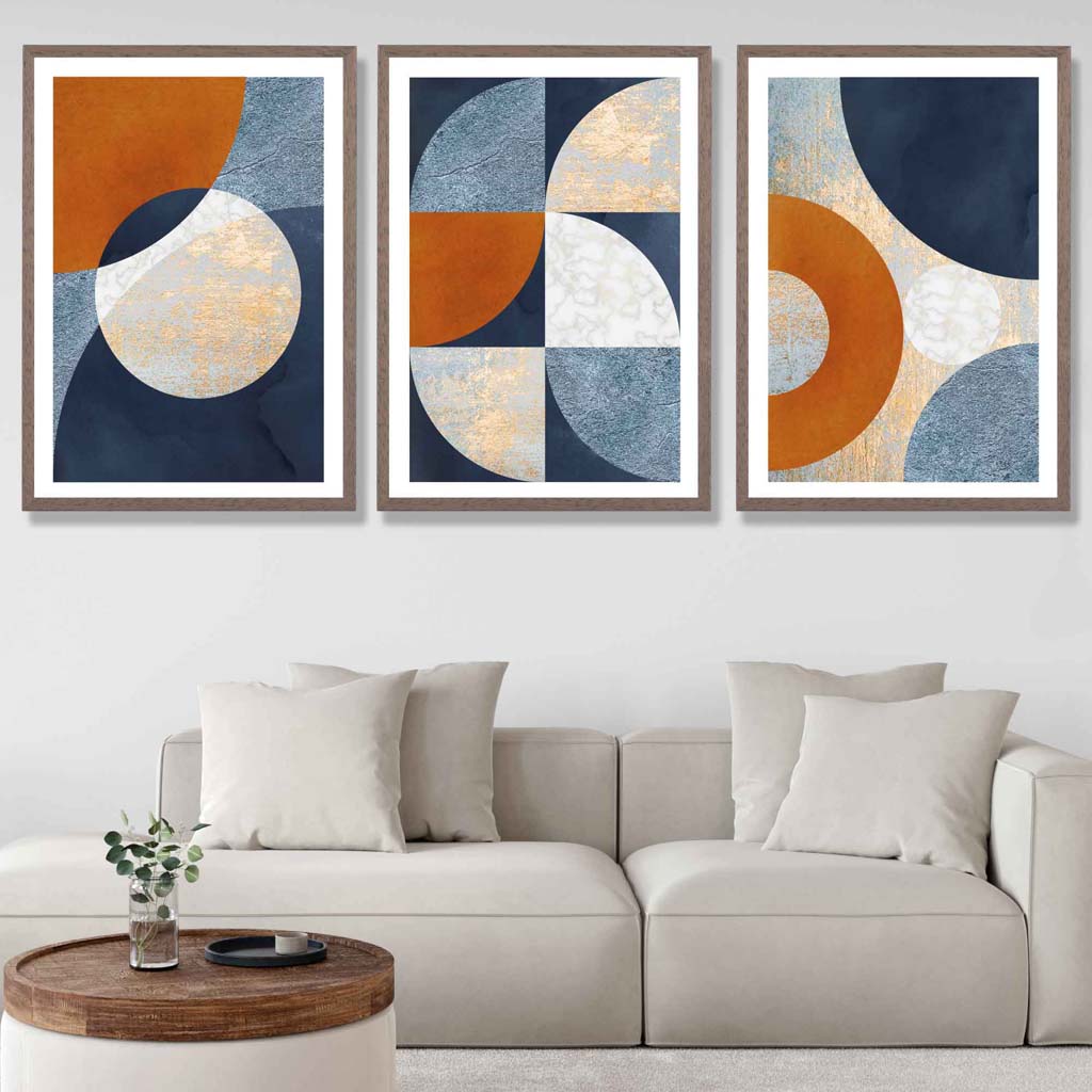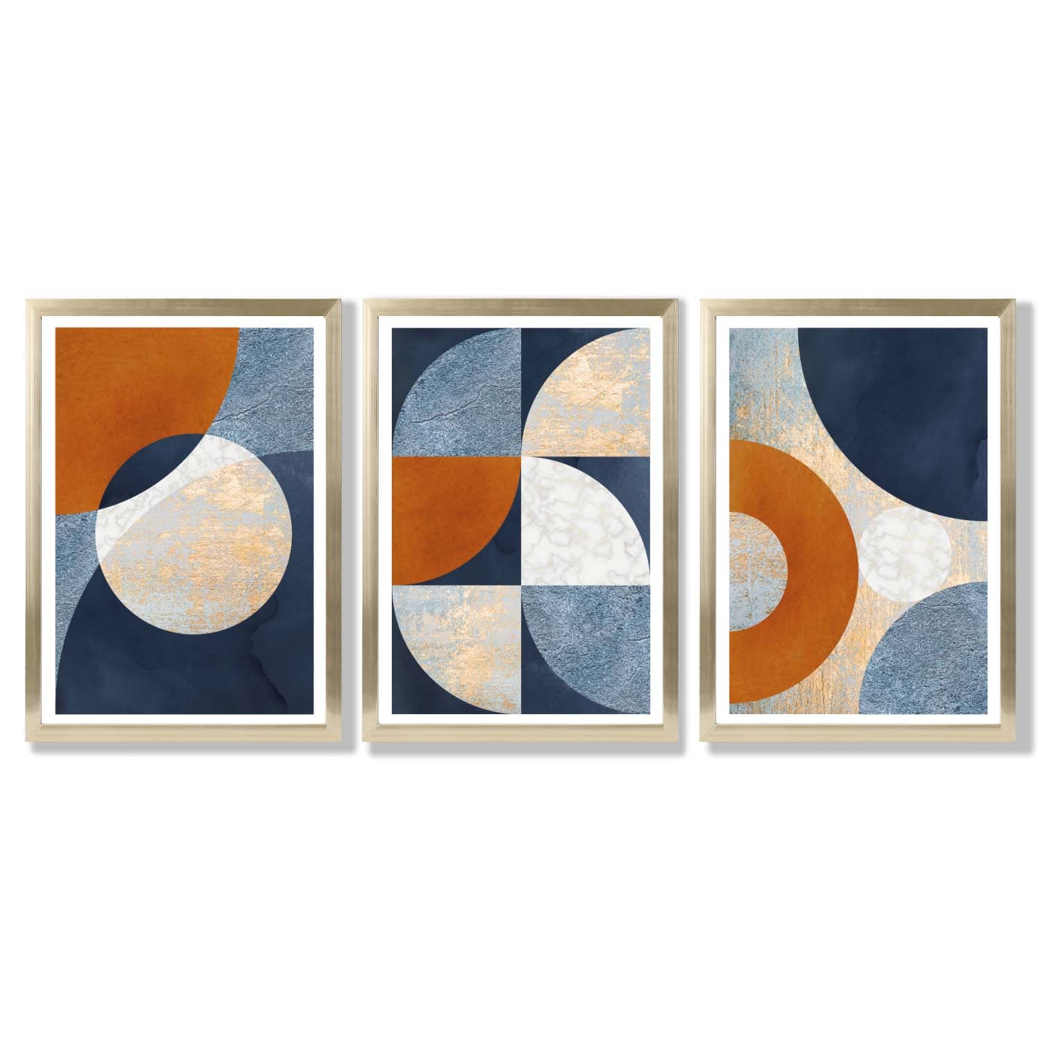Abstract GEOMETRIC Set of 3 Navy Blue Orange and Gold Framed Art Prints