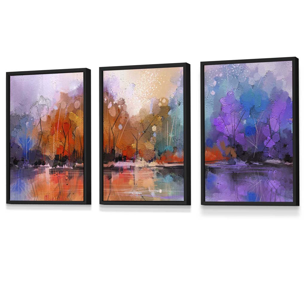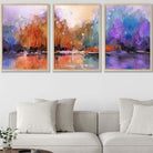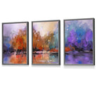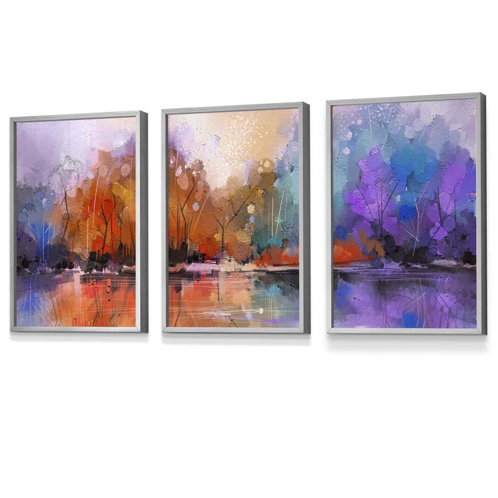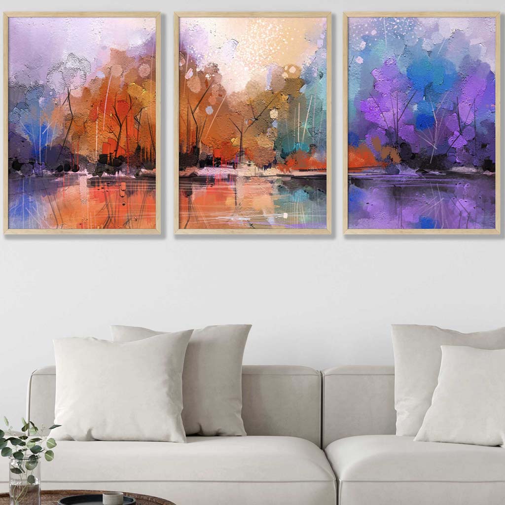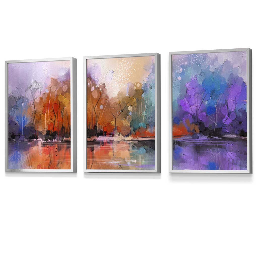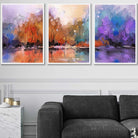Introducing our stunning Abstract Nature Collection - this Set of 3 Wall Art showcases a trio of panels from the captivating "Violet Dawn" painting, depicting a peaceful Forest Lake Sunrise. Infused with vibrant hues of Violet, Purple, and Orange, these mixed media prints are a must-have for any art lover.
