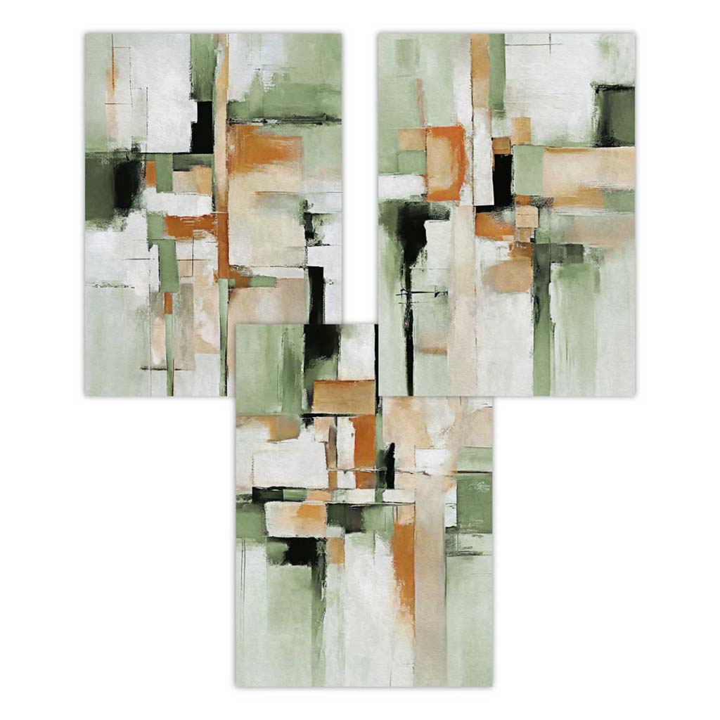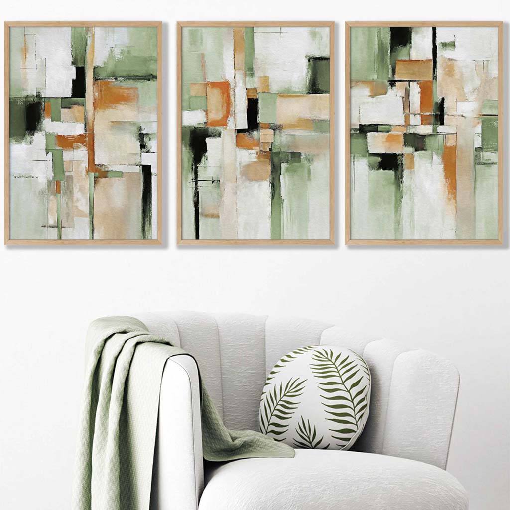 Abstract Sage Green and Orange Set of 3 Wall Art Prints