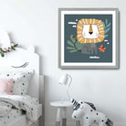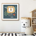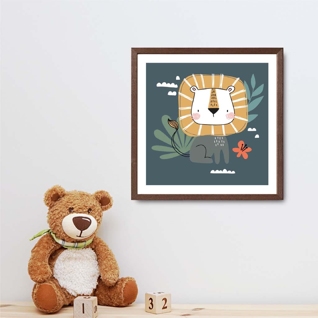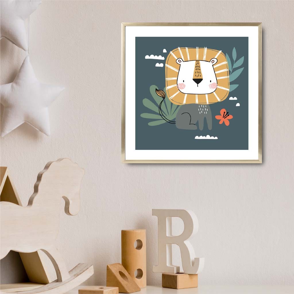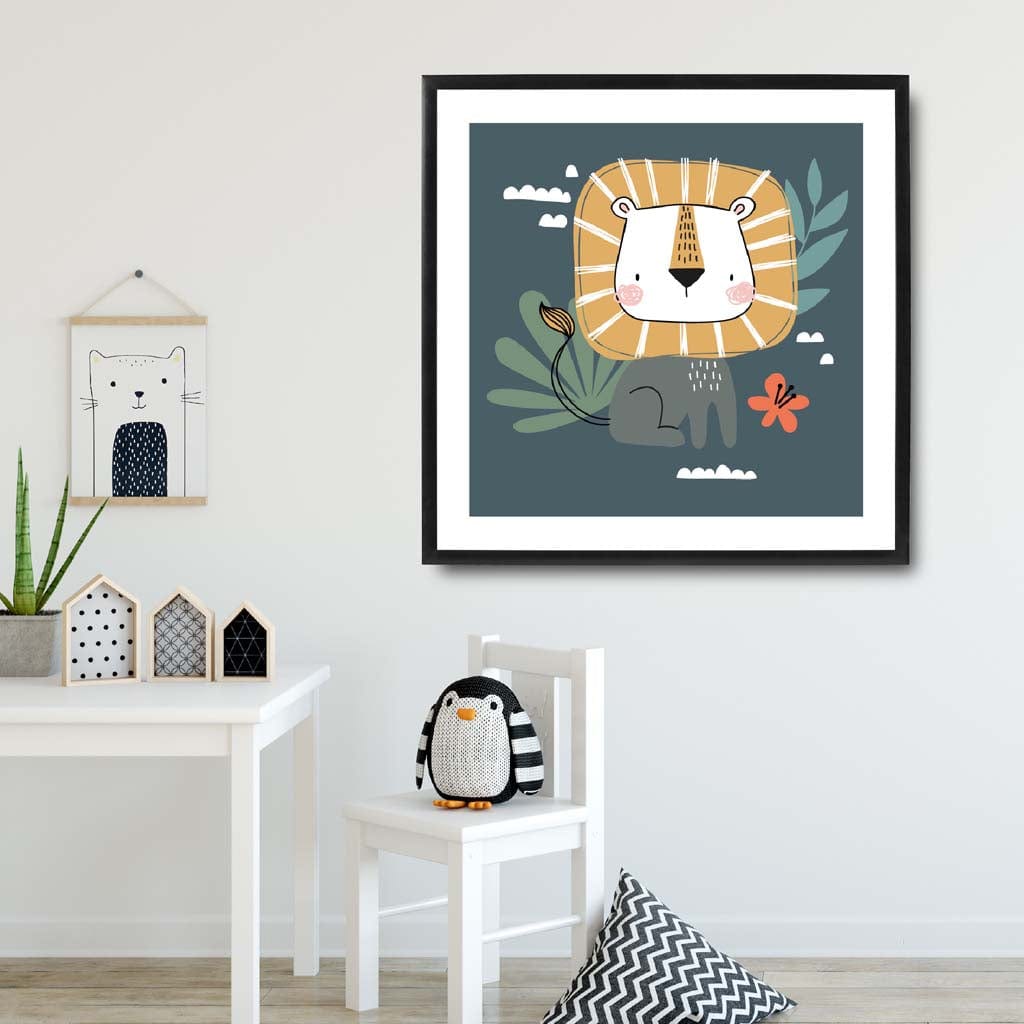 Liven up your kid's room with our Cute Lion FRAMED Print on Teal Blue Jungle Wall Art. This playful print features a quirky lion in a vibrant teal blue jungle backdrop. Spruce up your little one's room with this fun and unique piece that will bring a smile to their face every time they see it.