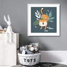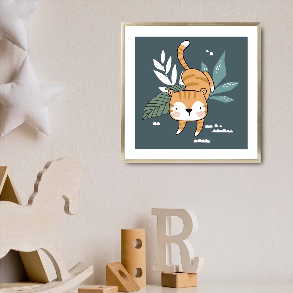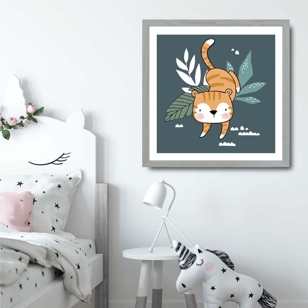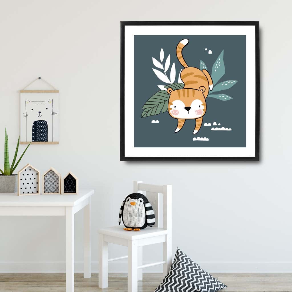 Add a playful touch to your child's room with our Cute Tiger FRAMED Print on Teal Blue Jungle Wall Art! Featuring a charming tiger in a vibrant jungle setting, this print will inspire your little one's imagination. The perfect addition to any kid's room decor. (Roarsome!)