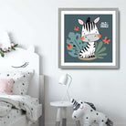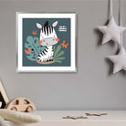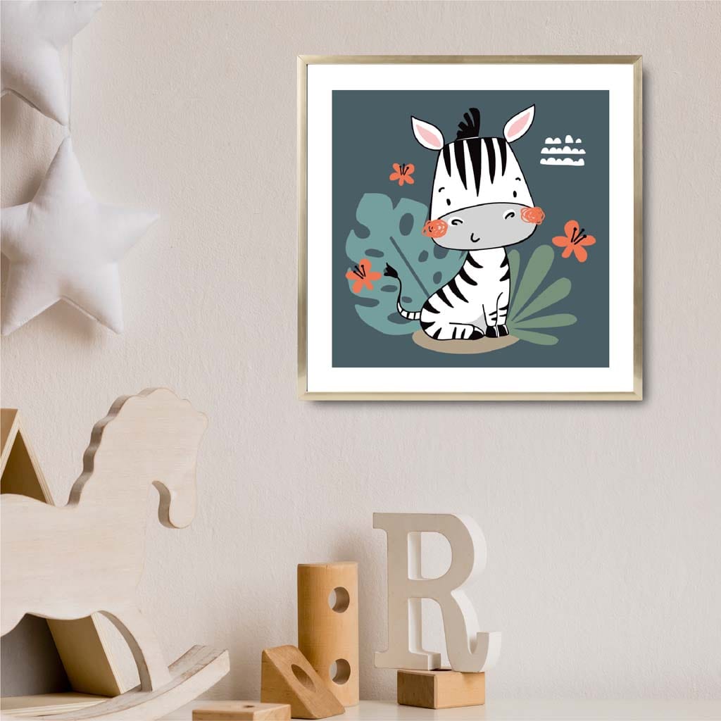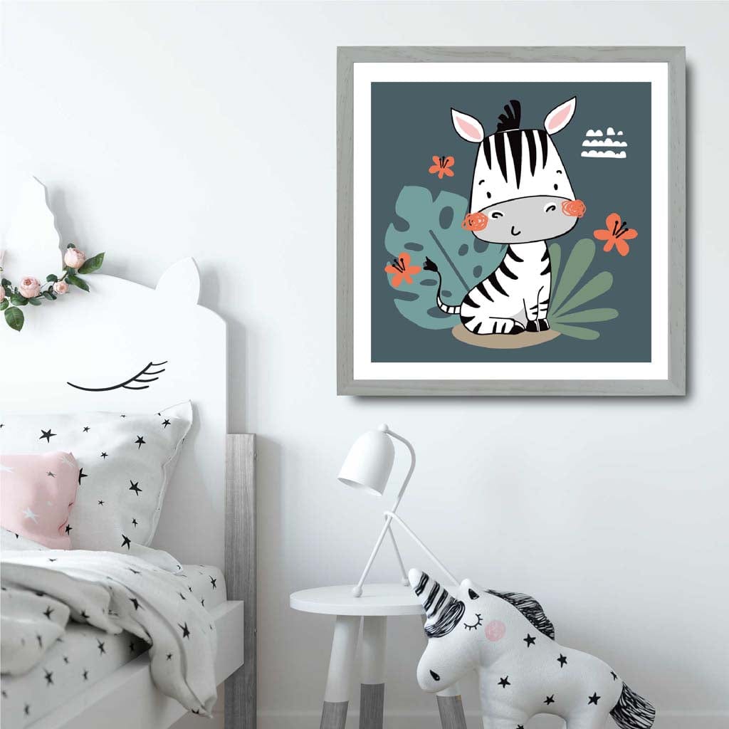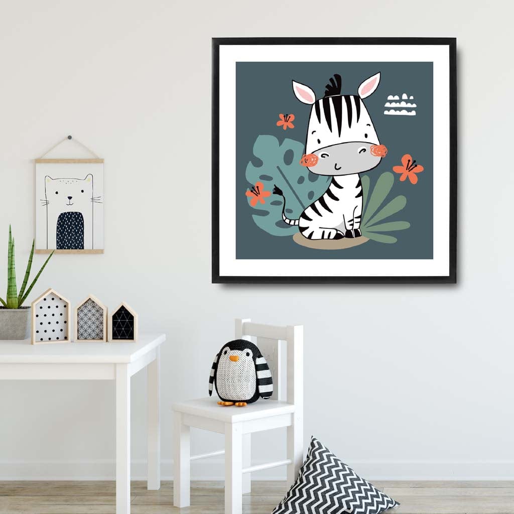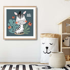 Cute Zebra FRAMED Print on Teal Blue Jungle Kids Wall Art