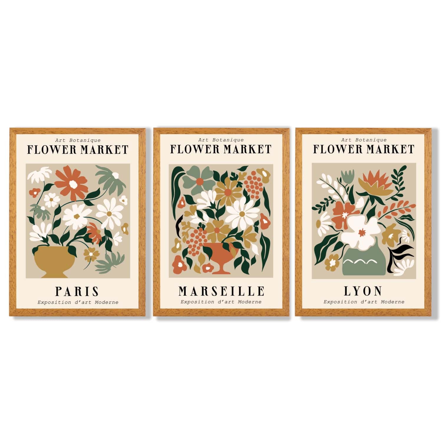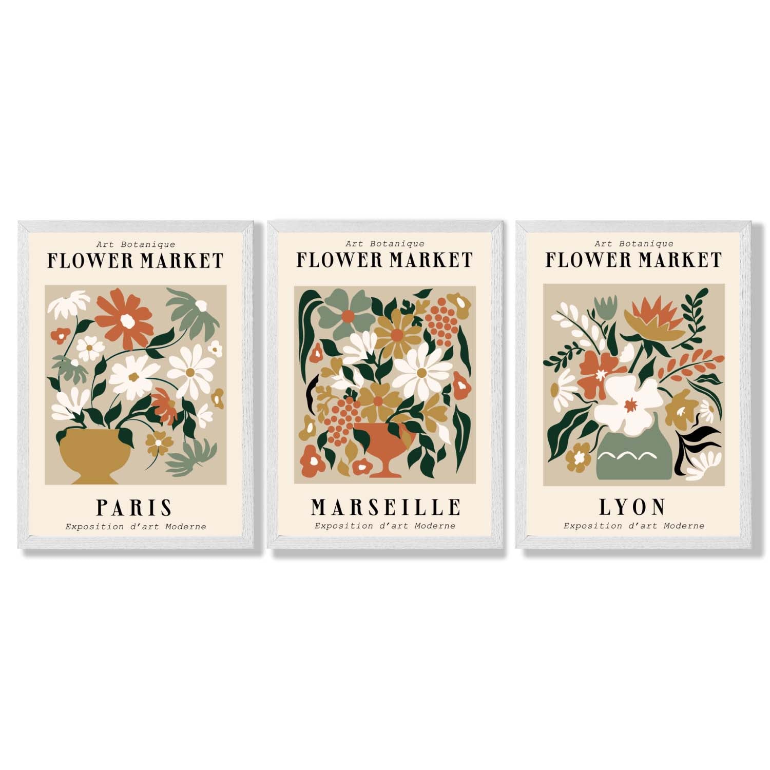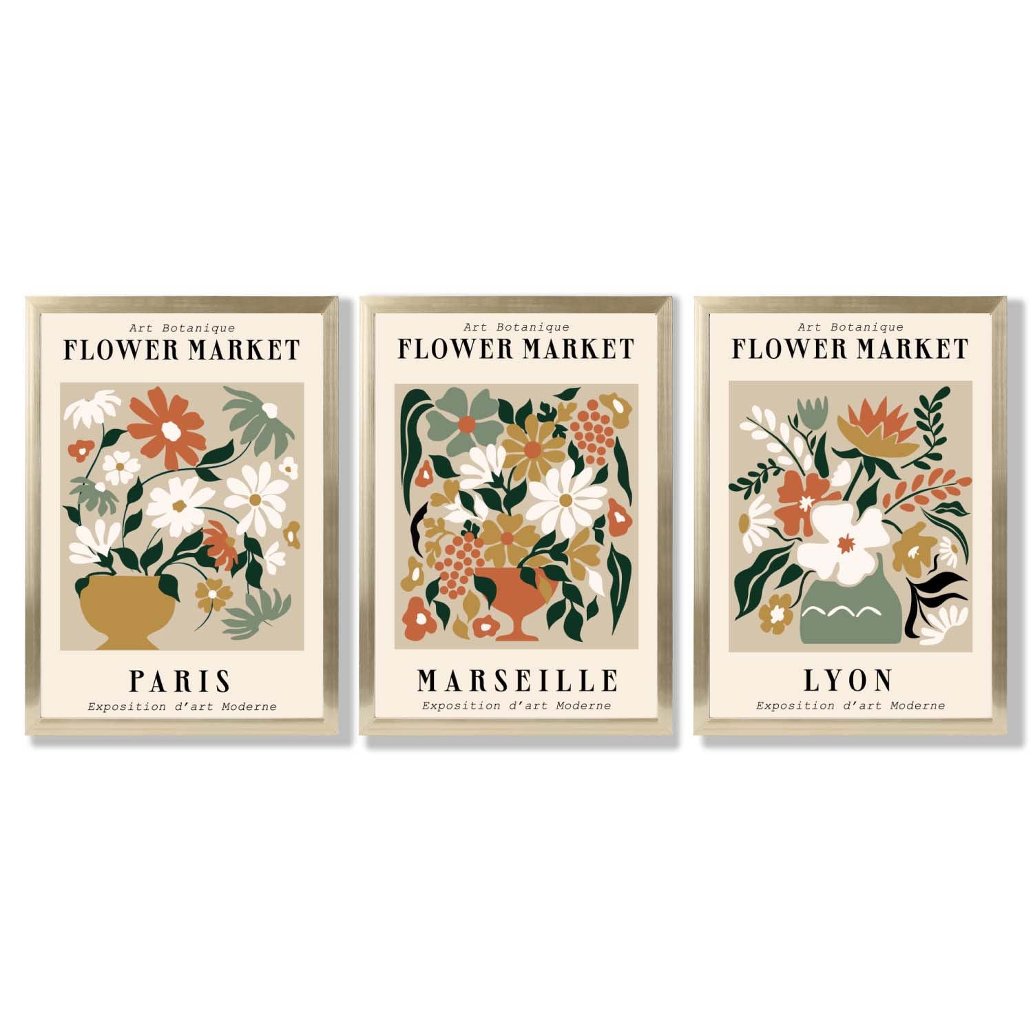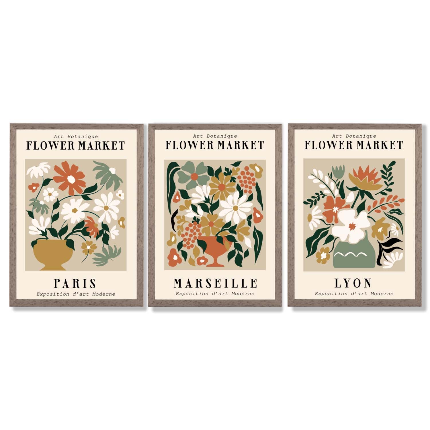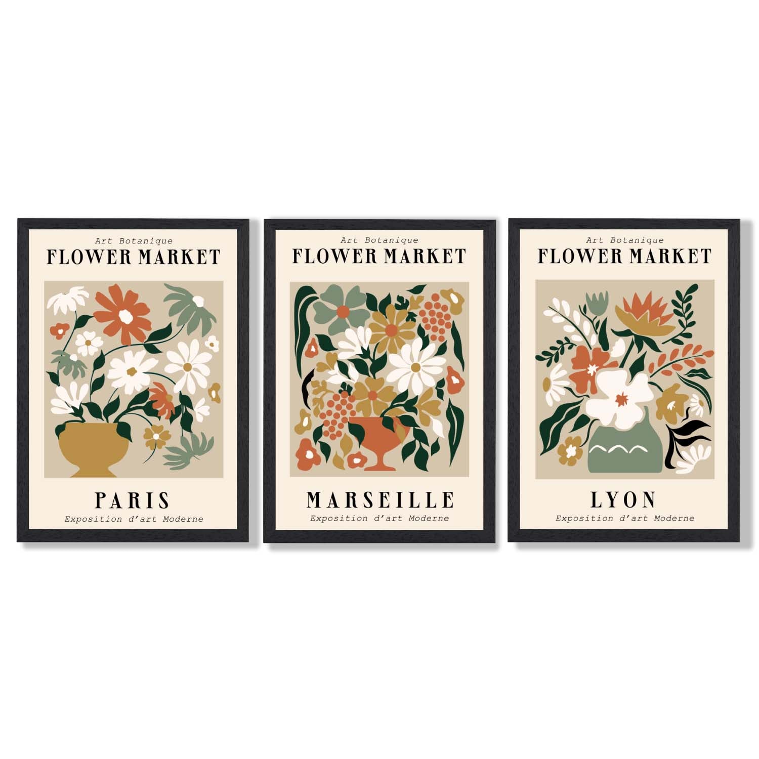 Be part of our timeless Vintage Style Flower Market Collection with this Set of 3 Floral Posters in mid-century Modern shades of Beige, Sage Green and Orange. Complete with Paris, Marseille and Lyon's classic Exhibition styling, these Wall Art Prints are perfect for Boho, Modern and Minimalist decor.