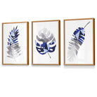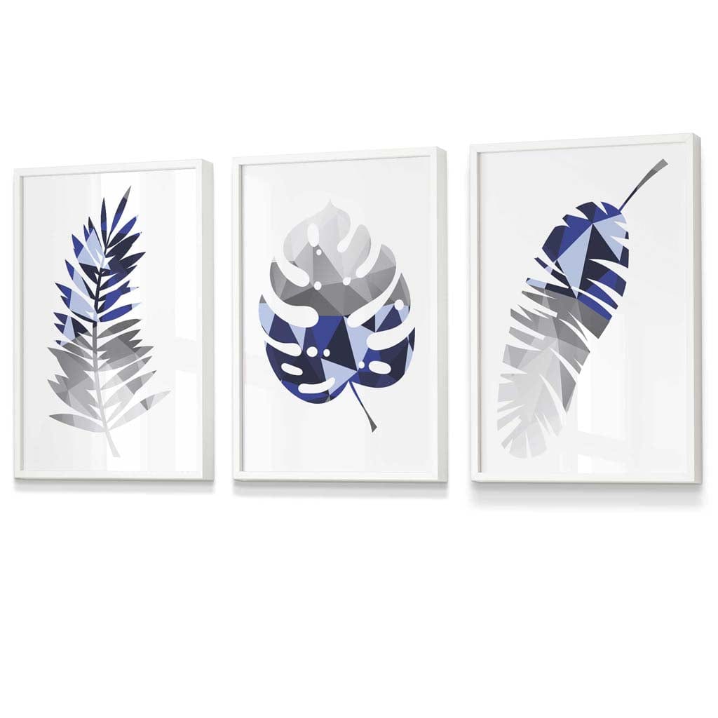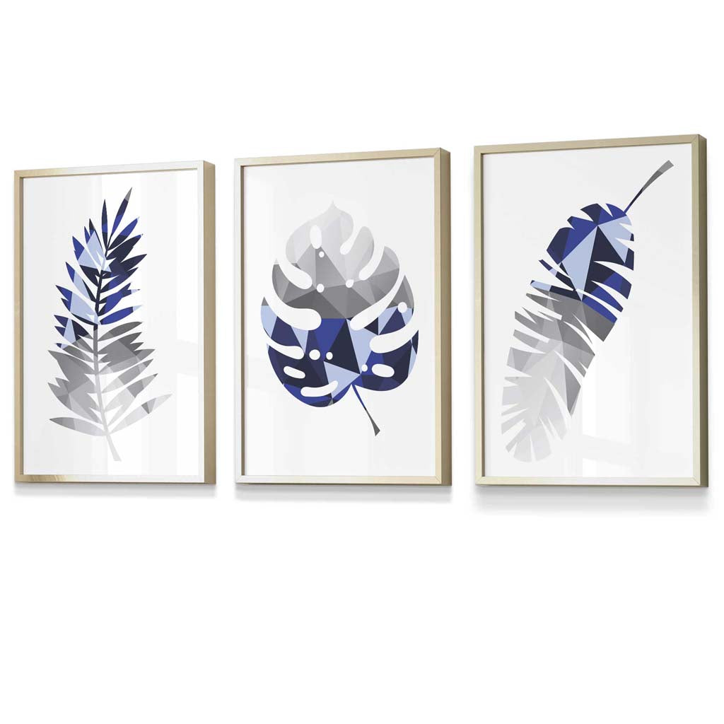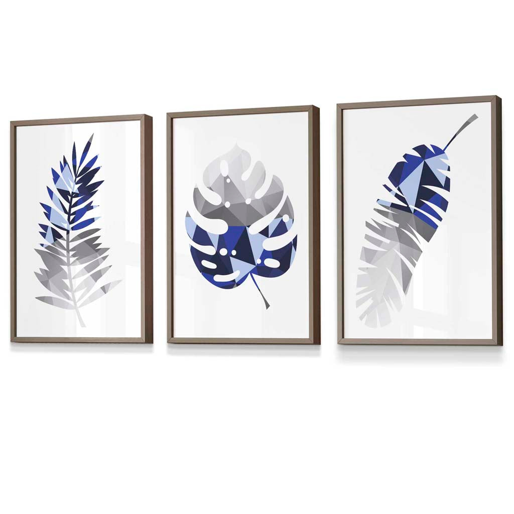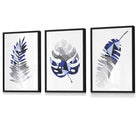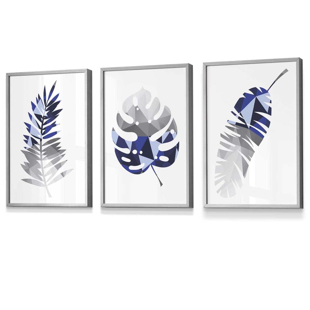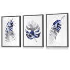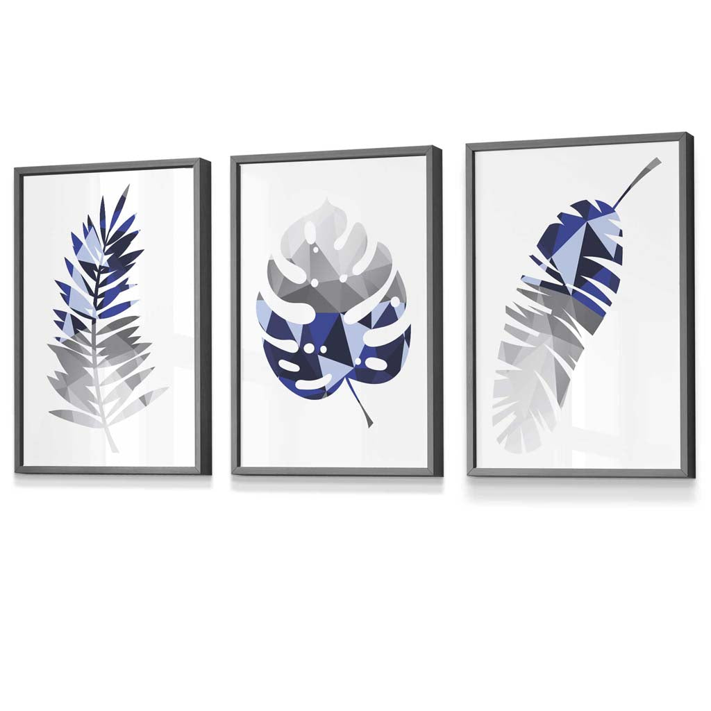 GEOMETRIC Set of 3 Blue & Grey Tropical Leaves Framed Prints