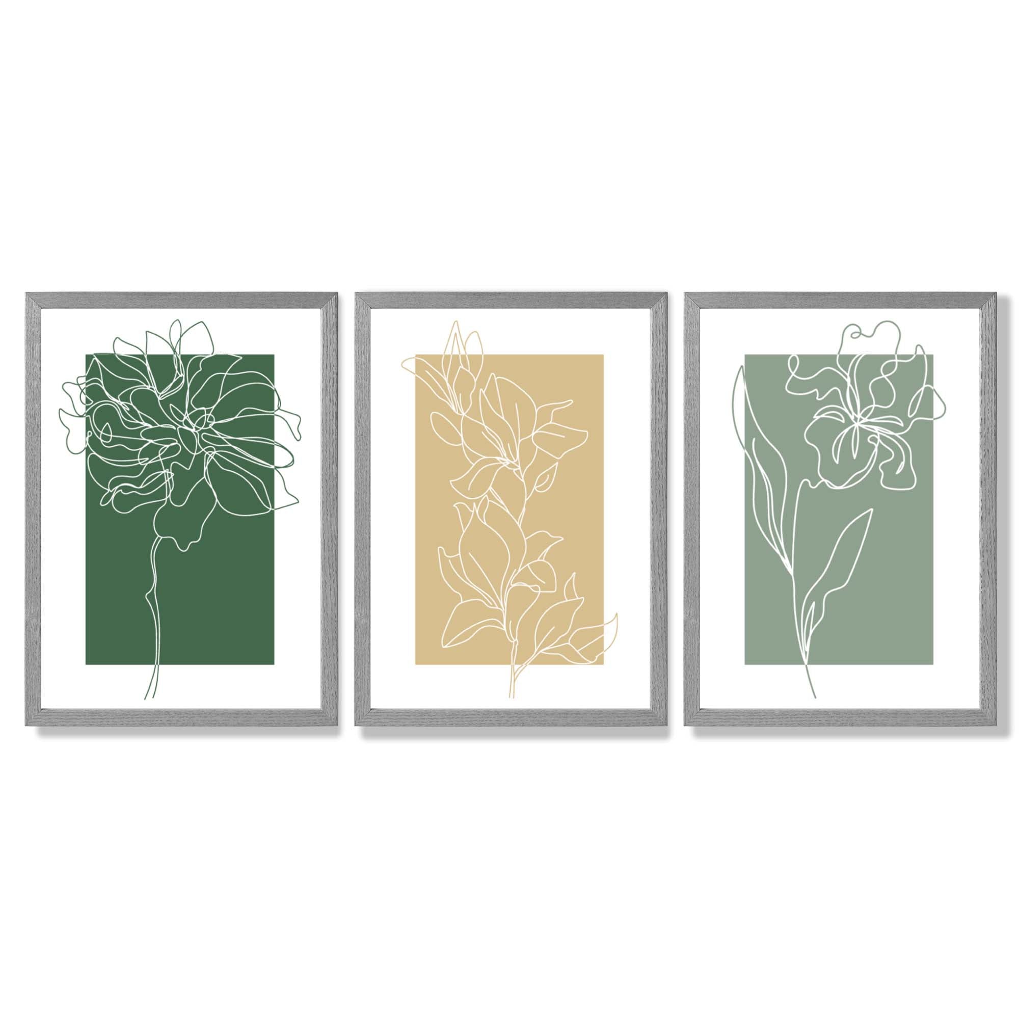 This set of three framed art prints features minimalistic floral sketches in a sophisticated palette of forest green, ochre yellow, and sage green. Each print combines clean, delicate lines with muted tones to bring a subtle yet elegant botanical touch to your decor. Ideal for adding refined natural accents to both modern and classic interiors.