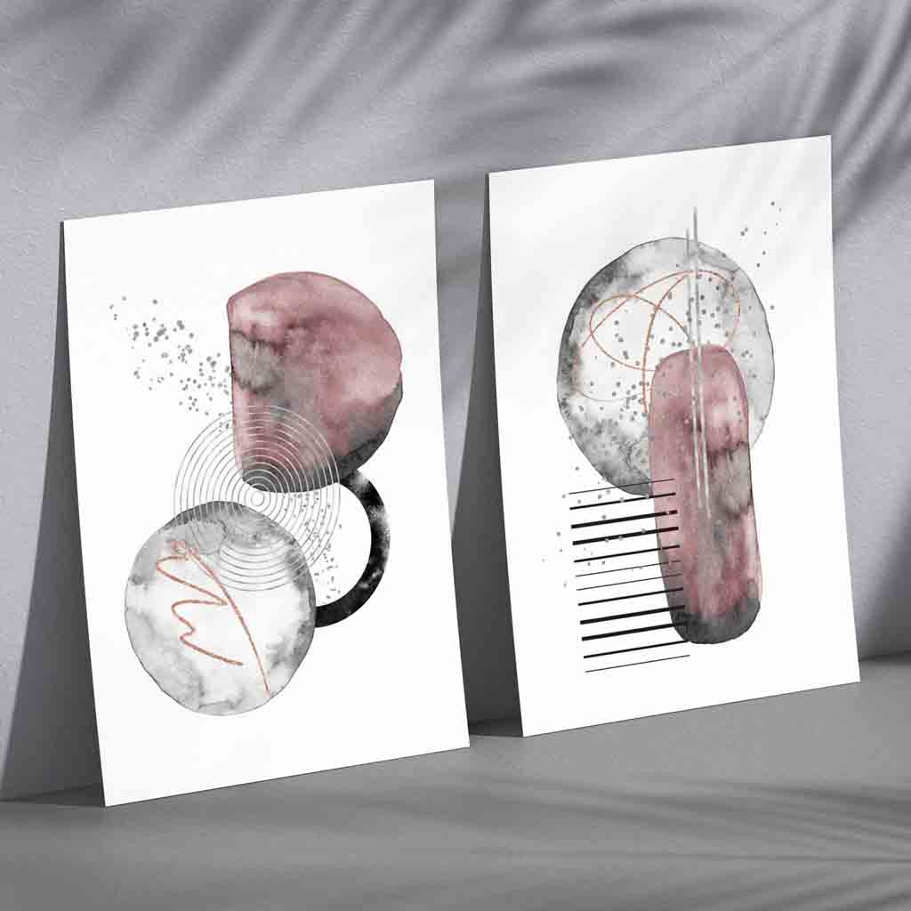 A Set of 2 Blush Pink, Grey and Silver (Not Foil) Wall Art prints in an abstract geometric style. Bring a touch of sophisticated beauty to any room with these beautiful wall art prints. An effortless way to create a luxurious and inviting atmosphere.