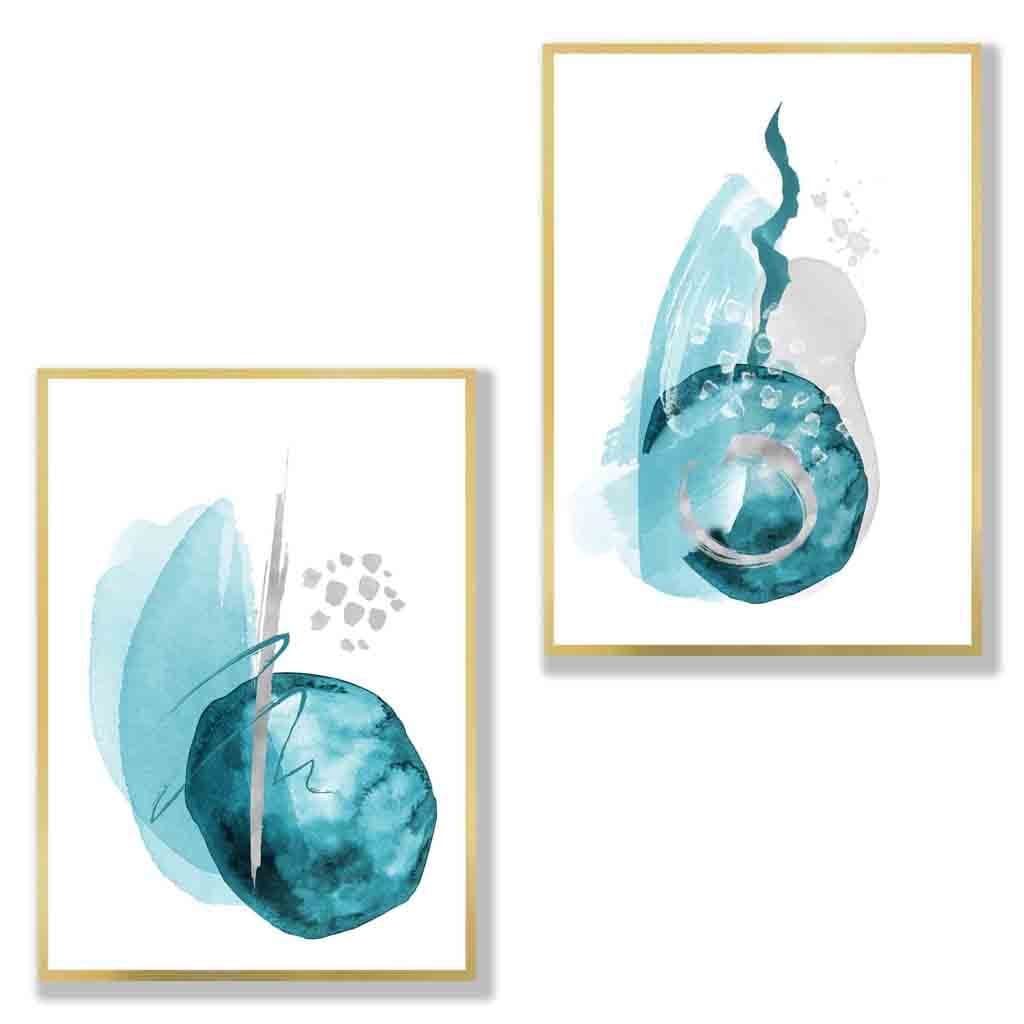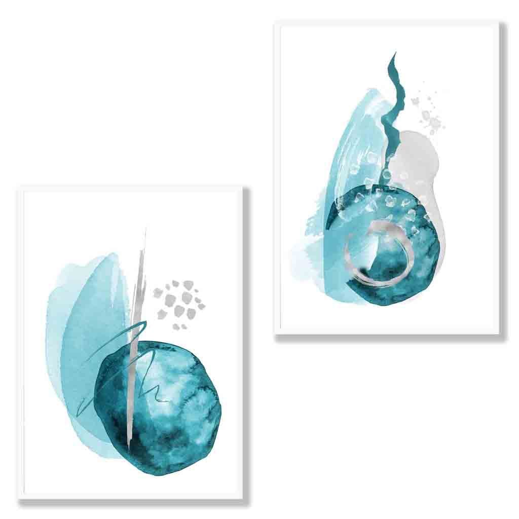 A Set of 2 Abstract Aqua, Teal and Silver (Not Foil) Wall Art Prints from Watercolour Paintings