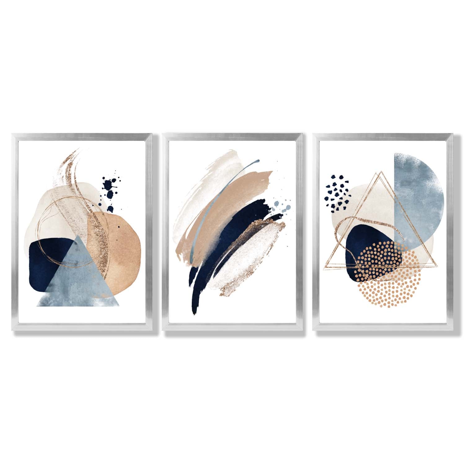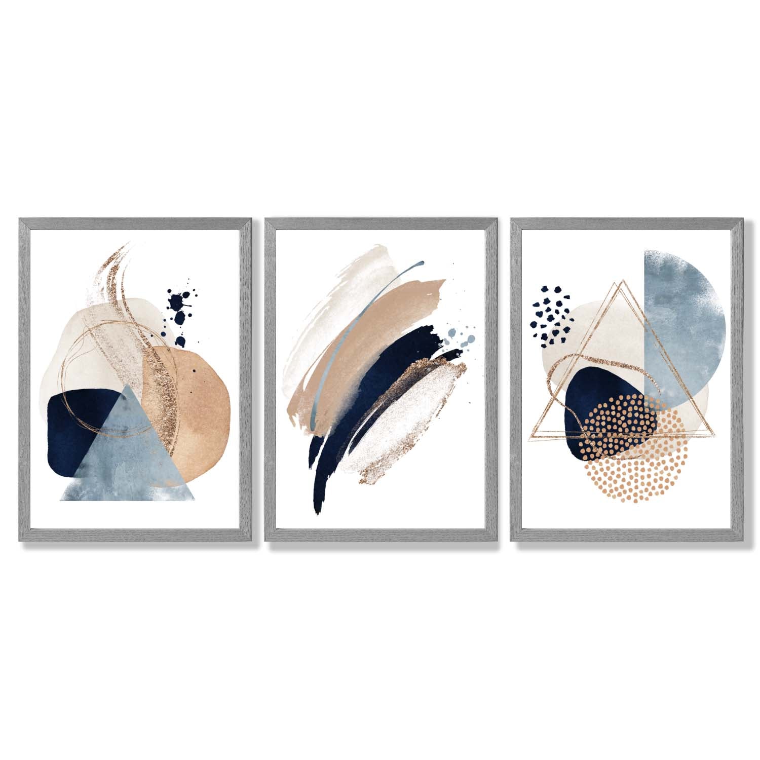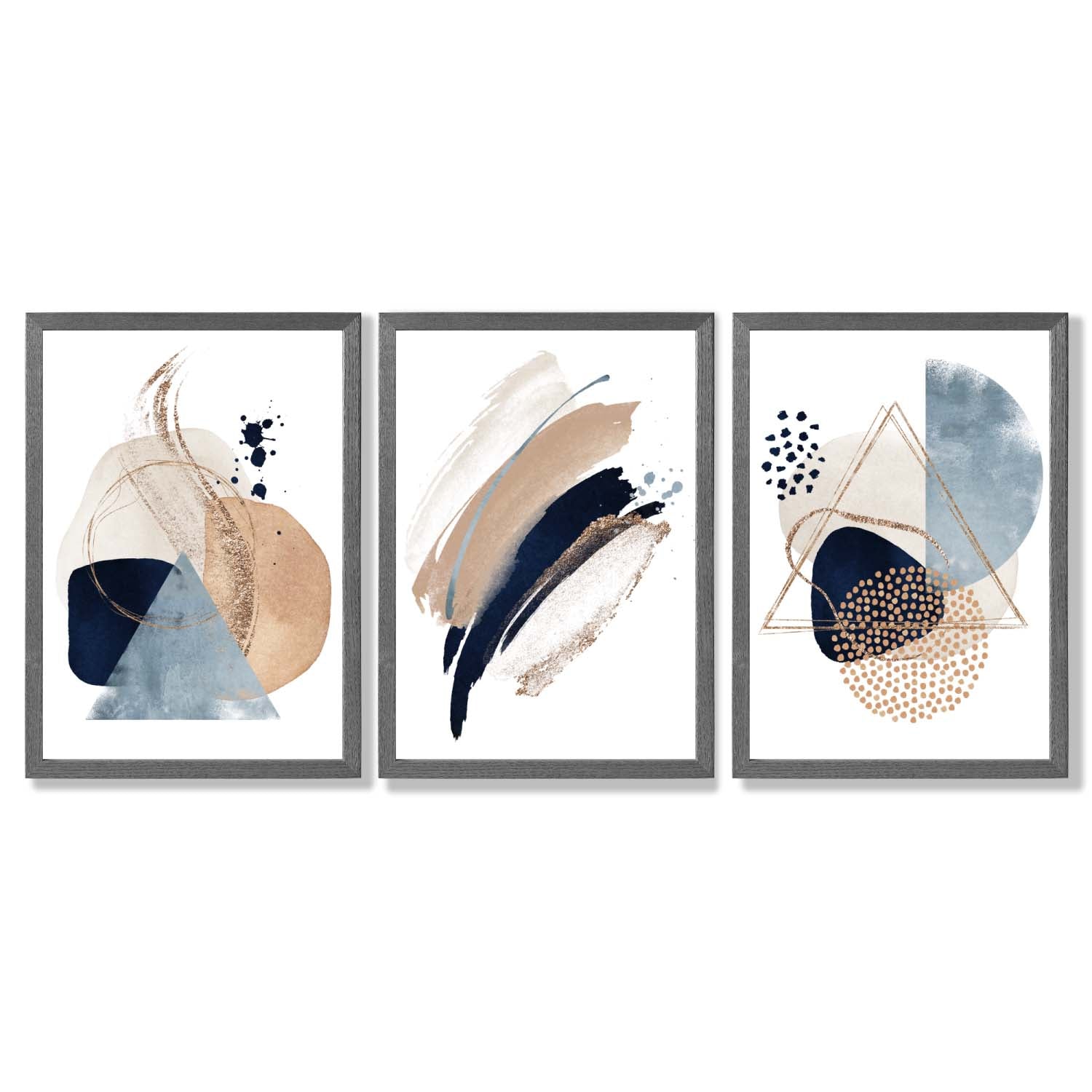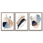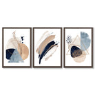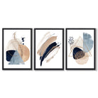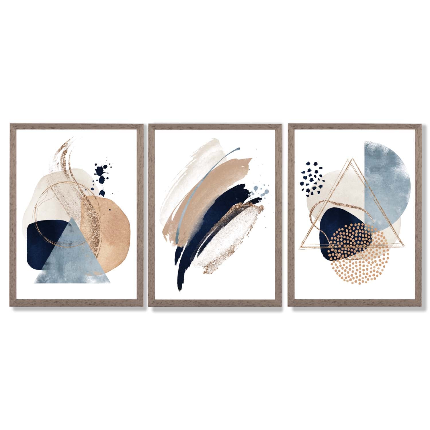 Set of 3 Abstract Beige Blue and Gold Framed Prints