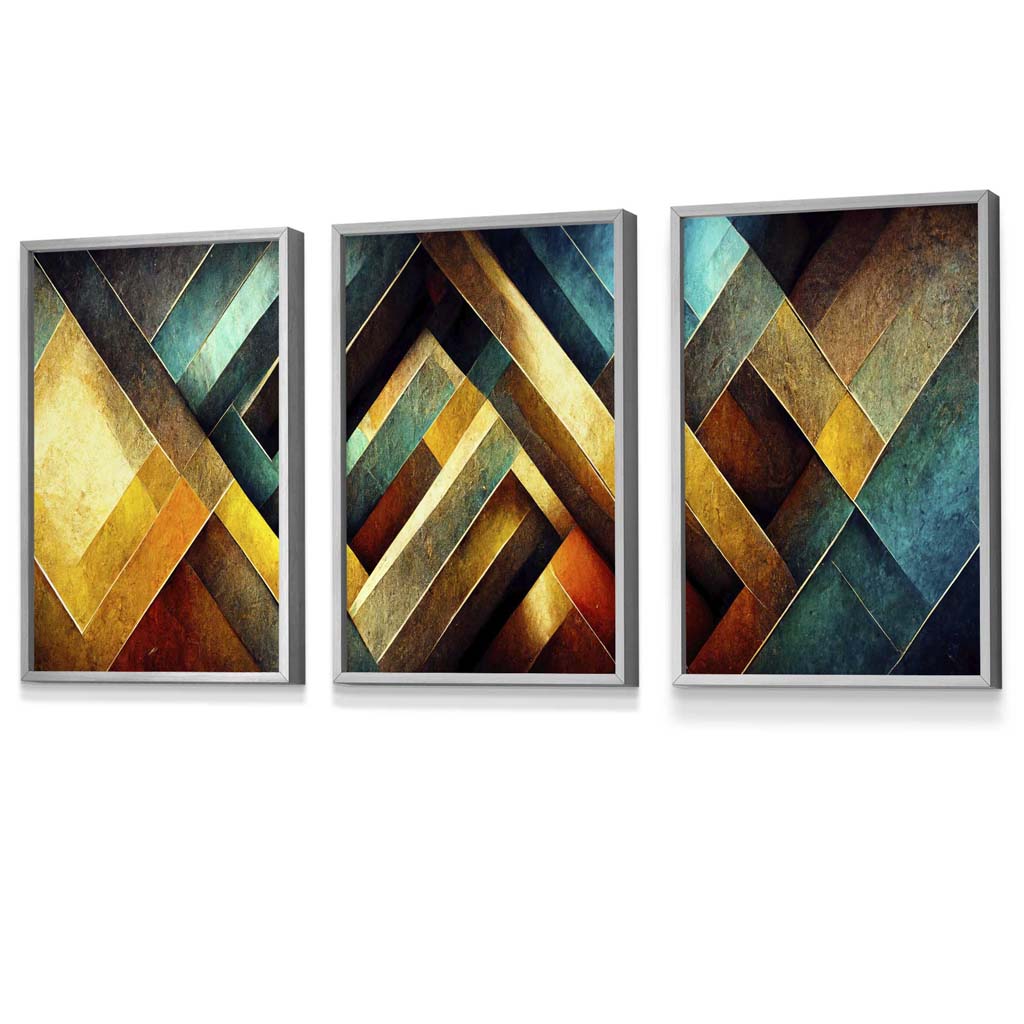 This set of 3 Abstract Metallic Distressed Mosaic Framed Wall Art Prints is part of our Industrial Collection. It features panels with herringbone tiles in shades of Blue, Yellow Green, and Red, and is guaranteed to bring timeless charm and industrial complexity to any living space.