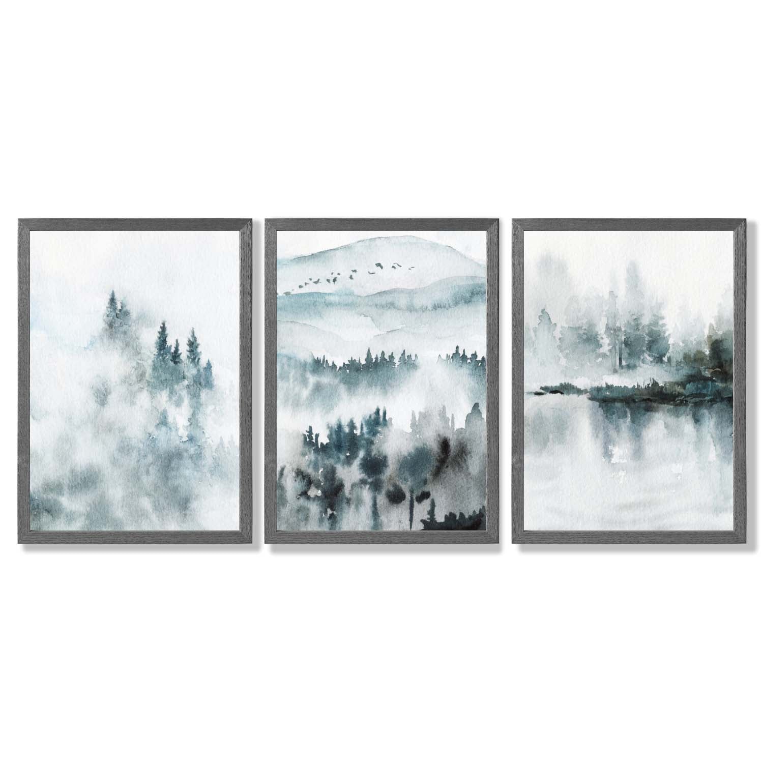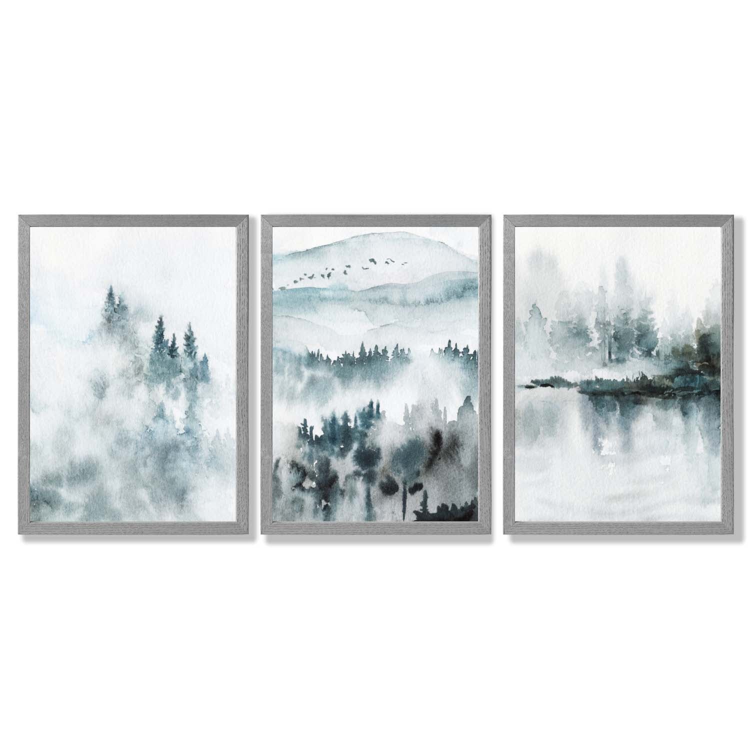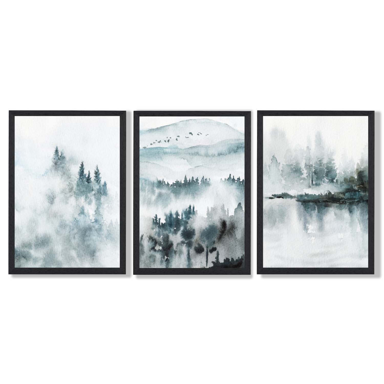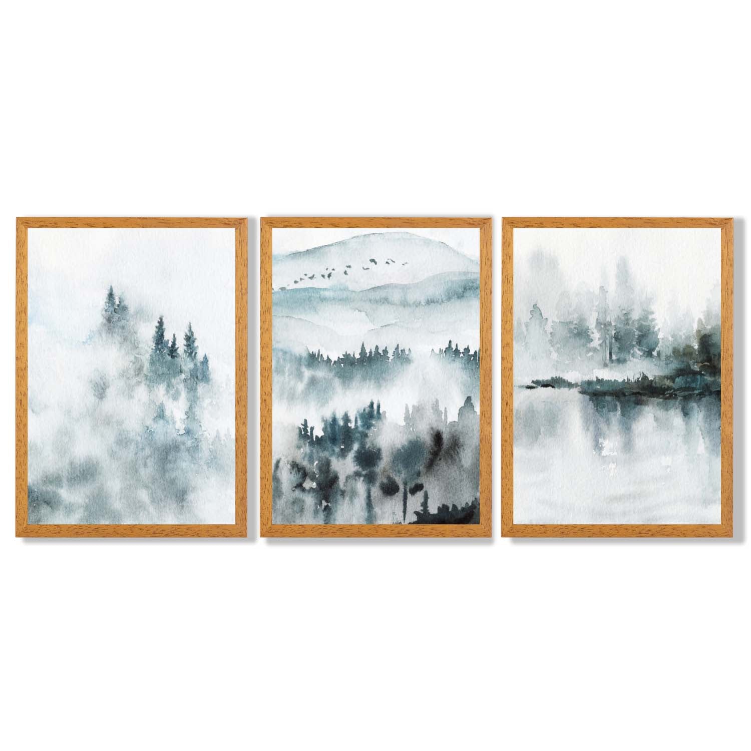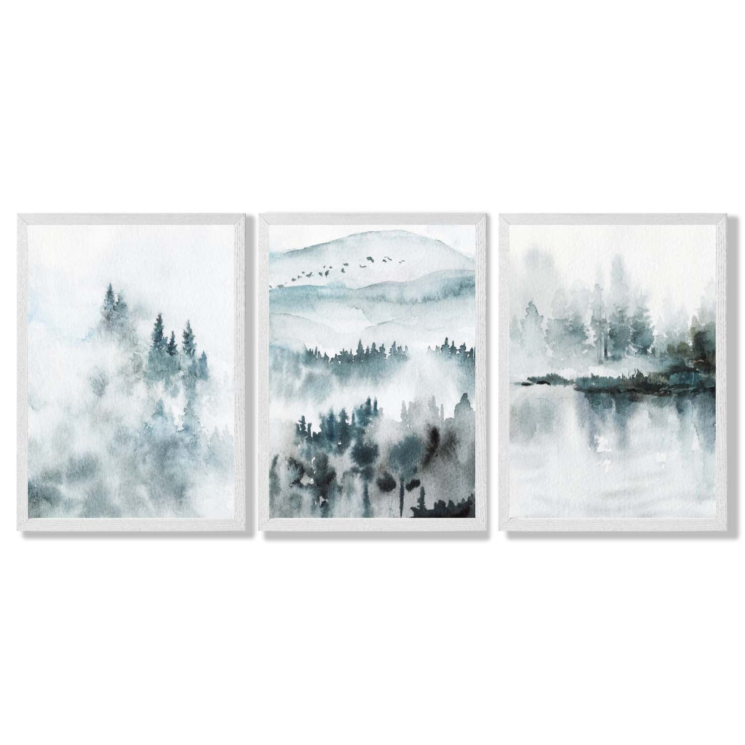 Part of our Abstract Nature Collection, this Set of 3 Framed Wall Art features Teal Blue Forest Trees and Lake in Watercolour. These Wall Art Prints work with many interior styles including Boho, Modern and Minimalist.