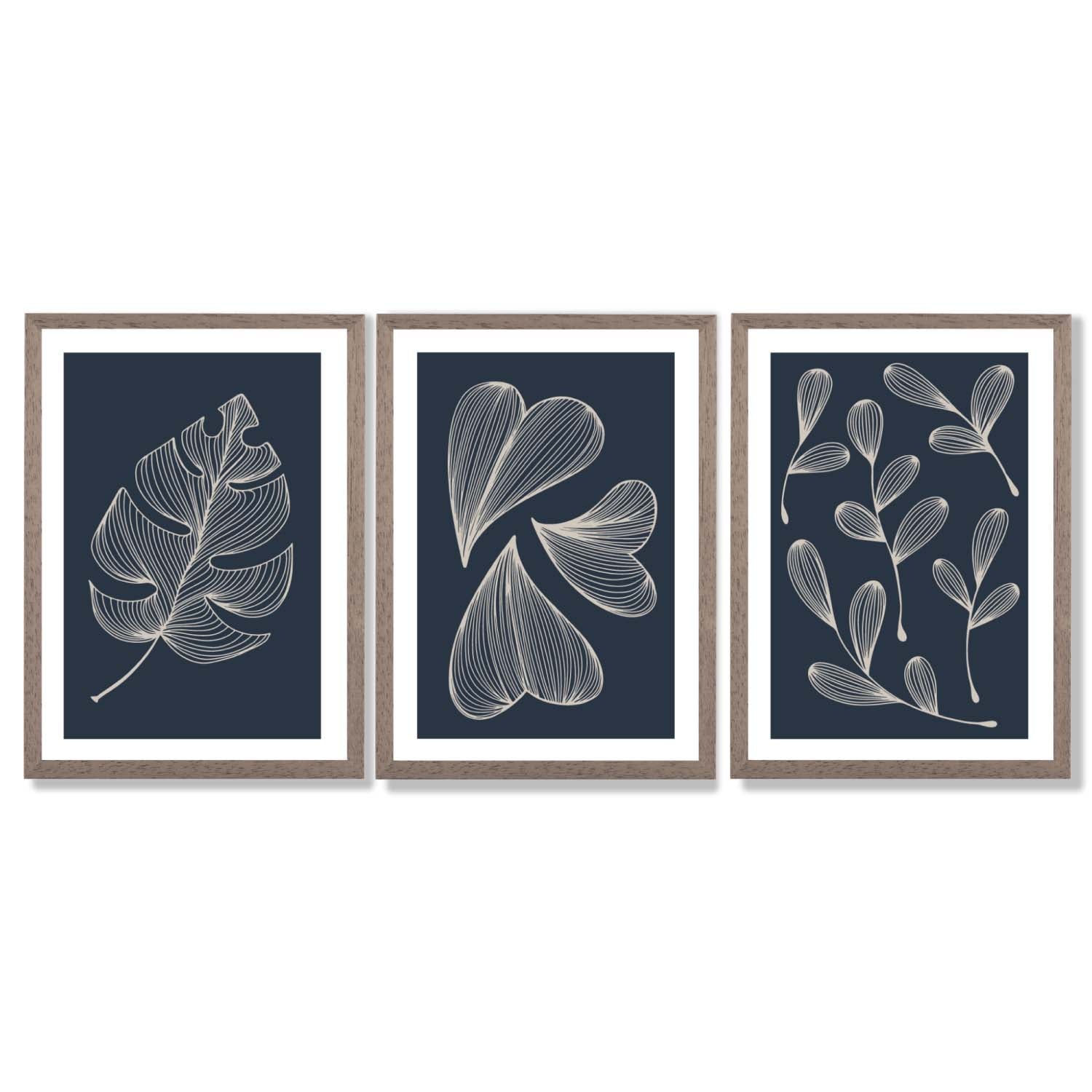 Set of 3 Dark Blue Minimal Sketch Leaves Framed Art Prints