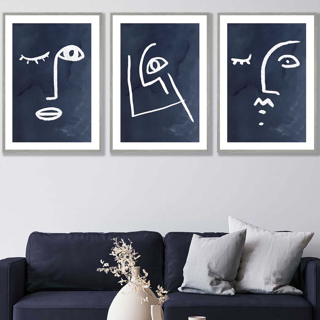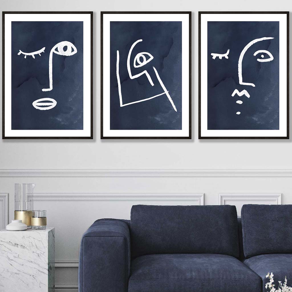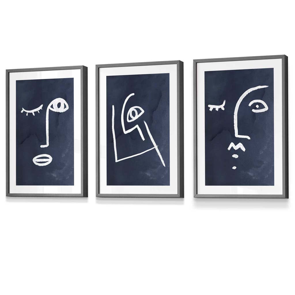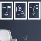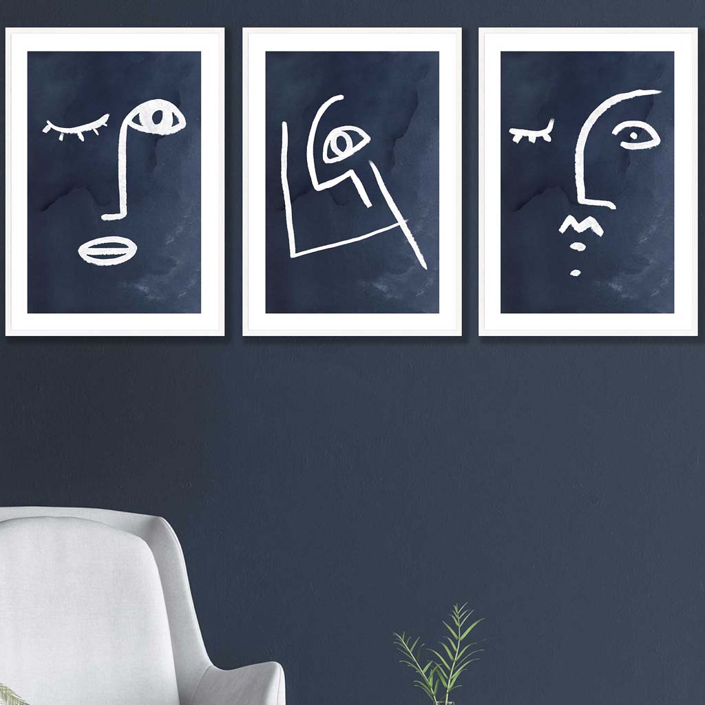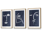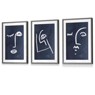 Introduce sophisticated elegance into your space with our Set of 3 Framed Abstract Faces. These navy blue and white pieces feature line art in the style of Picasso, adding a touch of artful luxury to any room. Elevate your decor with this exclusive set today.