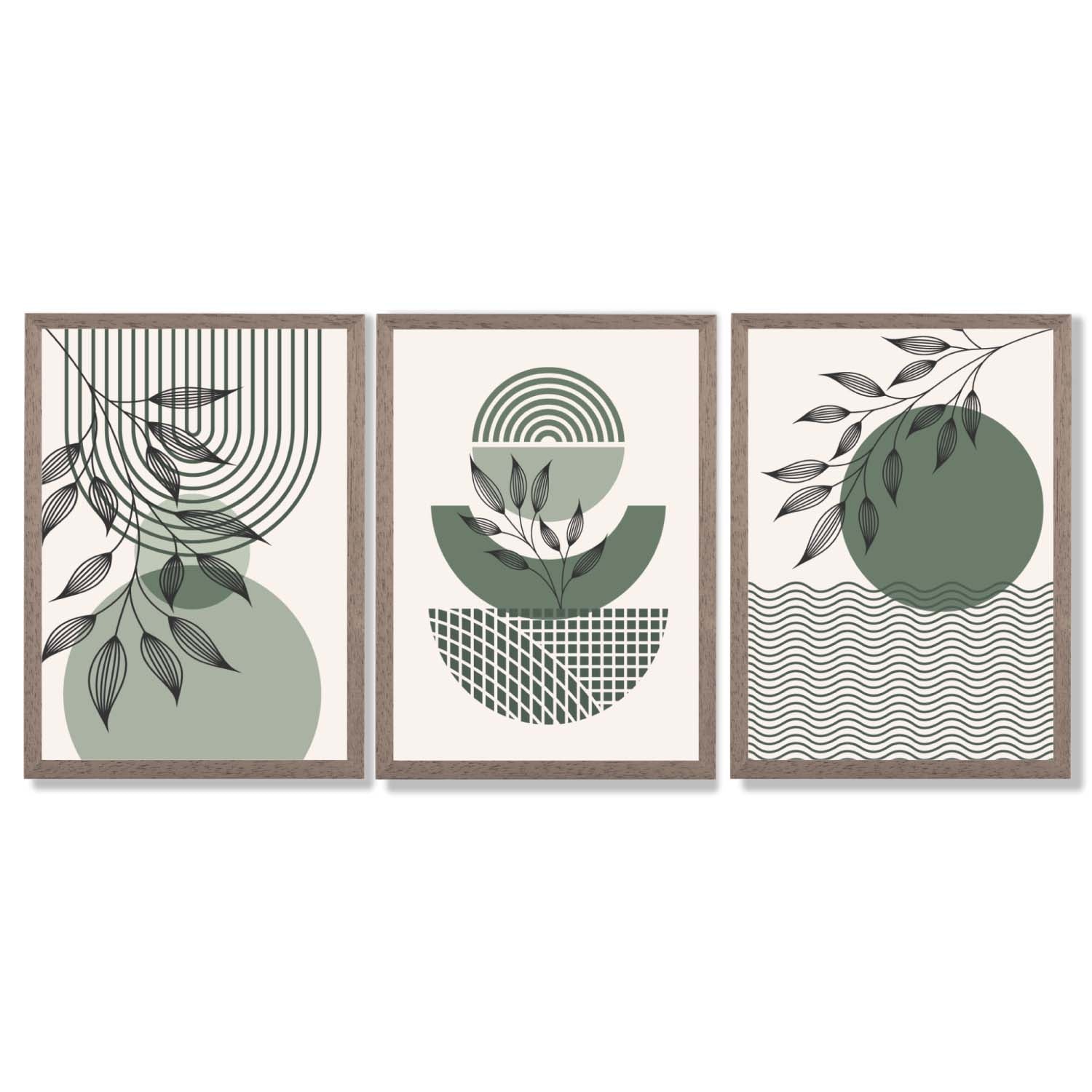 Set of 3 Geometric Green and Beige Botanical Framed Art Prints
