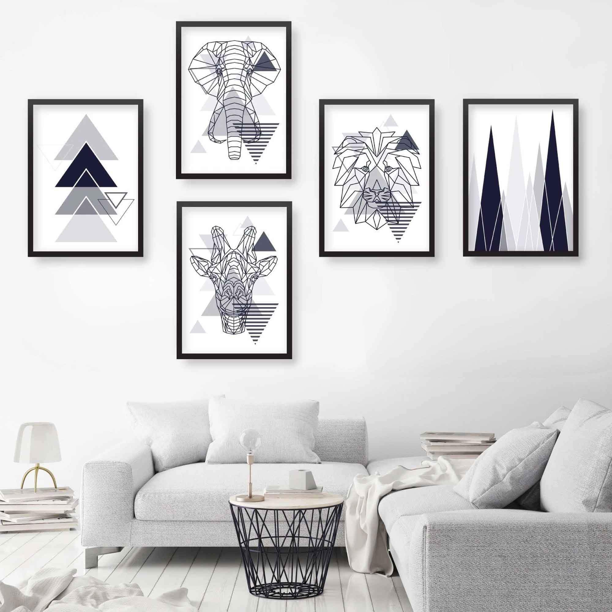 Set of 5 Gallery Wall Art Navy Blue and Grey Art Prints Jungle Art Print Elephant Lion Giraffe GEOMETRIC Wall Pictures Posters Artwork