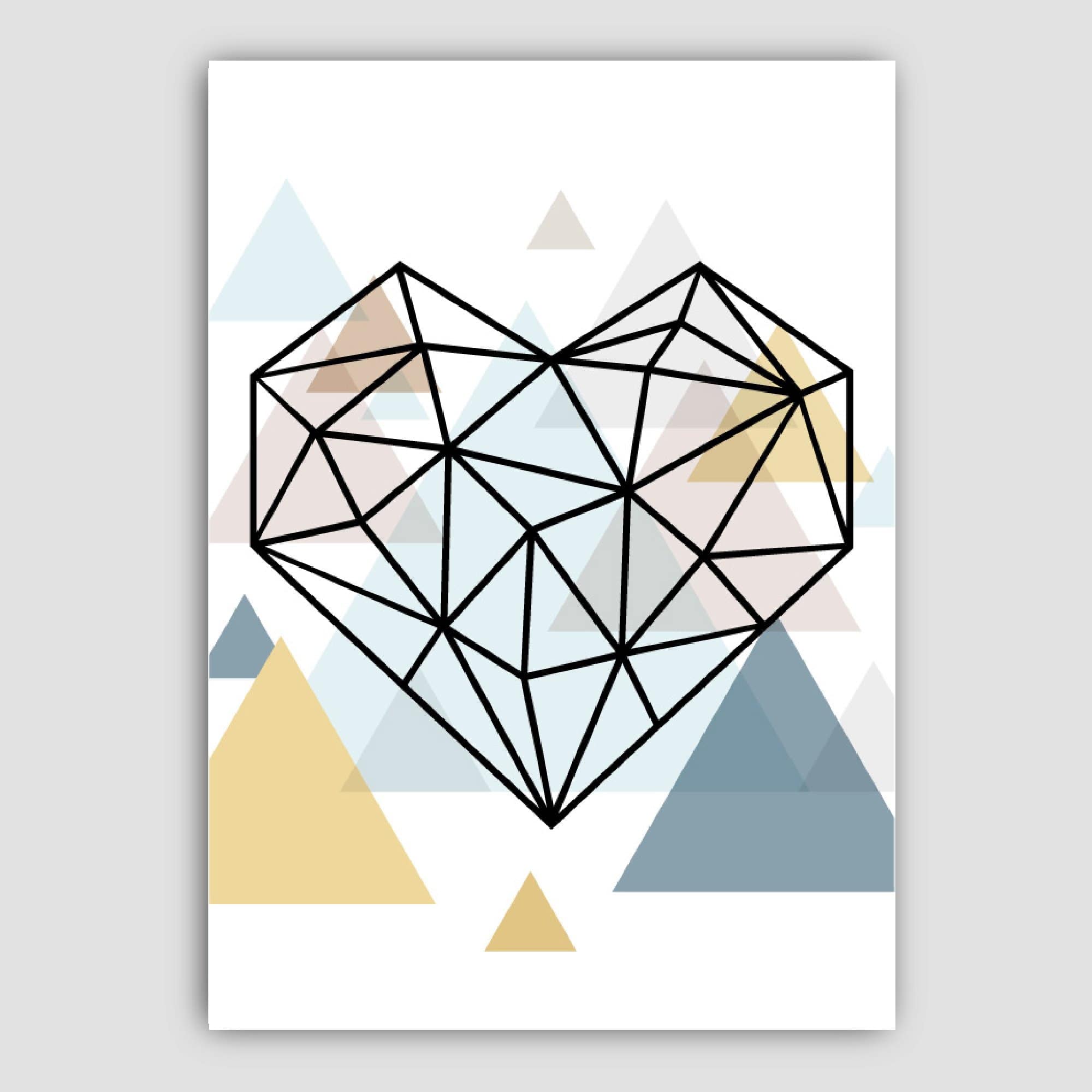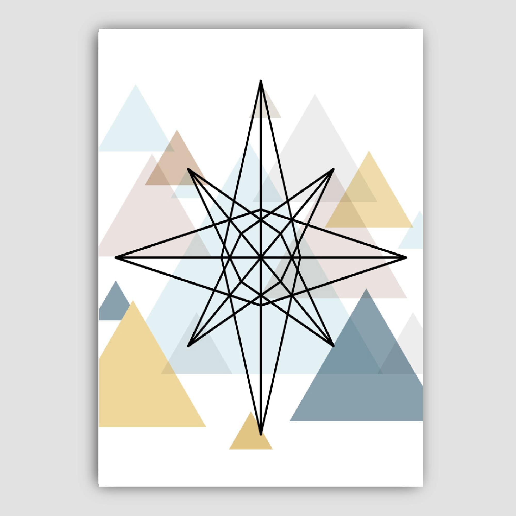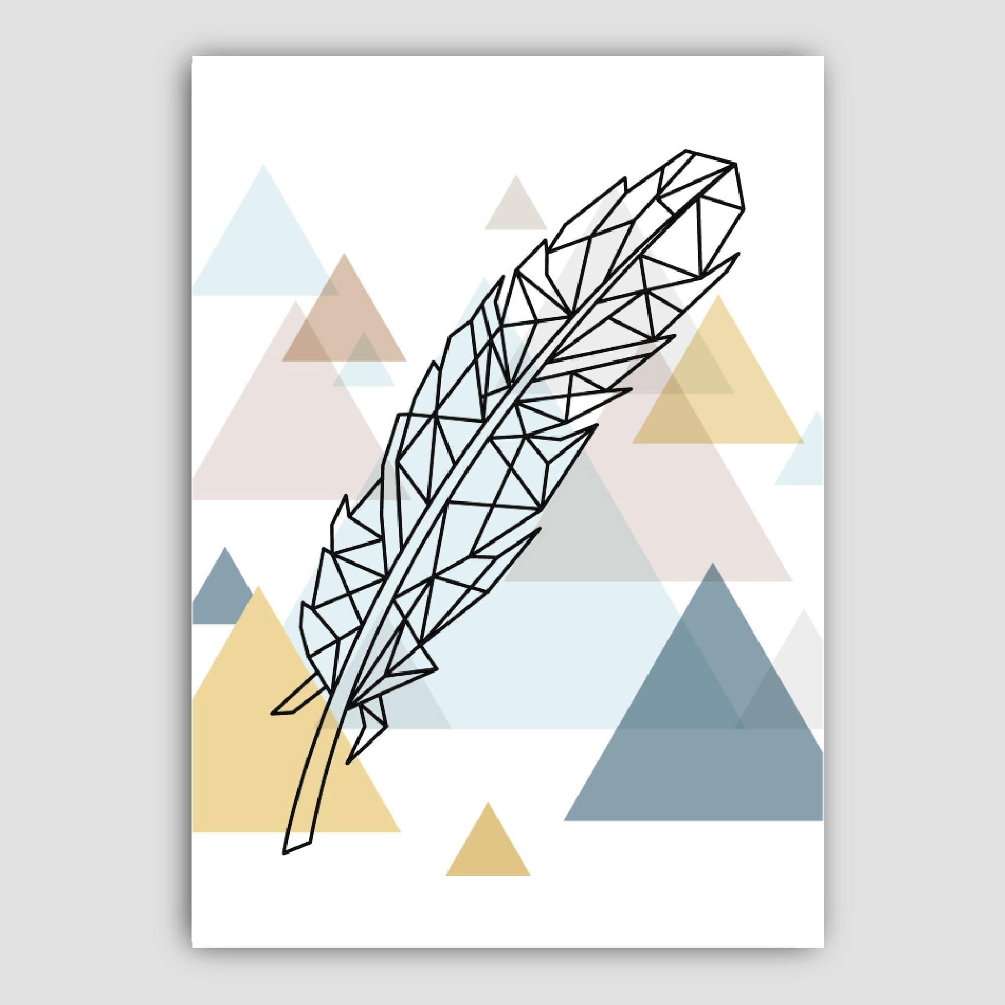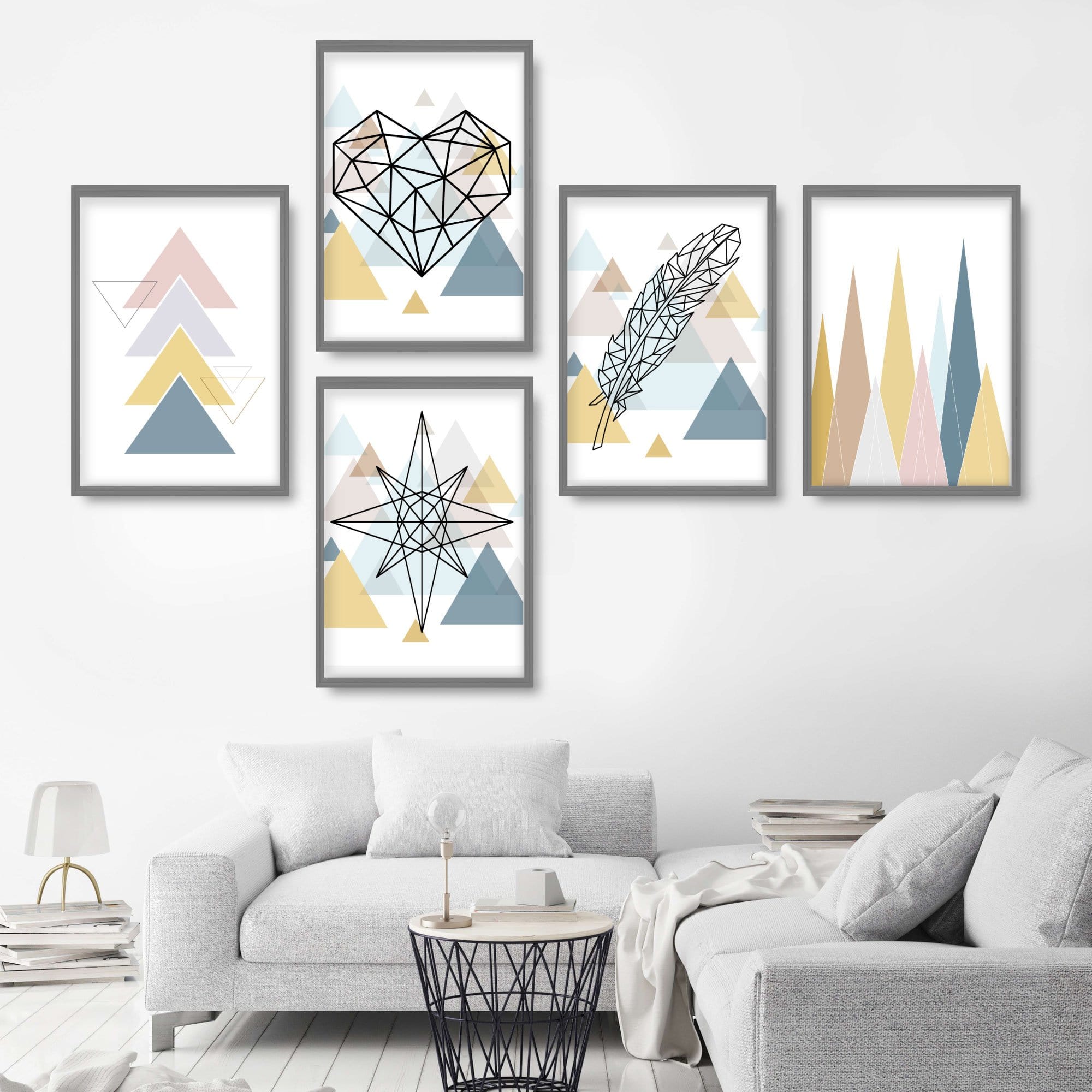Set of 5 Geometric Scandinavian Style Gallery wall set Featuring a Star, Heart and feathers complimented by geometric patterns.