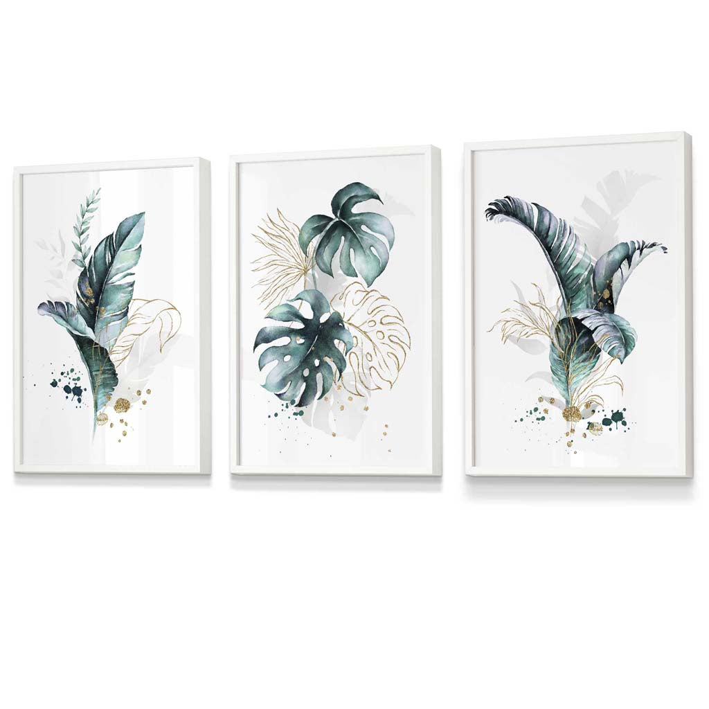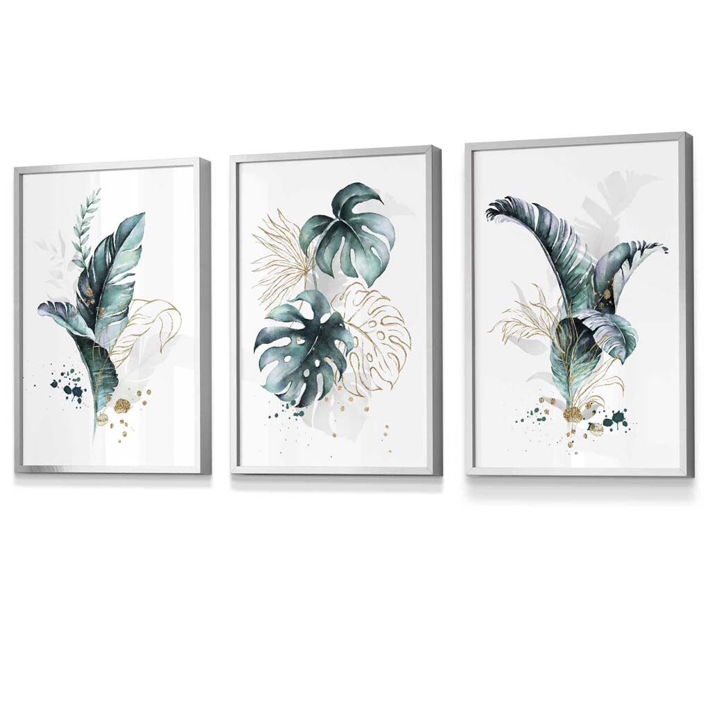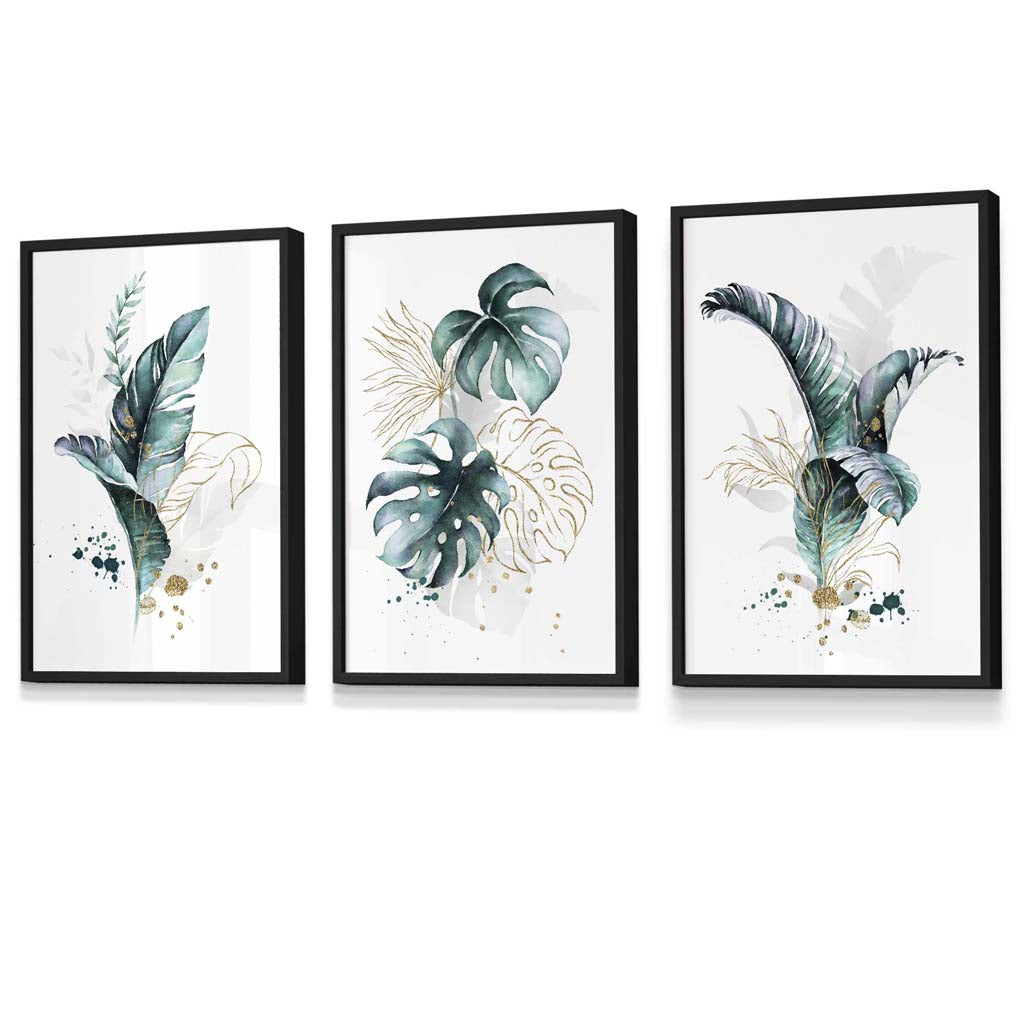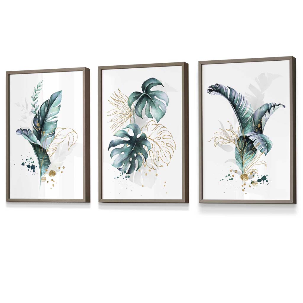 Teal Blue and Gold Botanical Set of 3 Floral Framed Prints