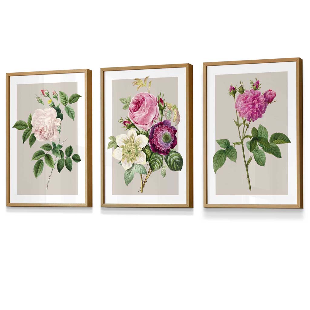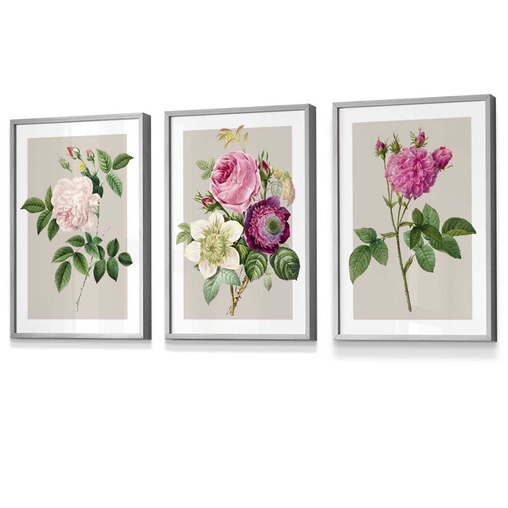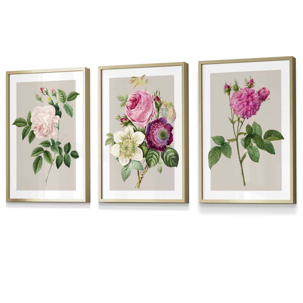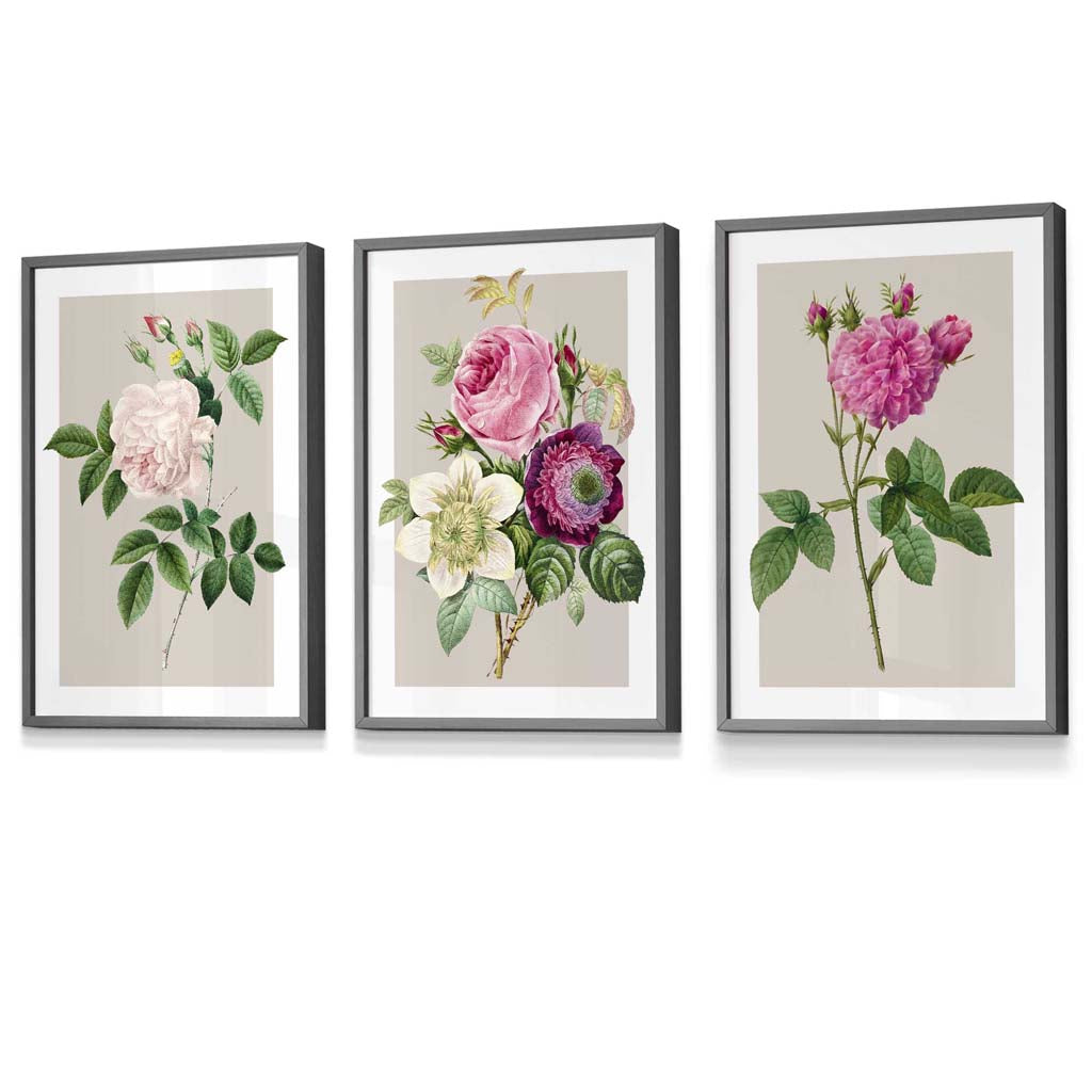 Vintage Pink and White Roses Set of 3 Framed Prints