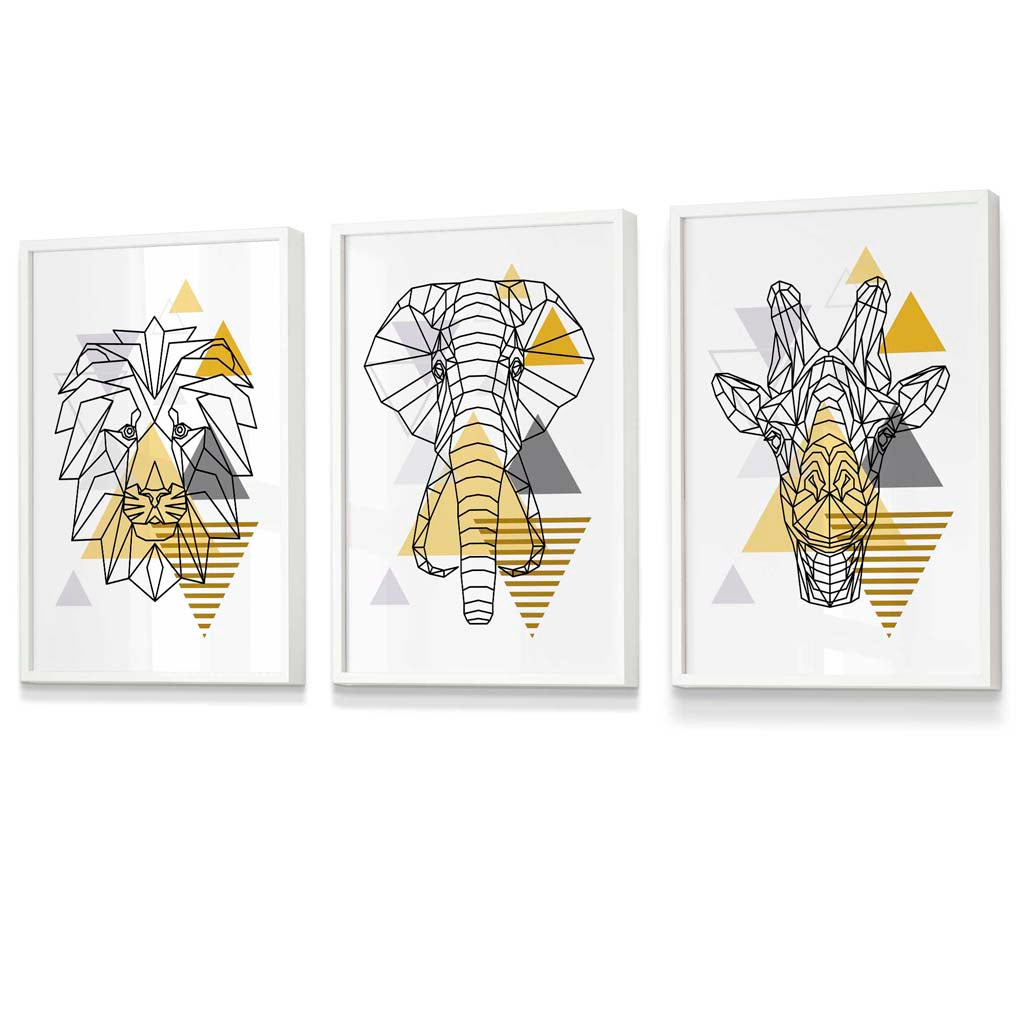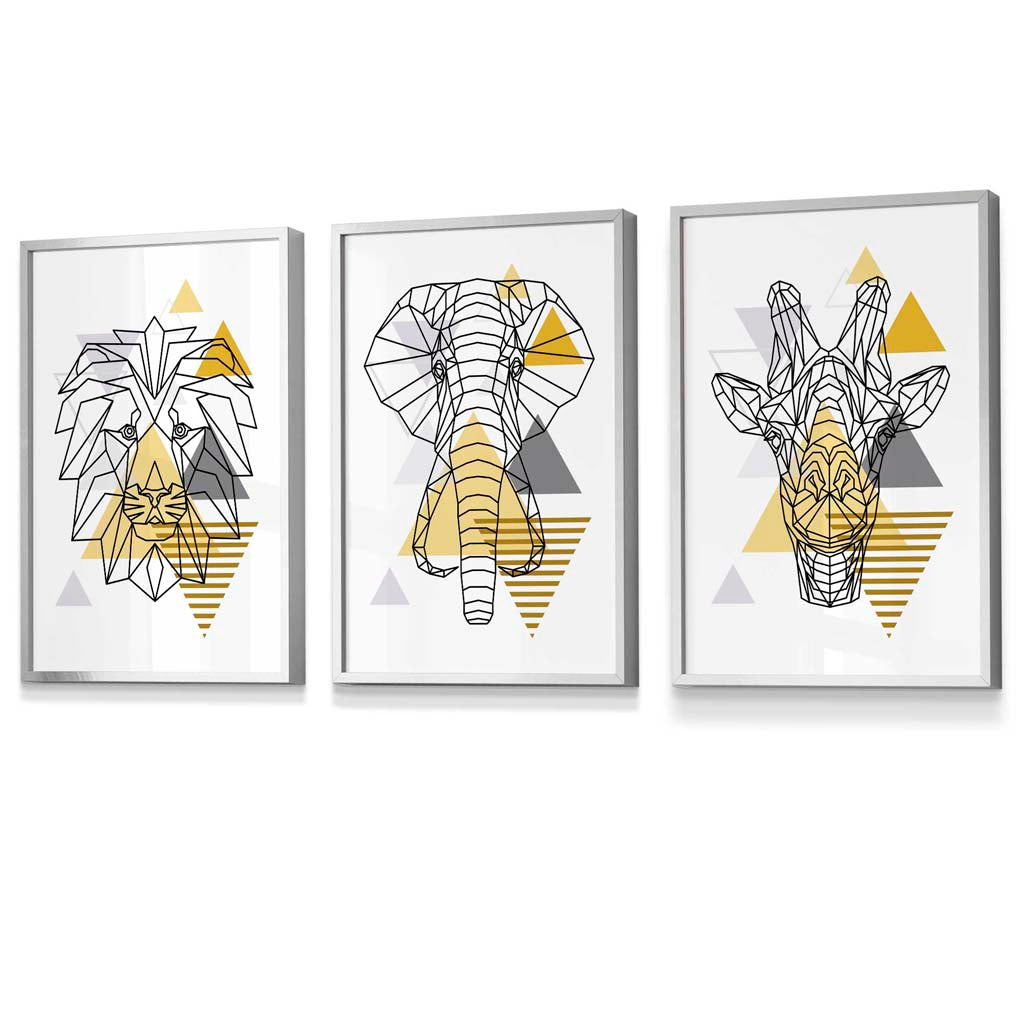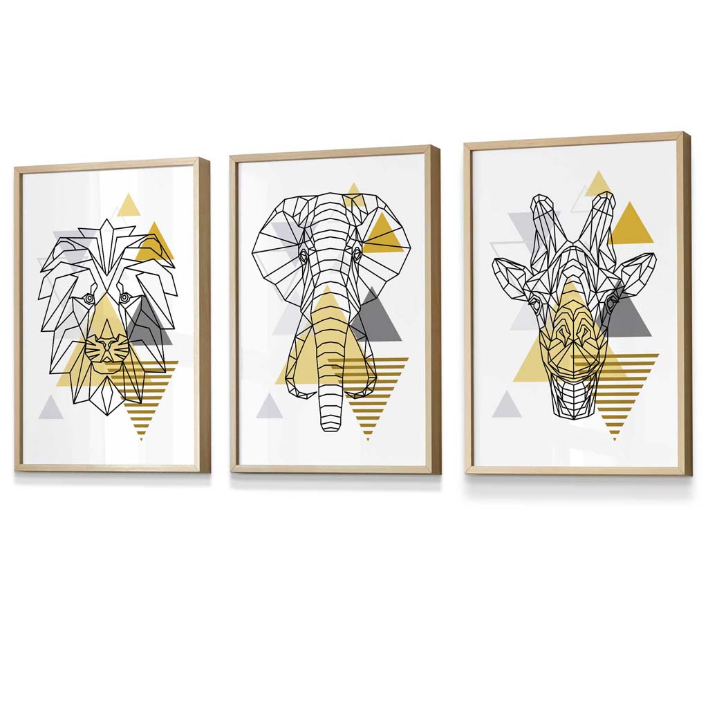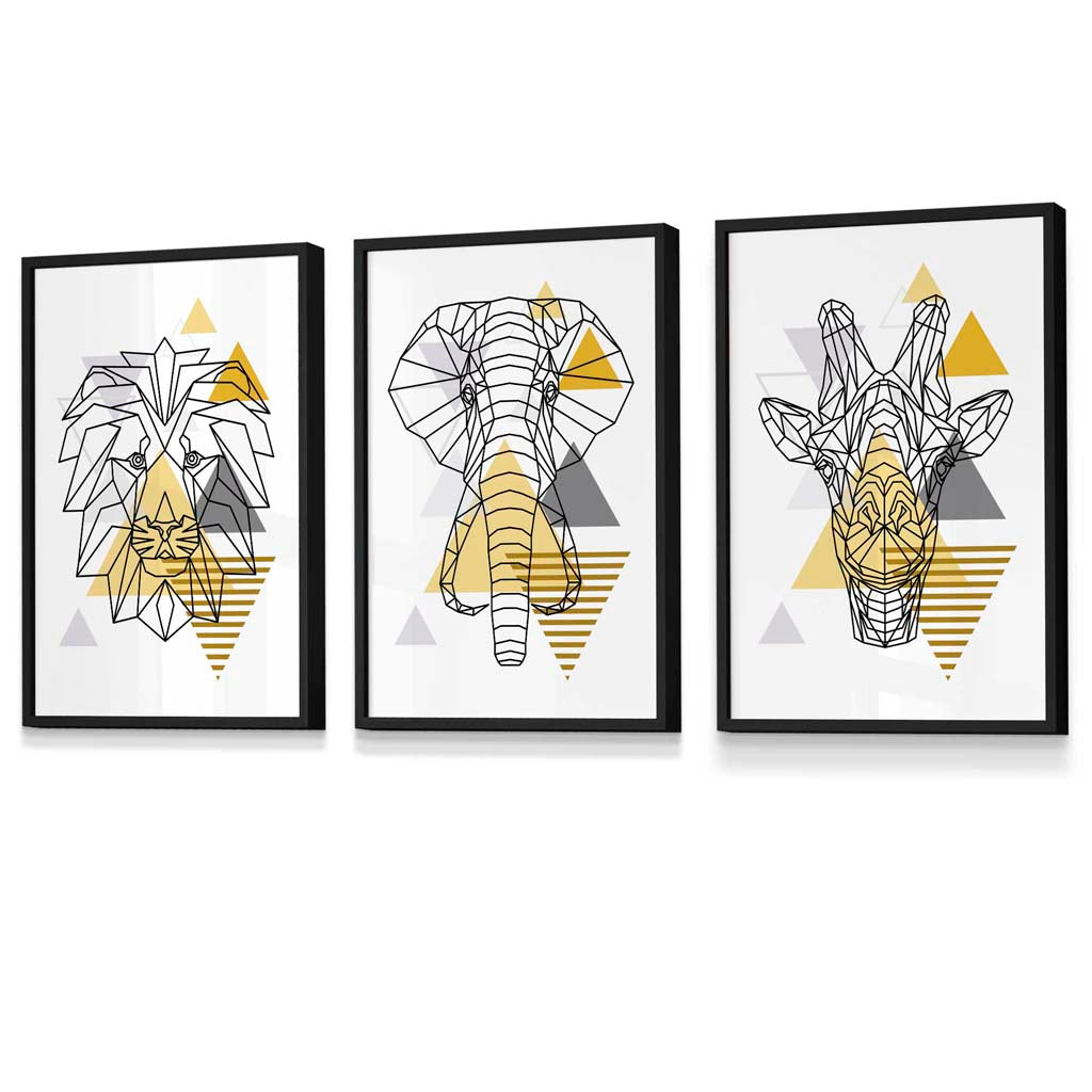 Yellow Geometric Giraffe Lion Elephant Set of 3 Framed Wall Art