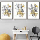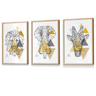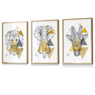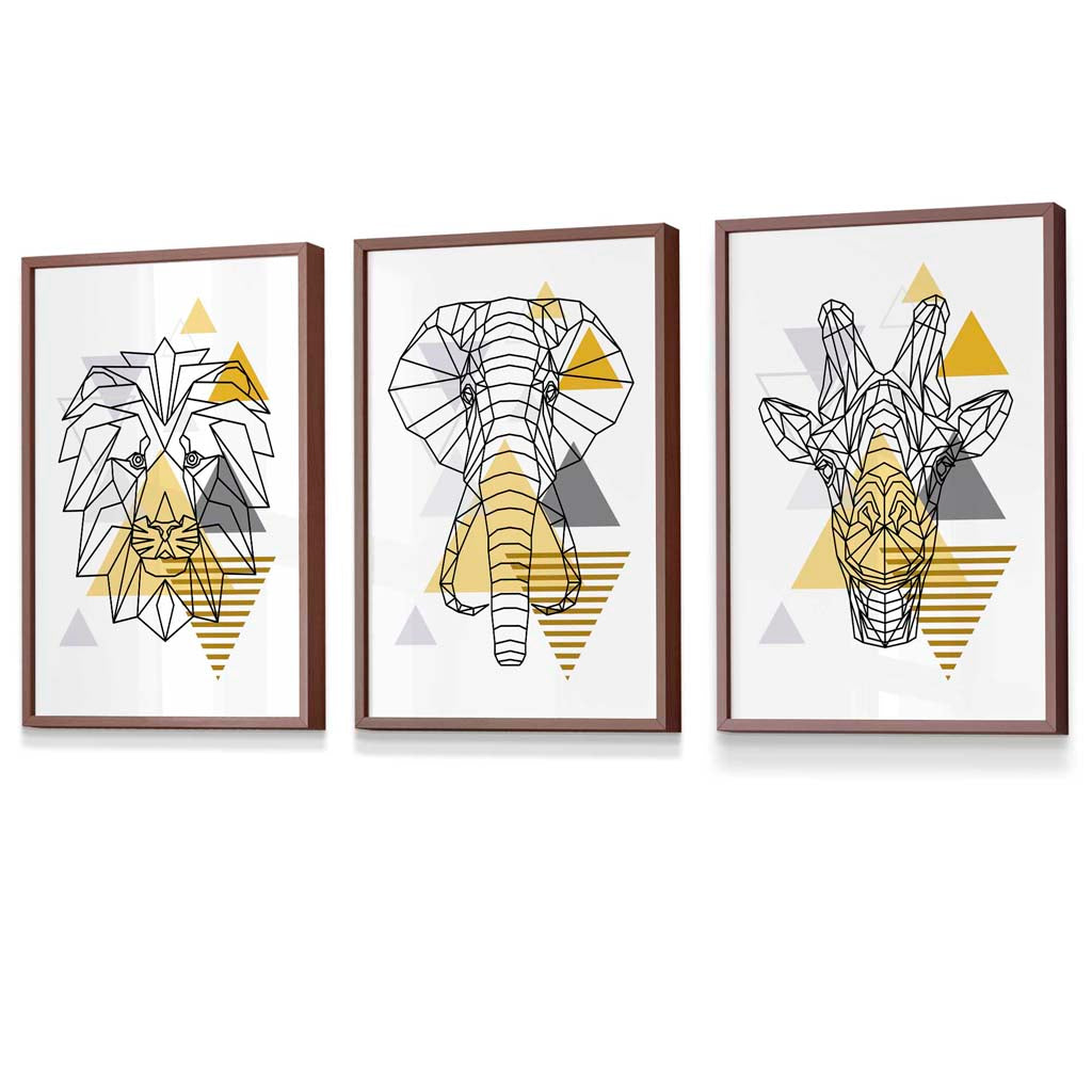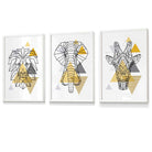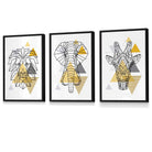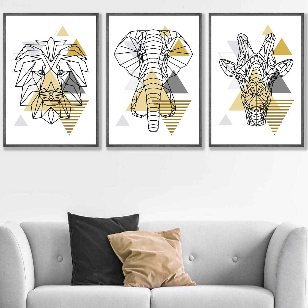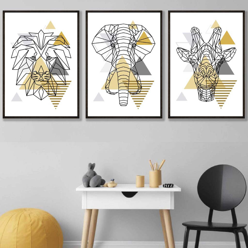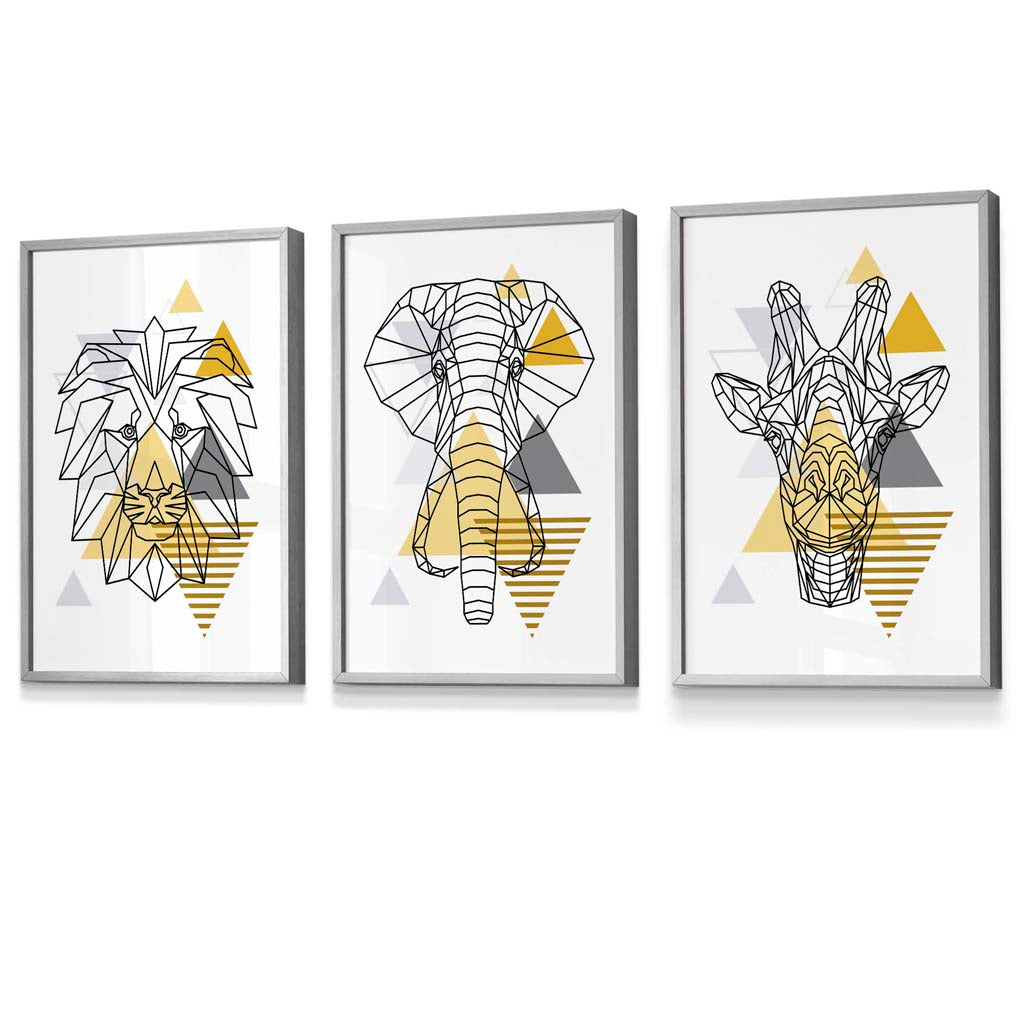 Yellow Geometric Giraffe Lion Elephant Set of 3 Framed Wall Art