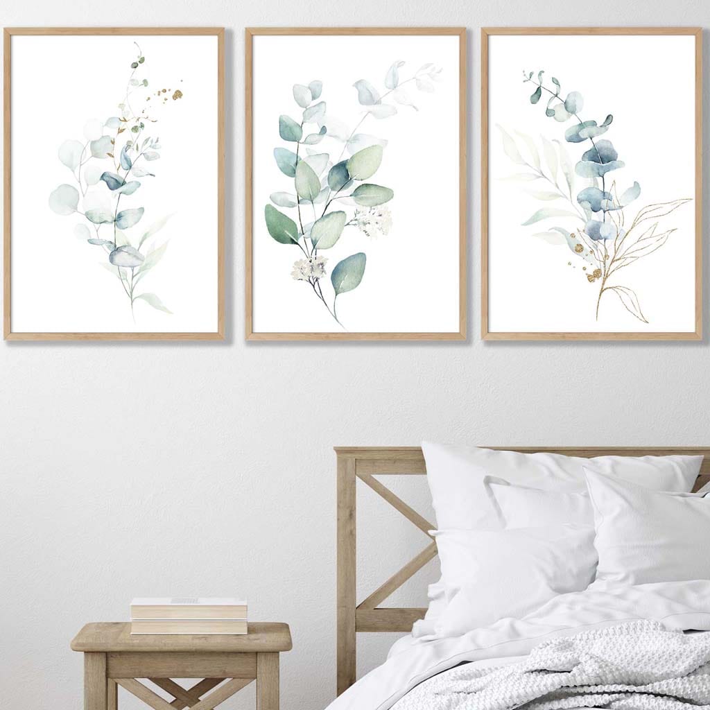FLORAL Set of 3 Eucalyptus Blue Green and Gold Splash Prints