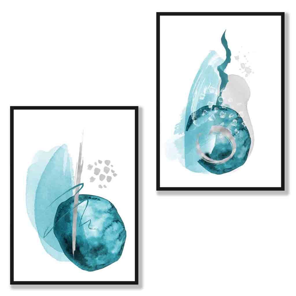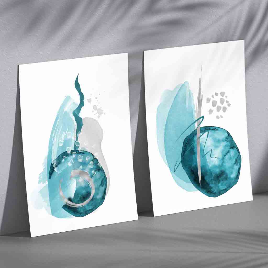 A Set of 2 Abstract Aqua, Teal and Silver (Not Foil) Wall Art Prints from Watercolour Paintings