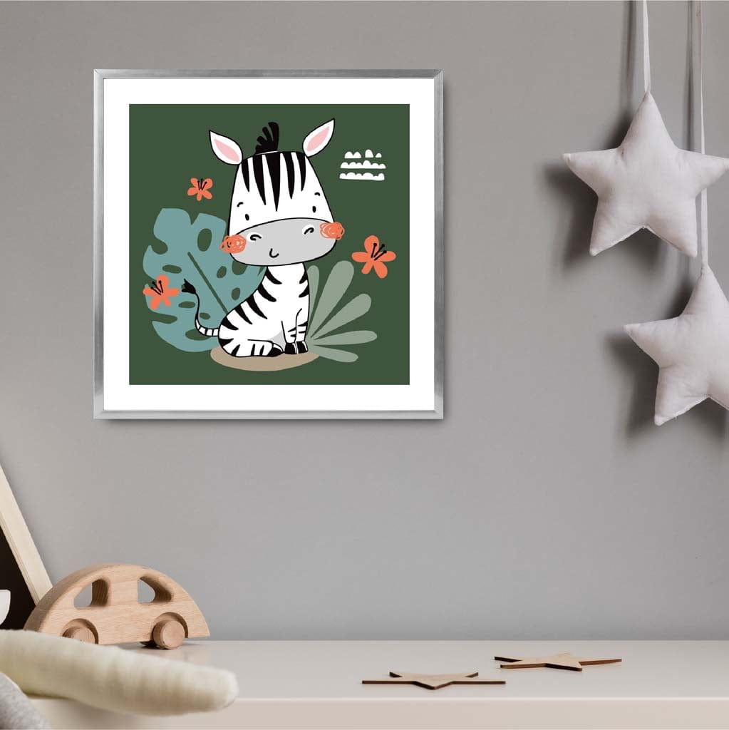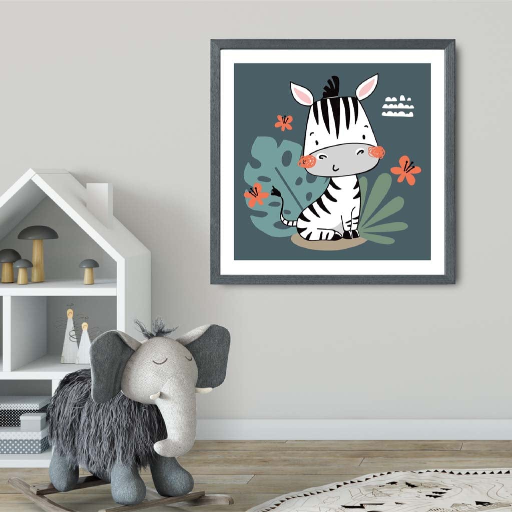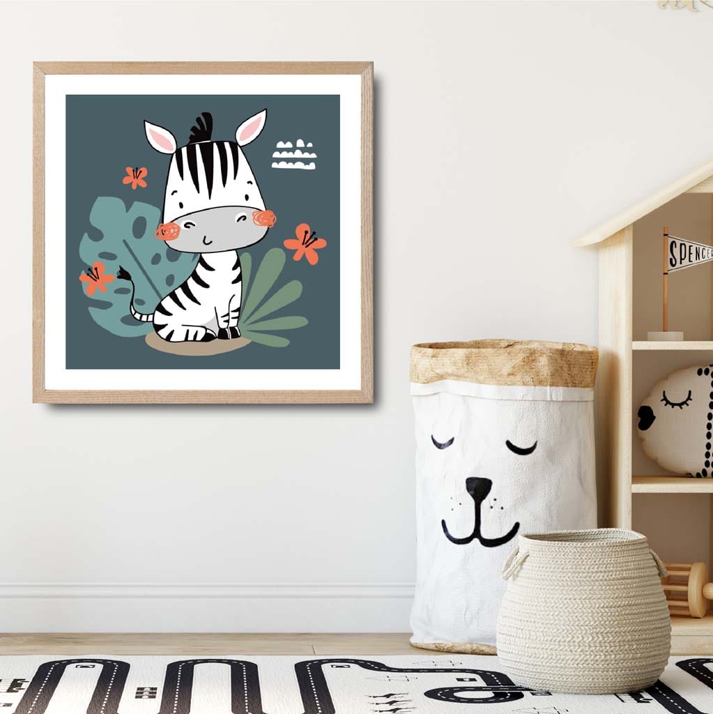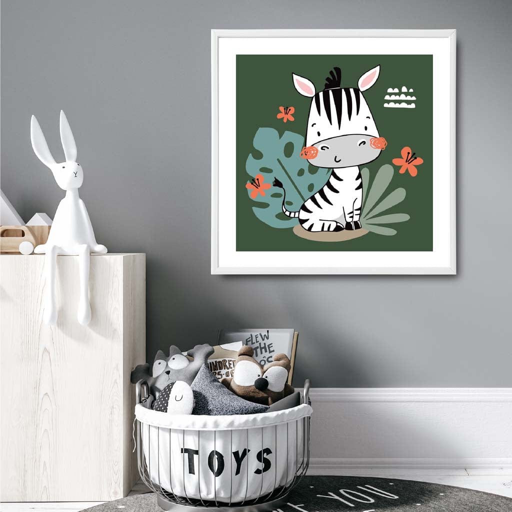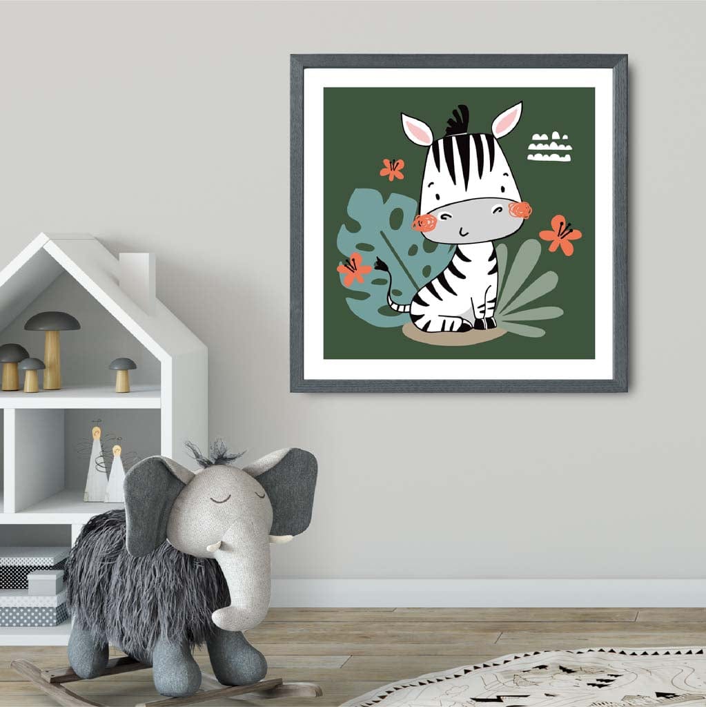Cute Zebra FRAMED Print on Dark Green Jungle Kids Wall Art