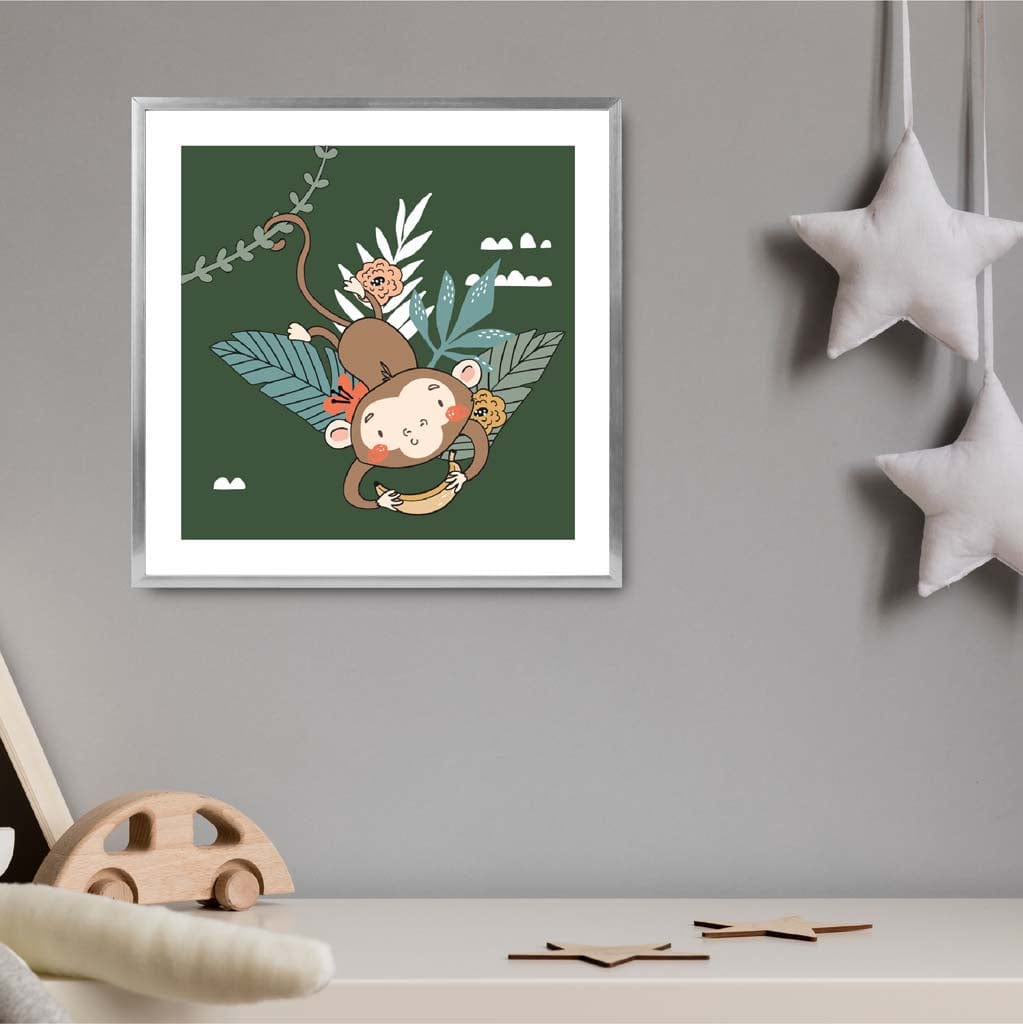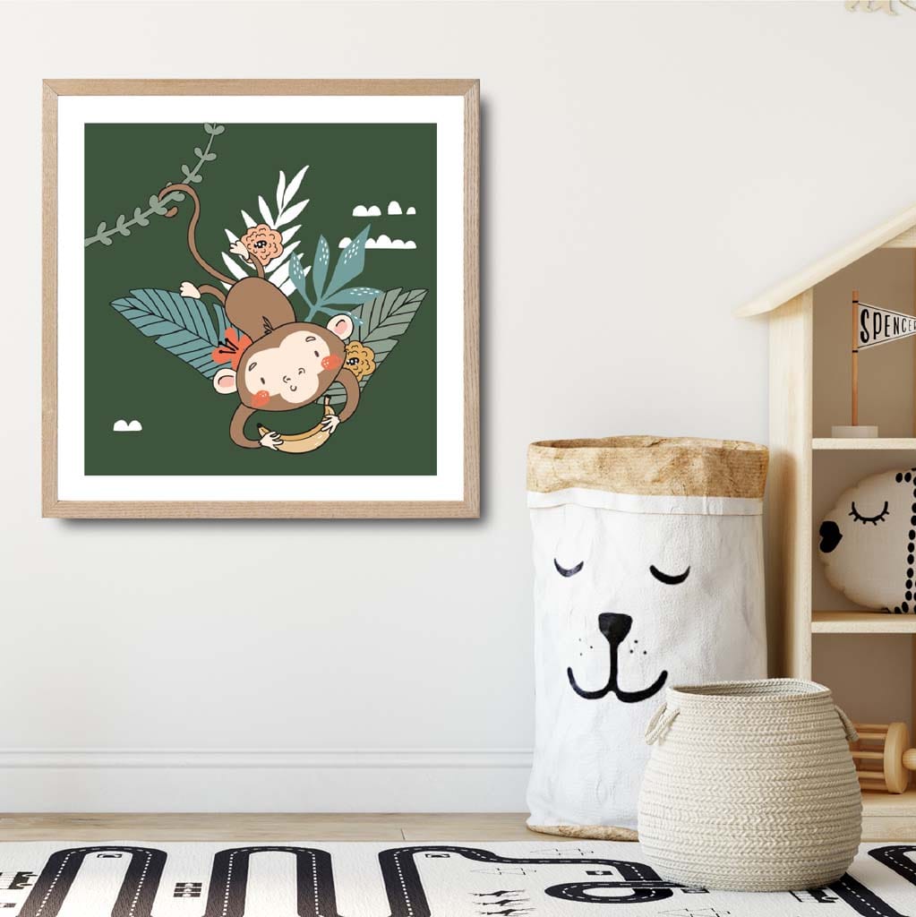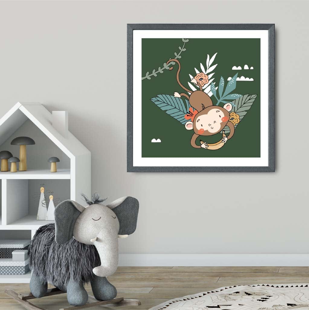 Cute Monkey FRAMED Print on Dark Green Jungle Kids Wall Art