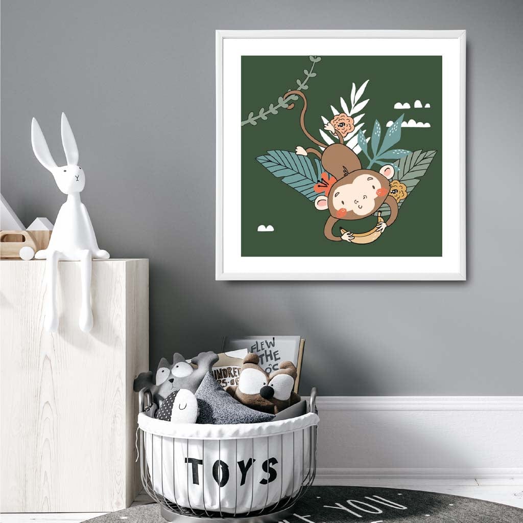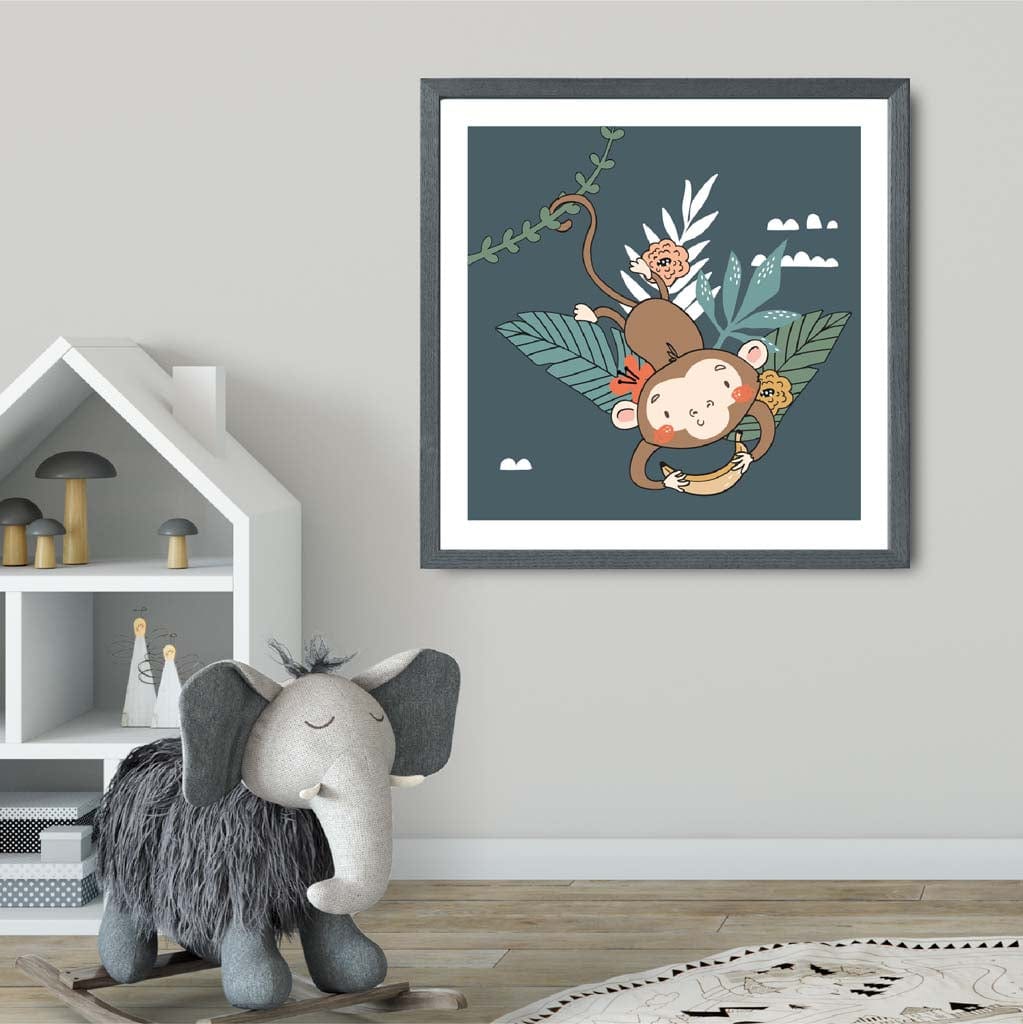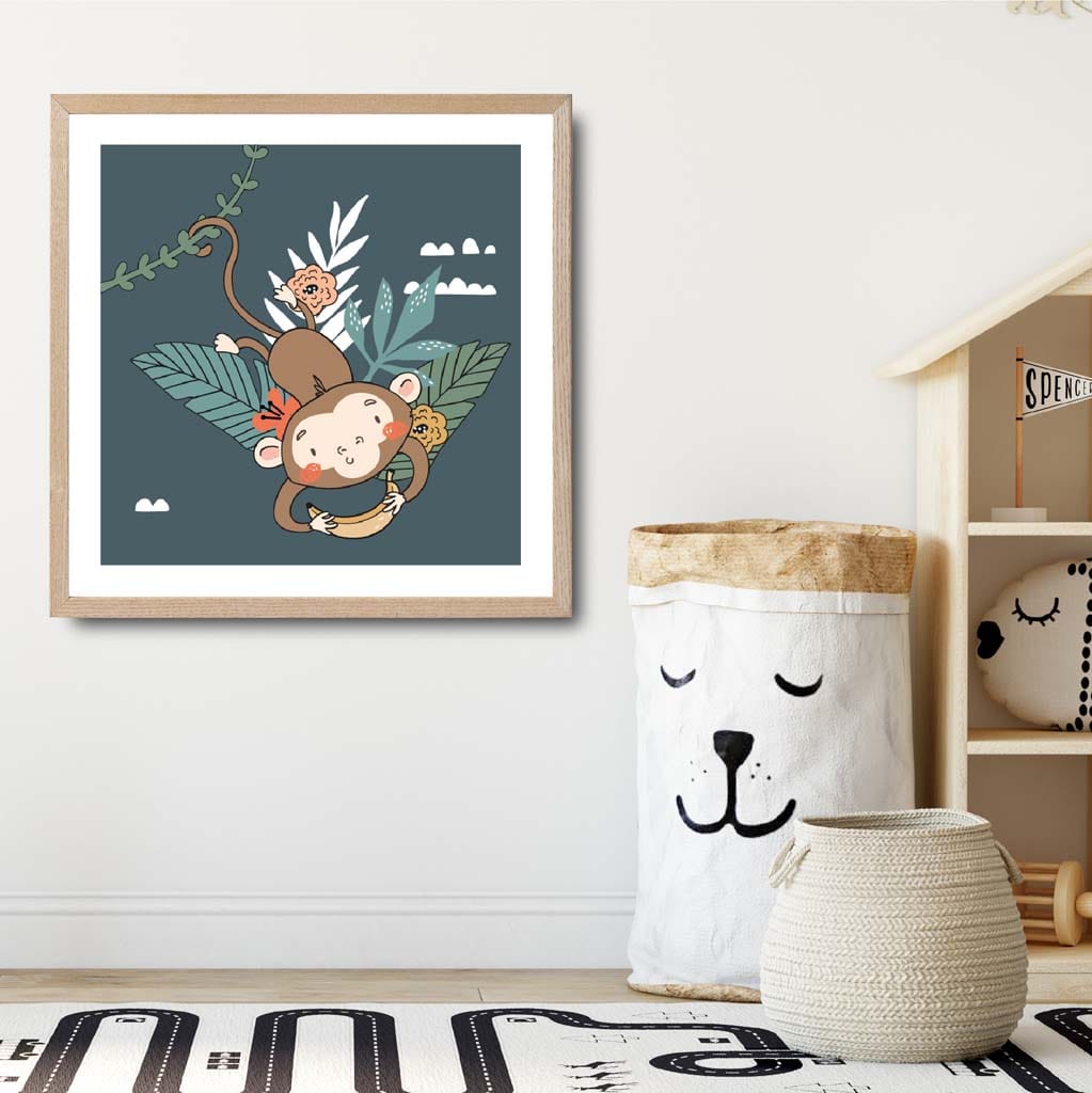 Cute Monkey FRAMED Print on Dark Green Jungle Kids Wall Art