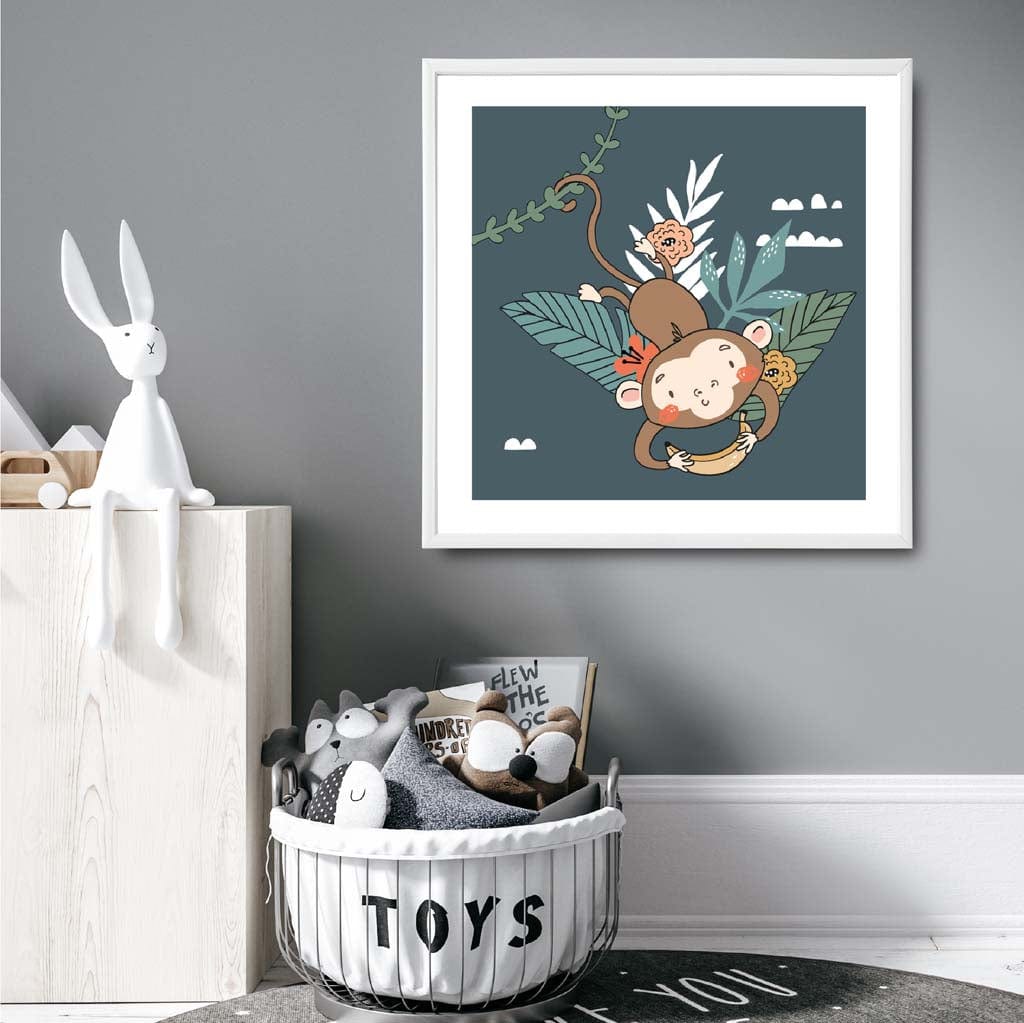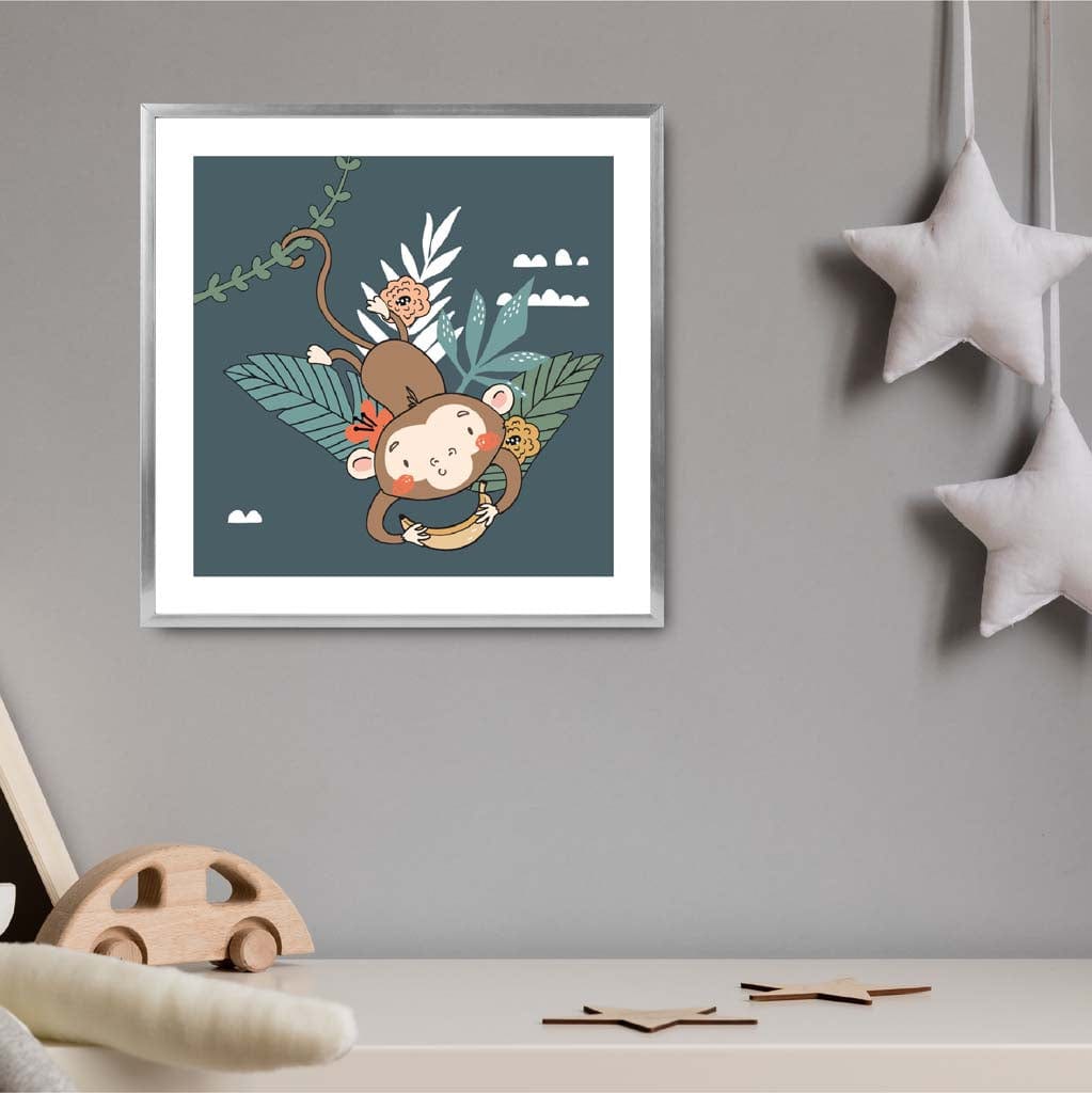 Cute Monkey FRAMED Print on Teal Blue Jungle Kids Wall Art