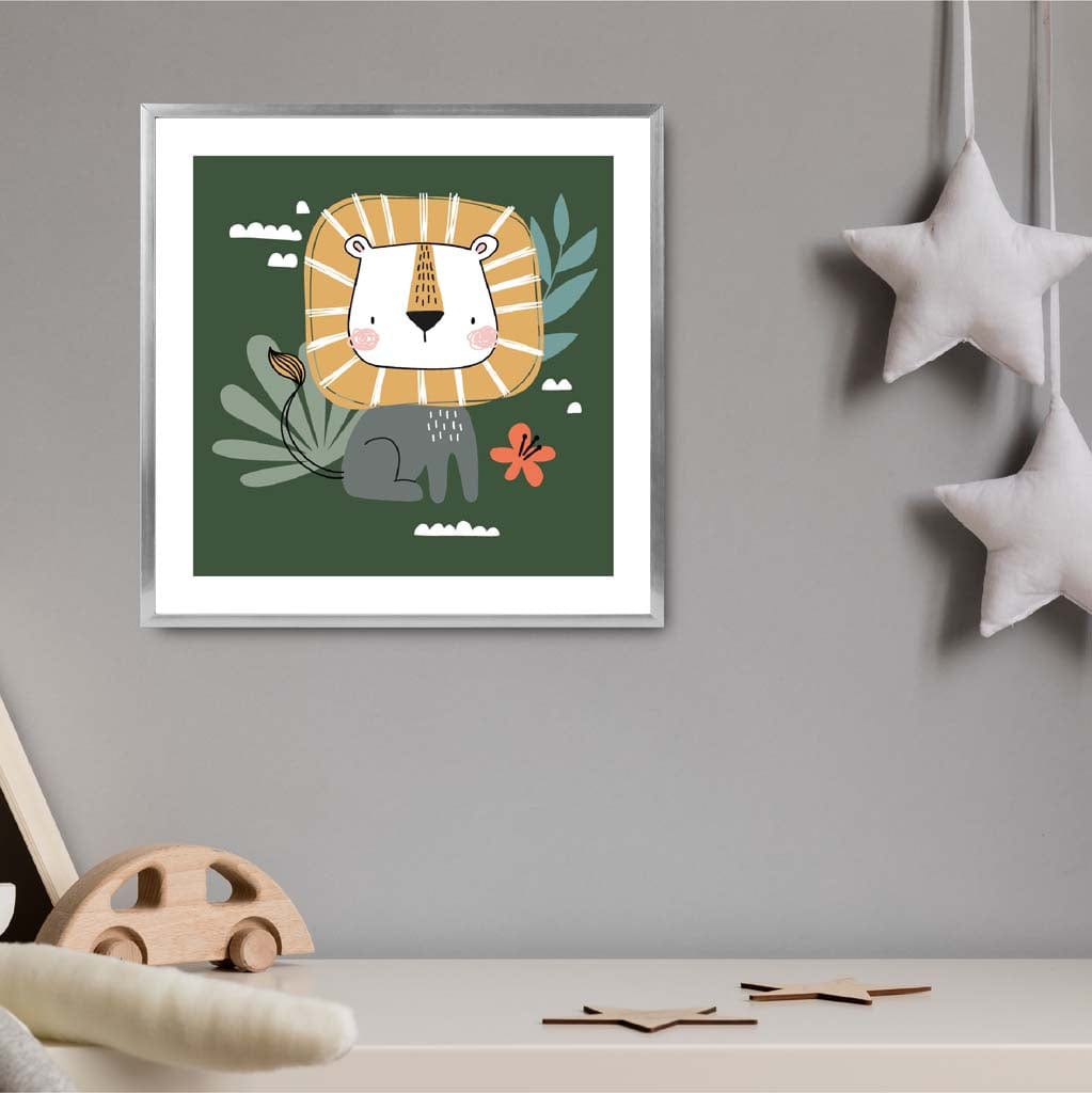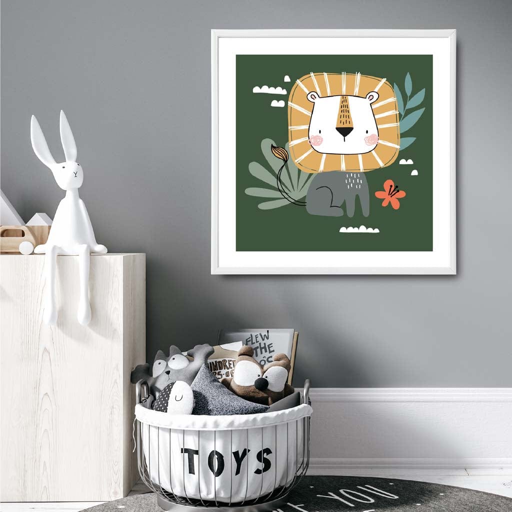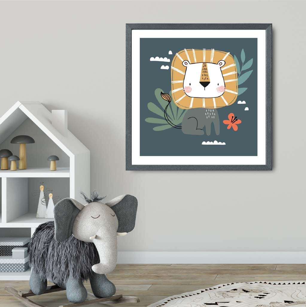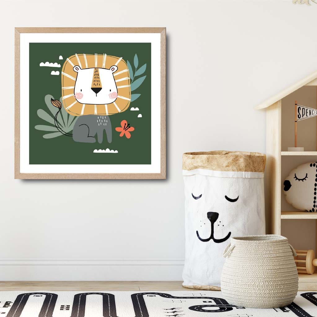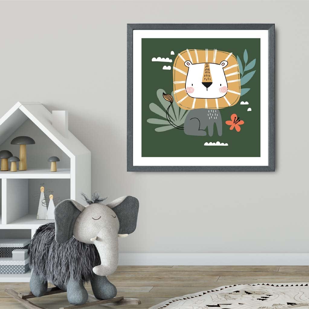 Cute Lion FRAMED Print on Dark Green Jungle Kids Wall Art