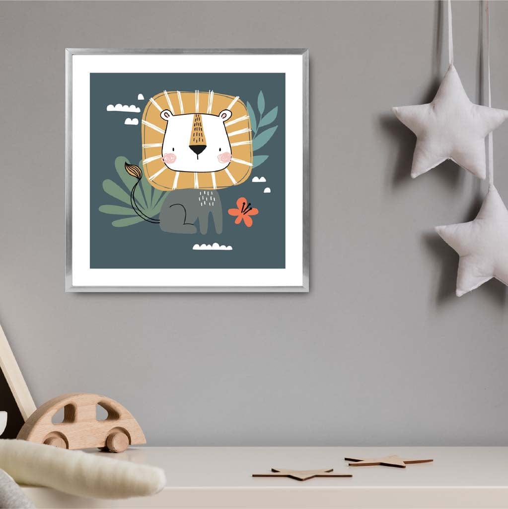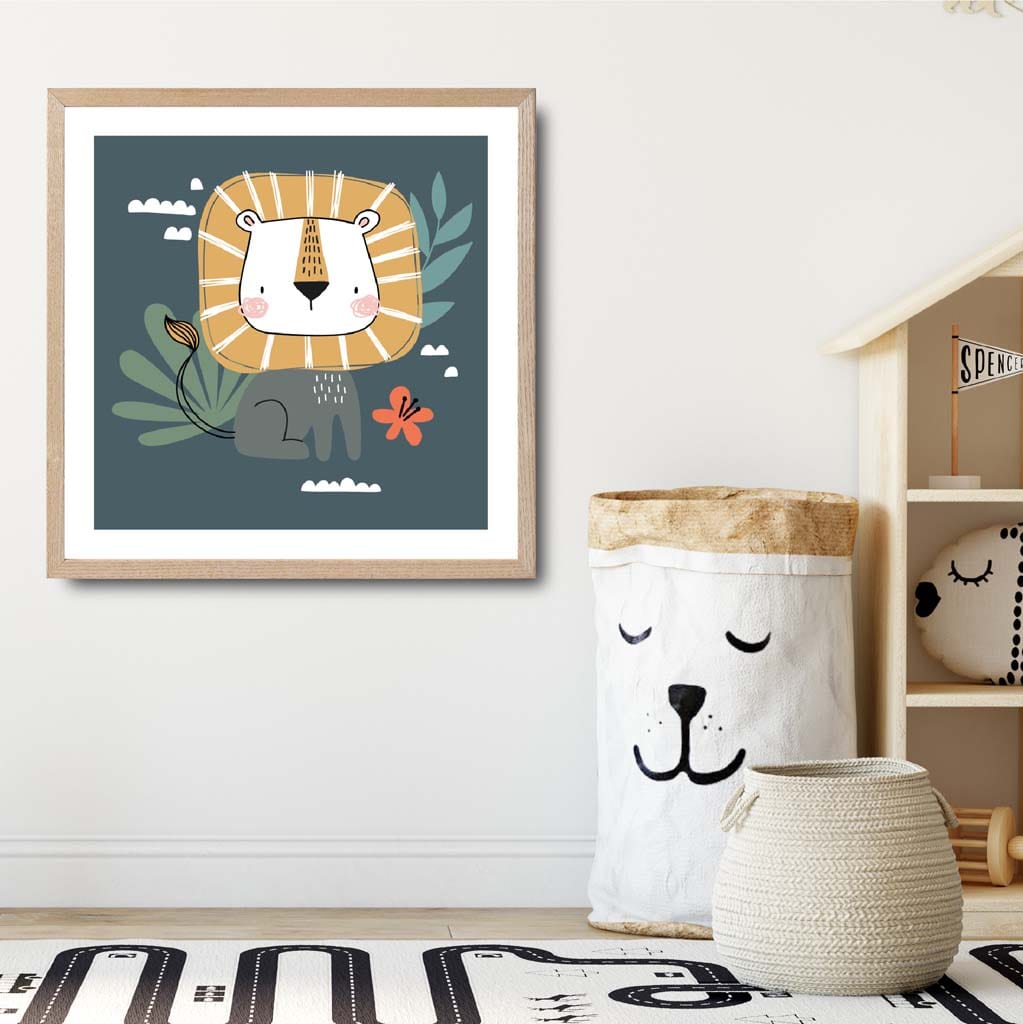 Cute Lion FRAMED Print on Teal Blue Jungle Kids Wall Art
