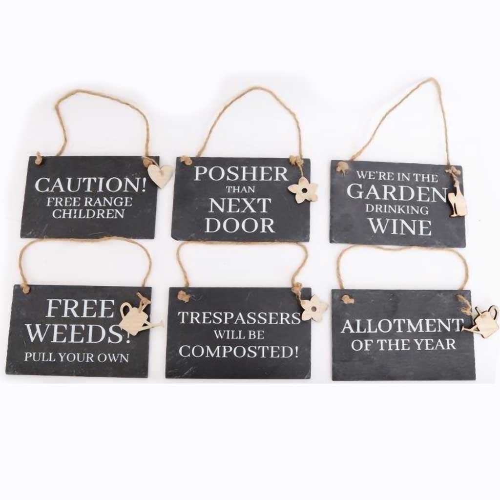 Perfect for dotting around any garden or allotment, this mix of slate plaques each features its own bold text decal and added wooden charm