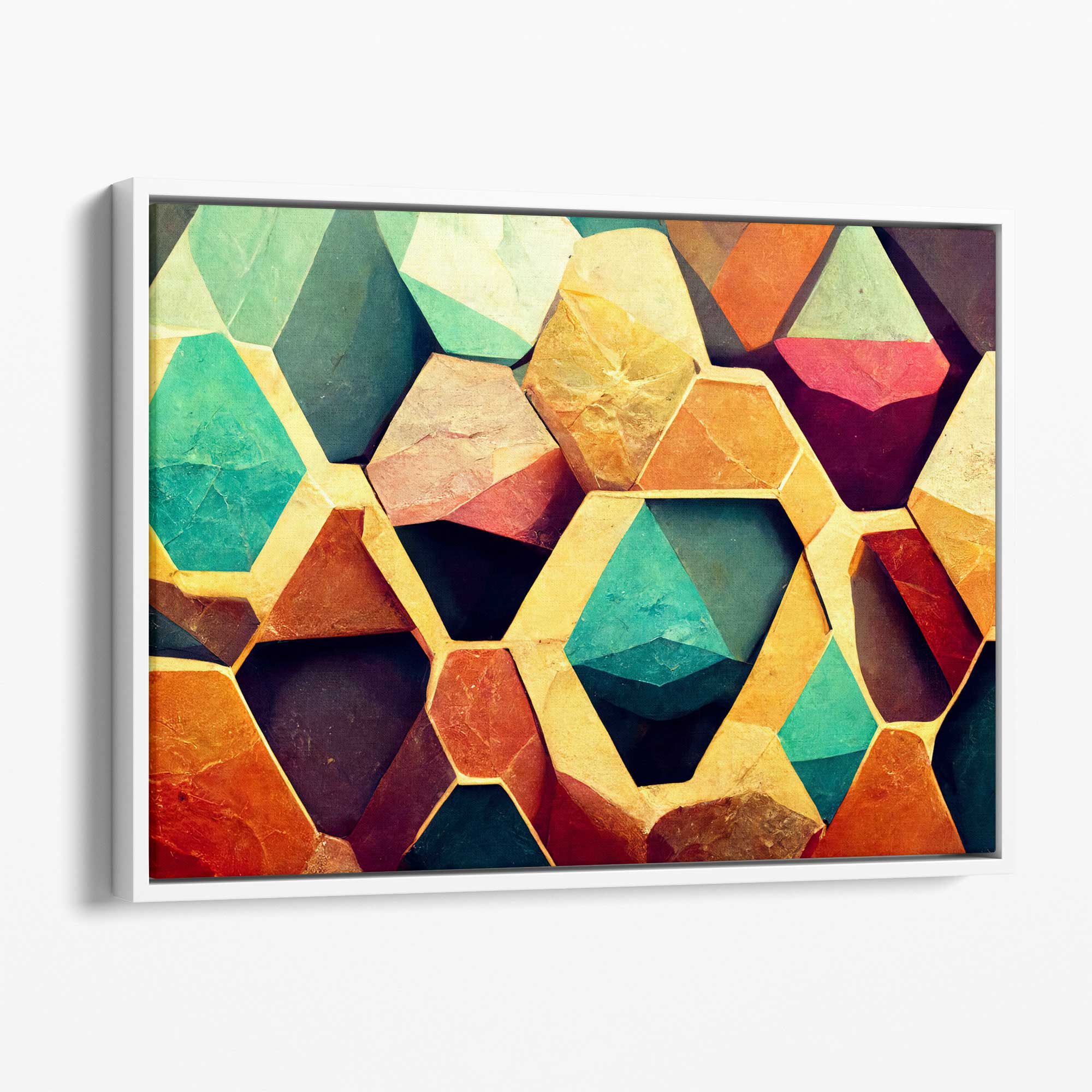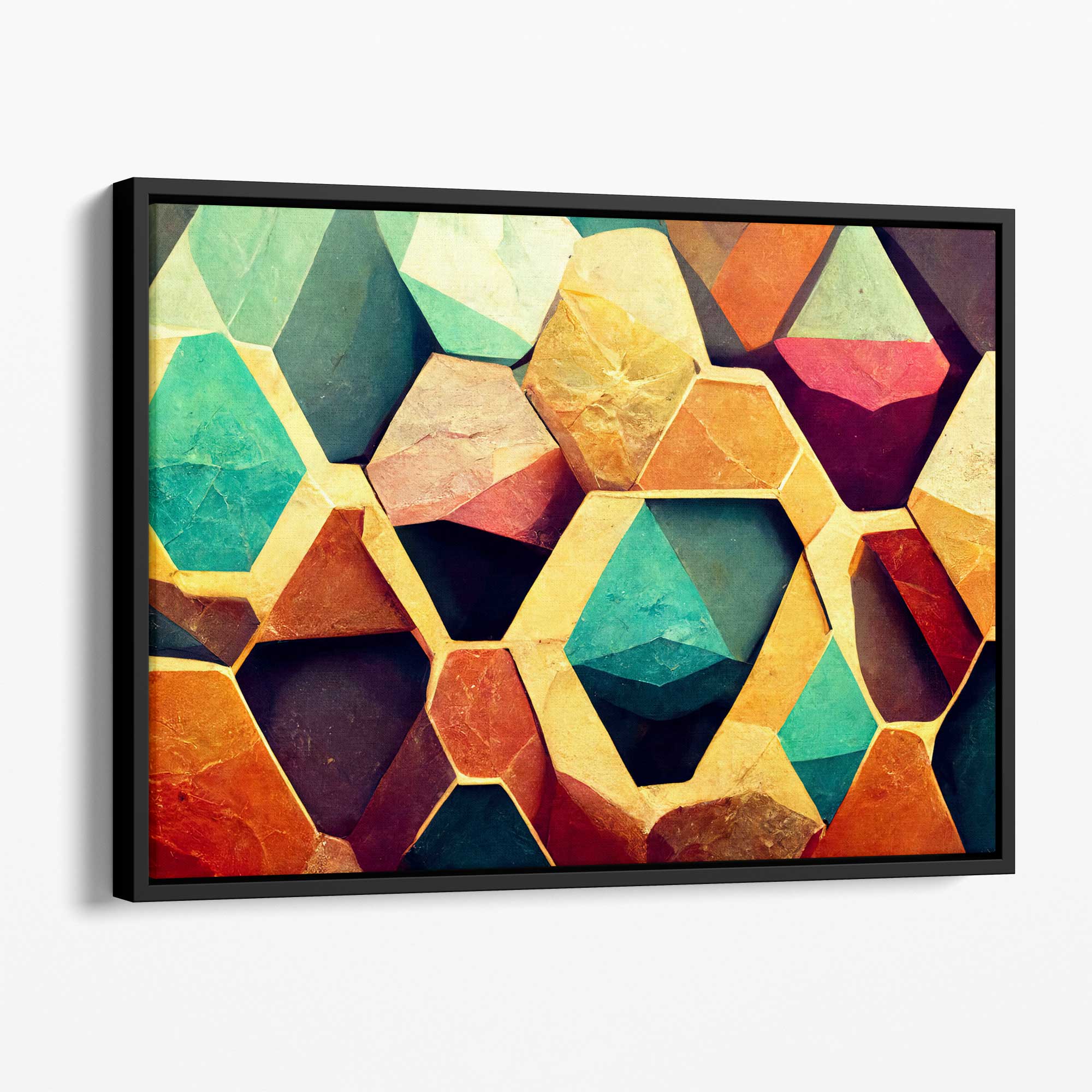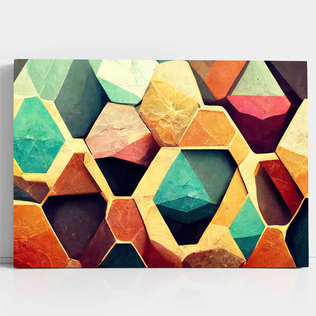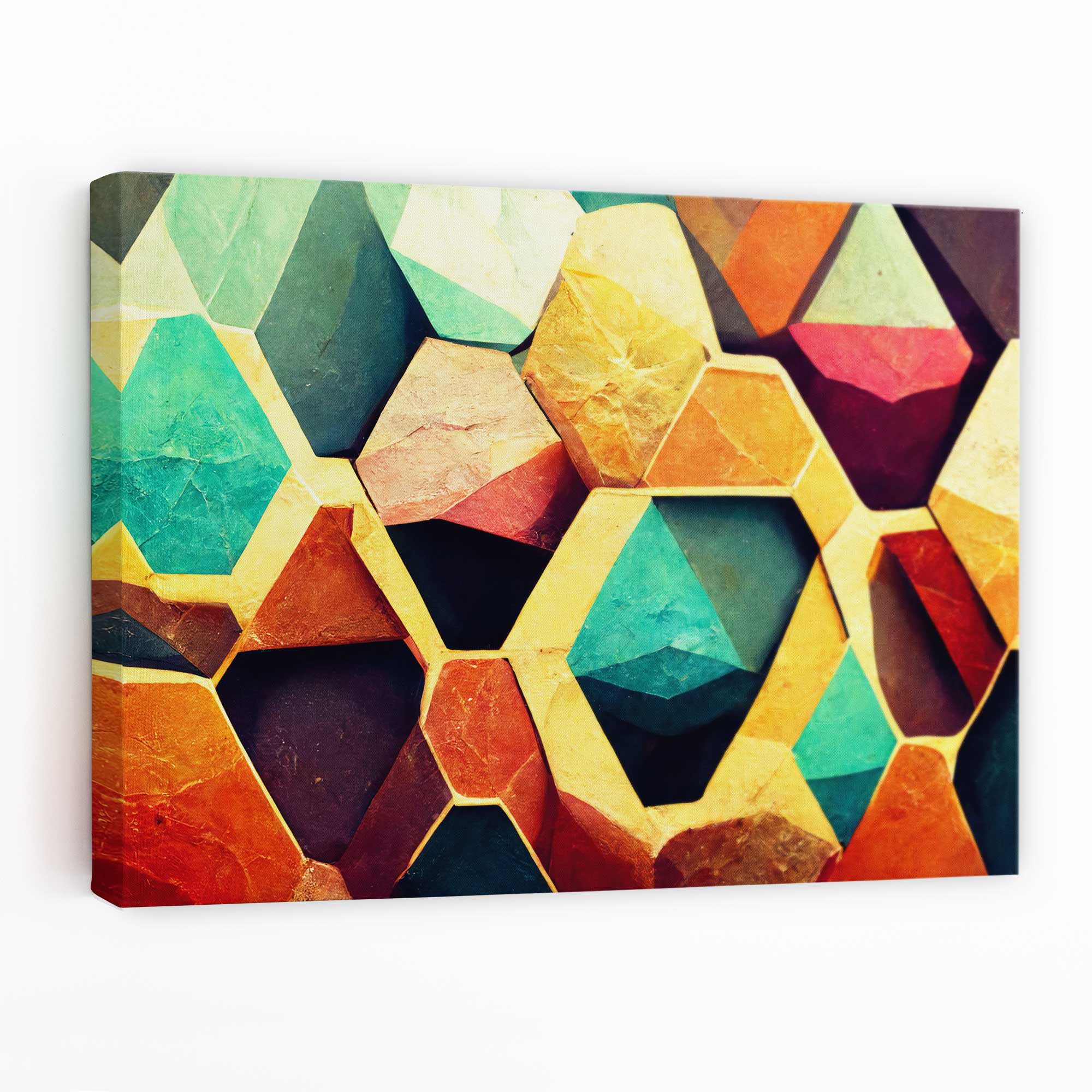 Part of our Abstract Collection, this Canvas Wall Art features an Impressionist Oil painting of Geometric Hexagons in shades of Green, Yellow and Orange.