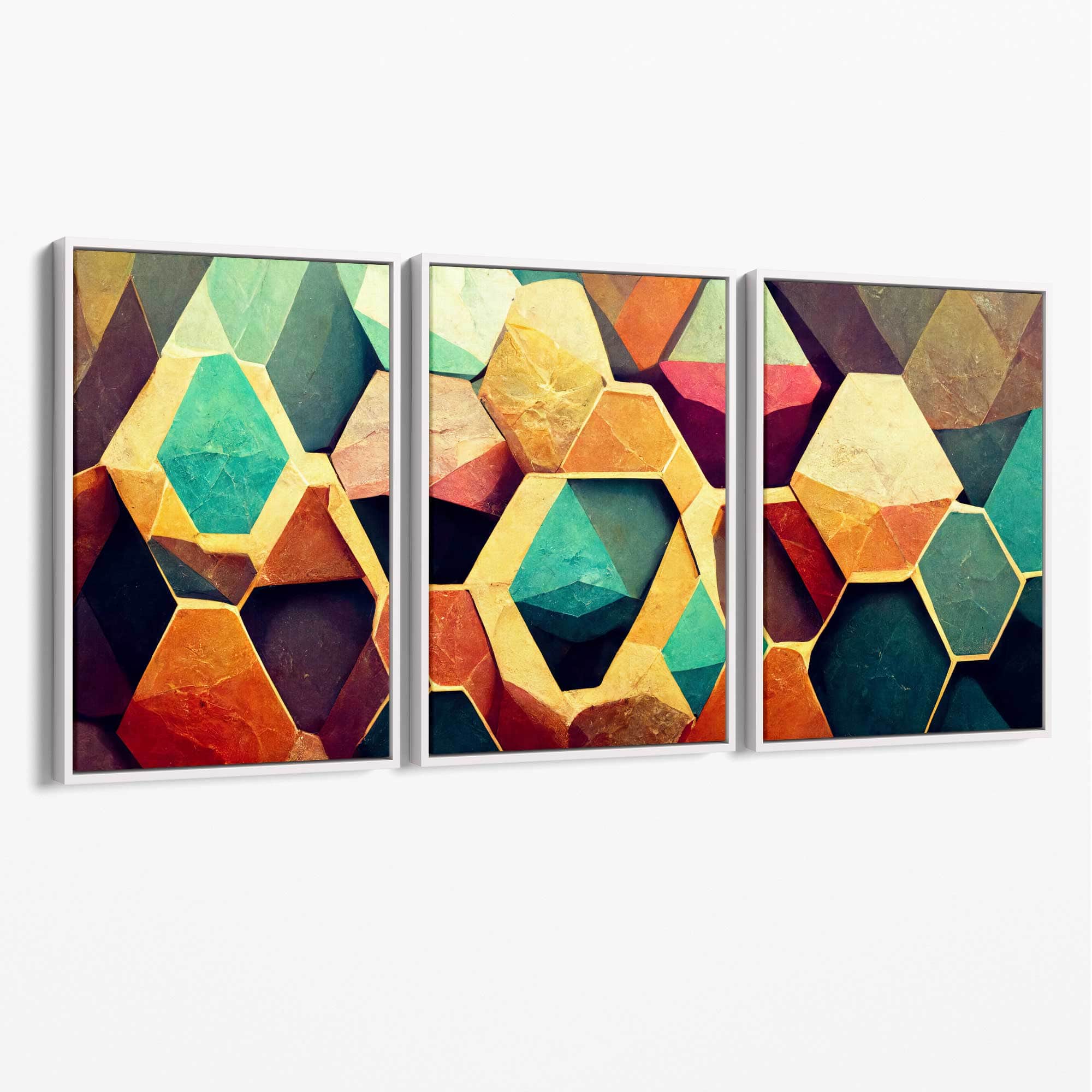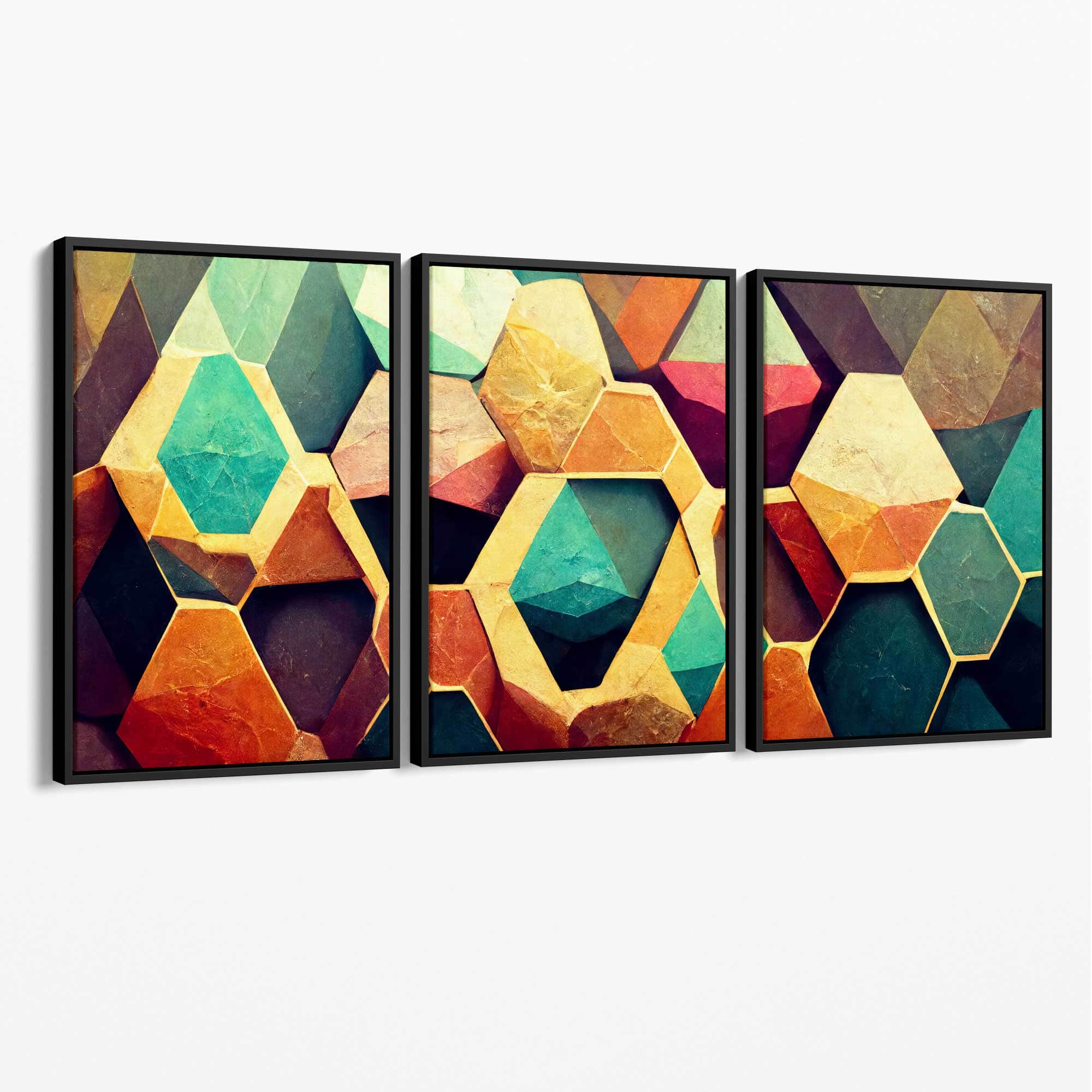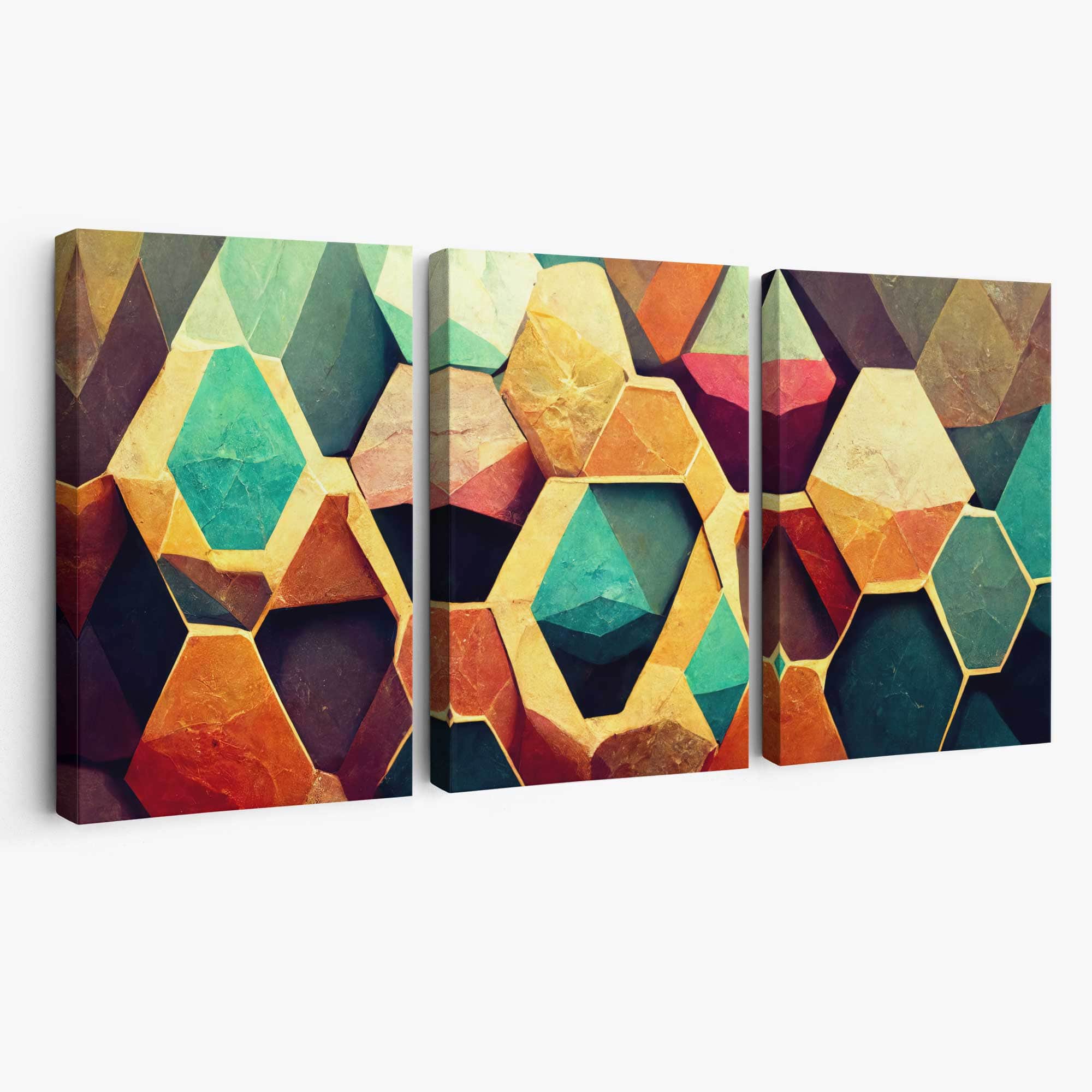Part of our Abstract Triptych Collection, this Set of 3 Wall Art features 3 panels from an Impressionist Oil painting of Geometric Hexagons in shades of Green, Yellow and Orange.