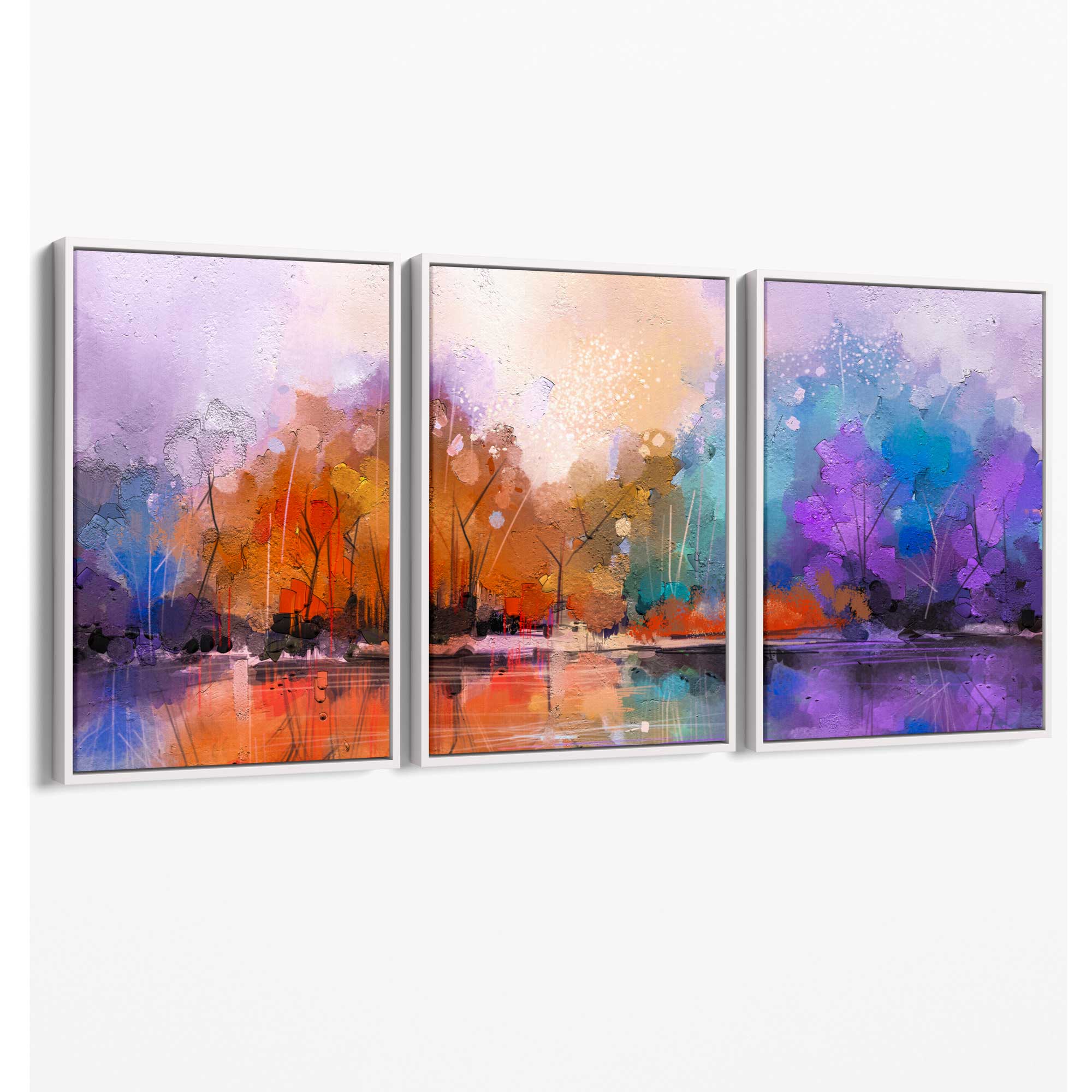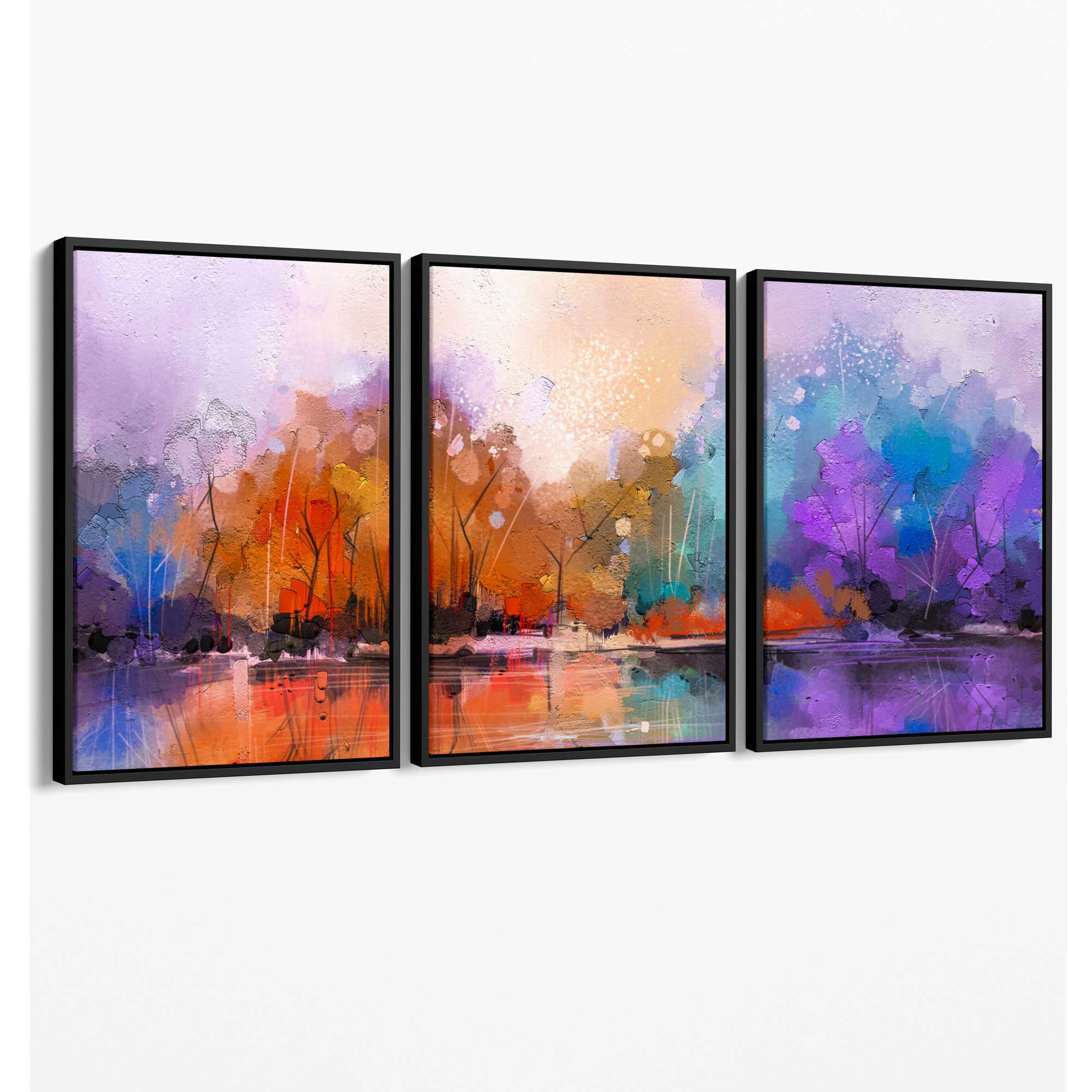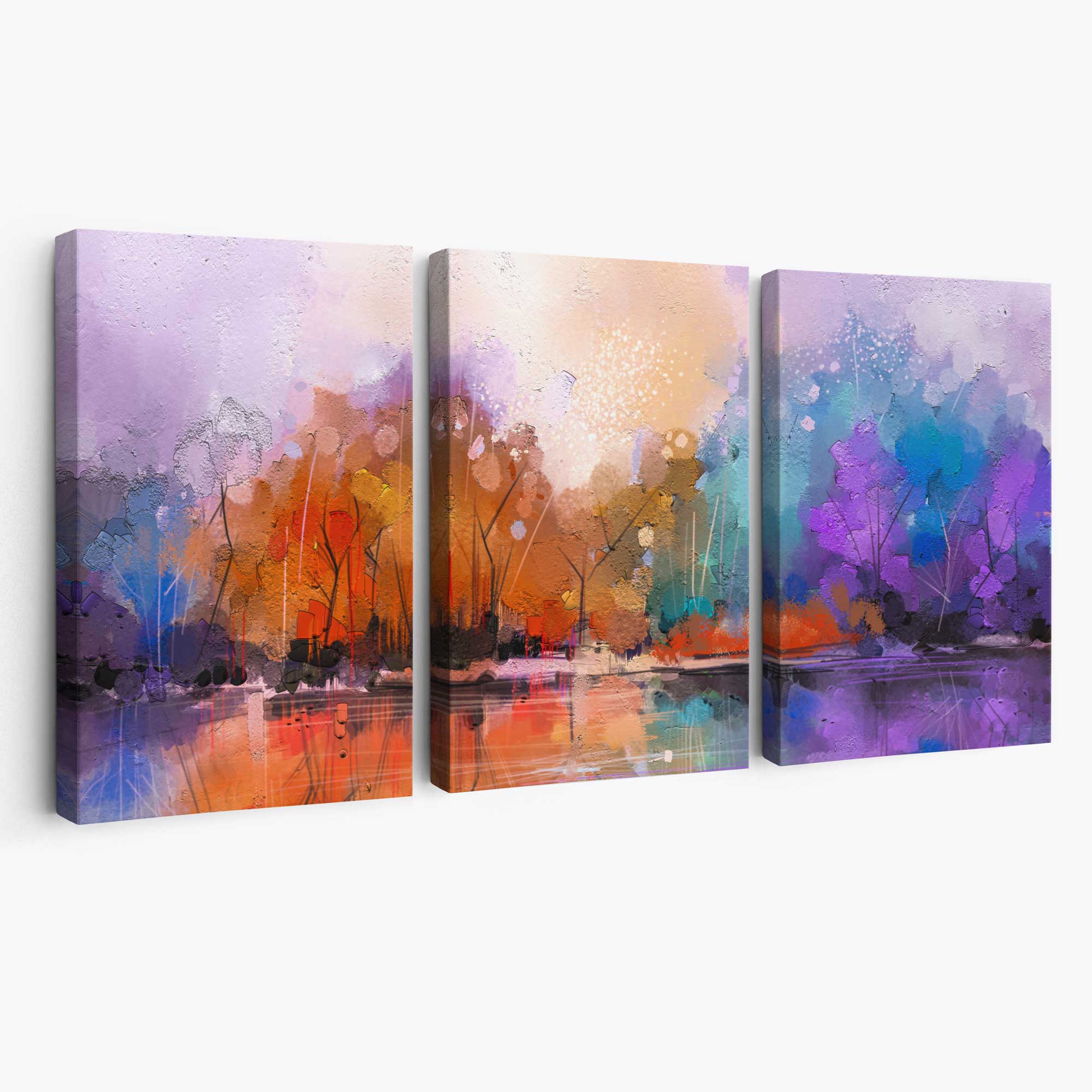 Part of our Abstract Triptych Collection, this Set of 3 Wall Art feature three panels from an original mixed media of a Forest Lake Sunrise painting titled " Violet Dawn" in shades of Violet, Purple and Orange