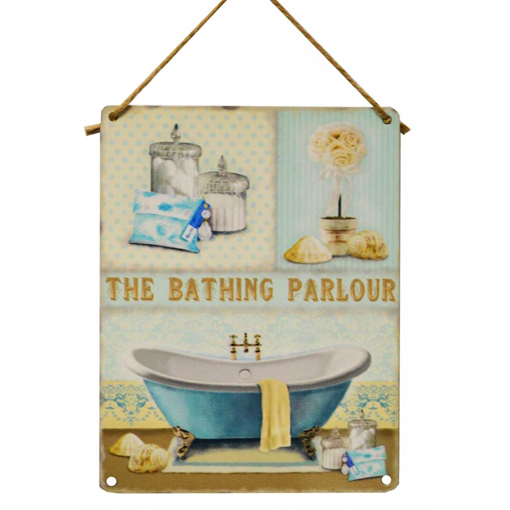 A beautifully vintage inspired metal sign with a scripted text and bathroom illustrations.