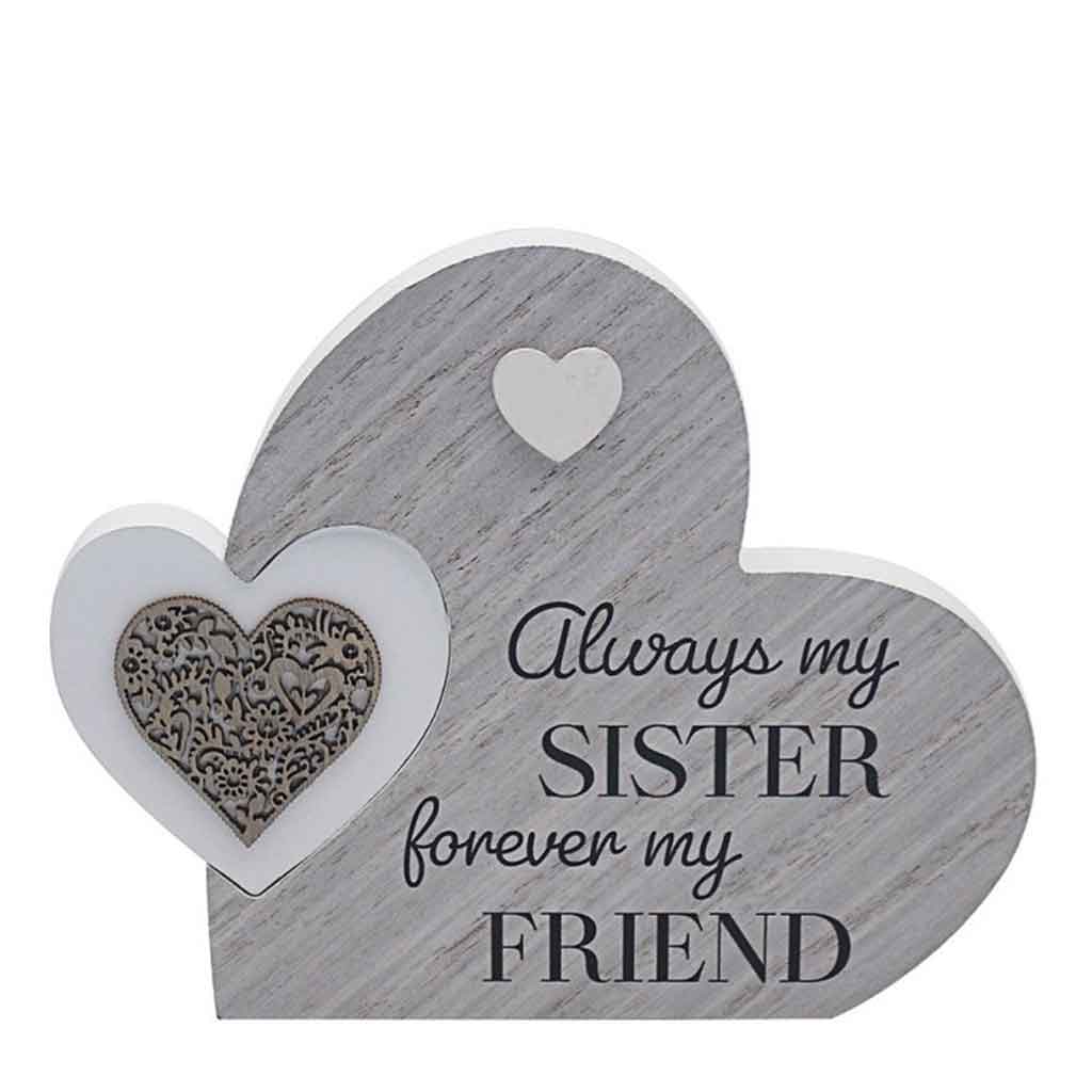 A heart shaped plaque with double heart design and "always my sister forever my friend" message.
