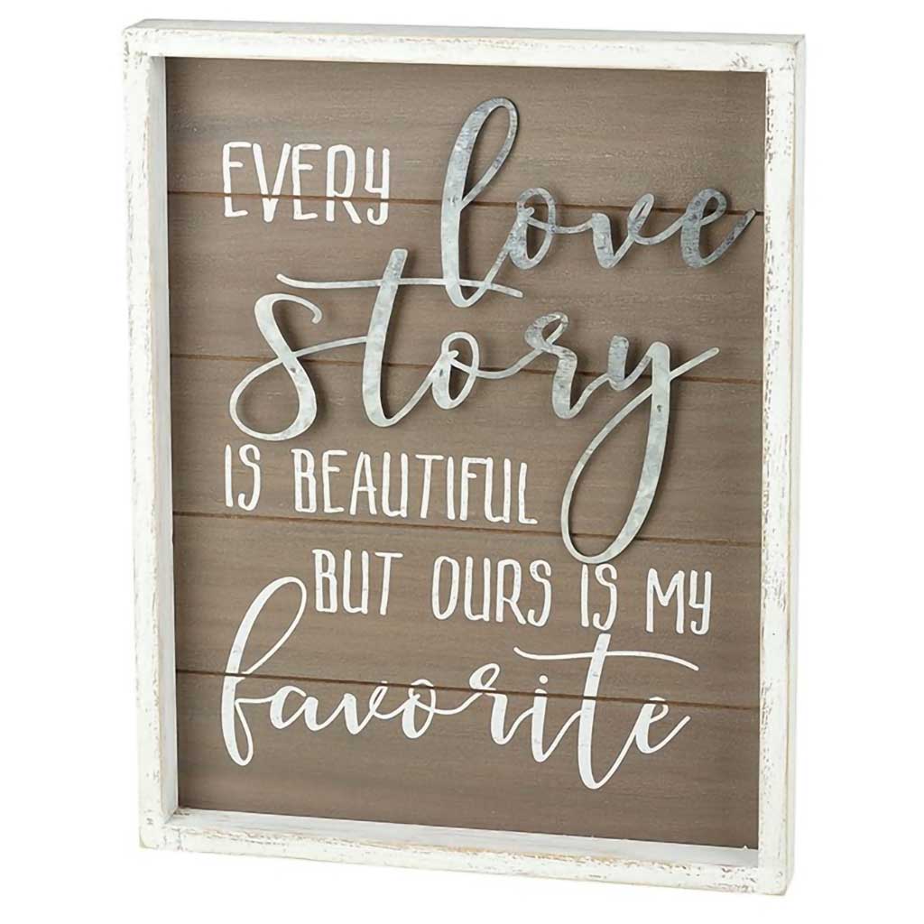 A beautifully distressed wall plaque with an added rustic metal 'Love Story' feature