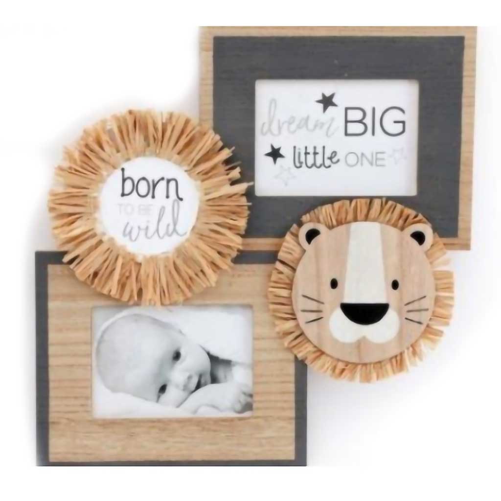 A safari themed double photo frame, featuring neutral and grey colourways with a lion design. Complete with tasseled details and sweet quotes.