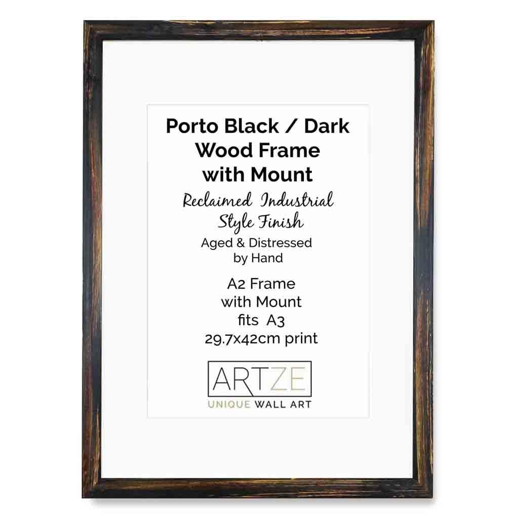 Porto Black & Dark Wood Reclaimed Industrial Style Finish, fits, A2, Frame with soft white Mount fits, A3, Print