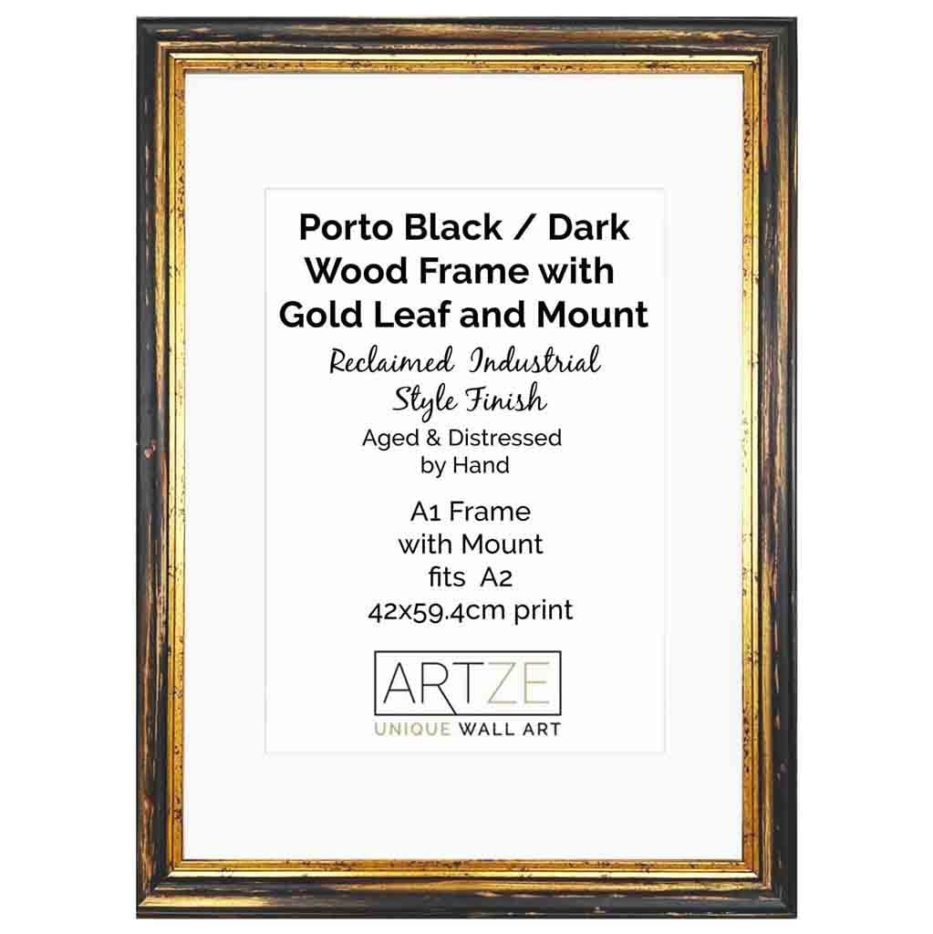 Porto Black & Dark Wood with Gold Leaf Reclaimed Industrial Style Finish A1 Frame with Soft White Mount, fits A2 Print.